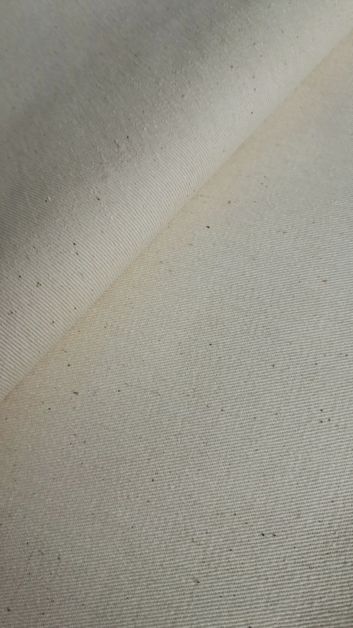 Високоякісна бавовняна тканина світло-бежевого кольору з міцним діагональним переплетенням, що створює рубчиковий візерунок. Ідеальна для пошиття одягу та предметів інтер’єру, що потребують структурності та довговічності.