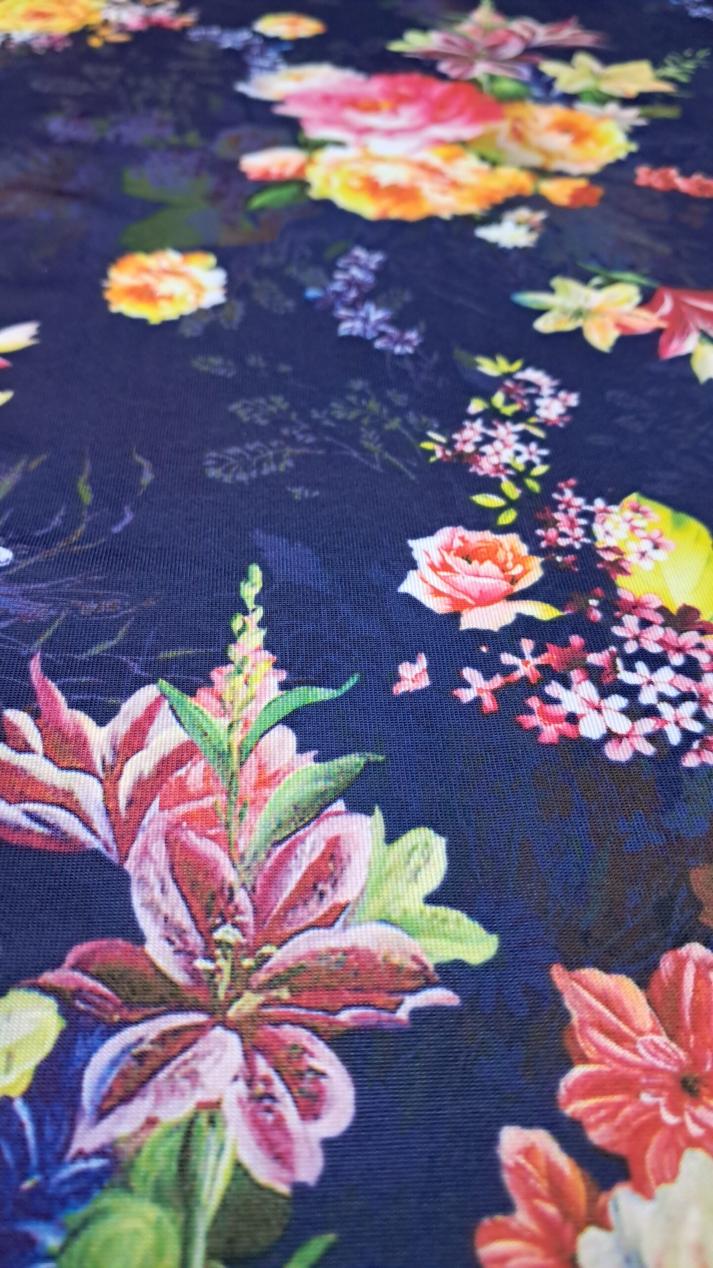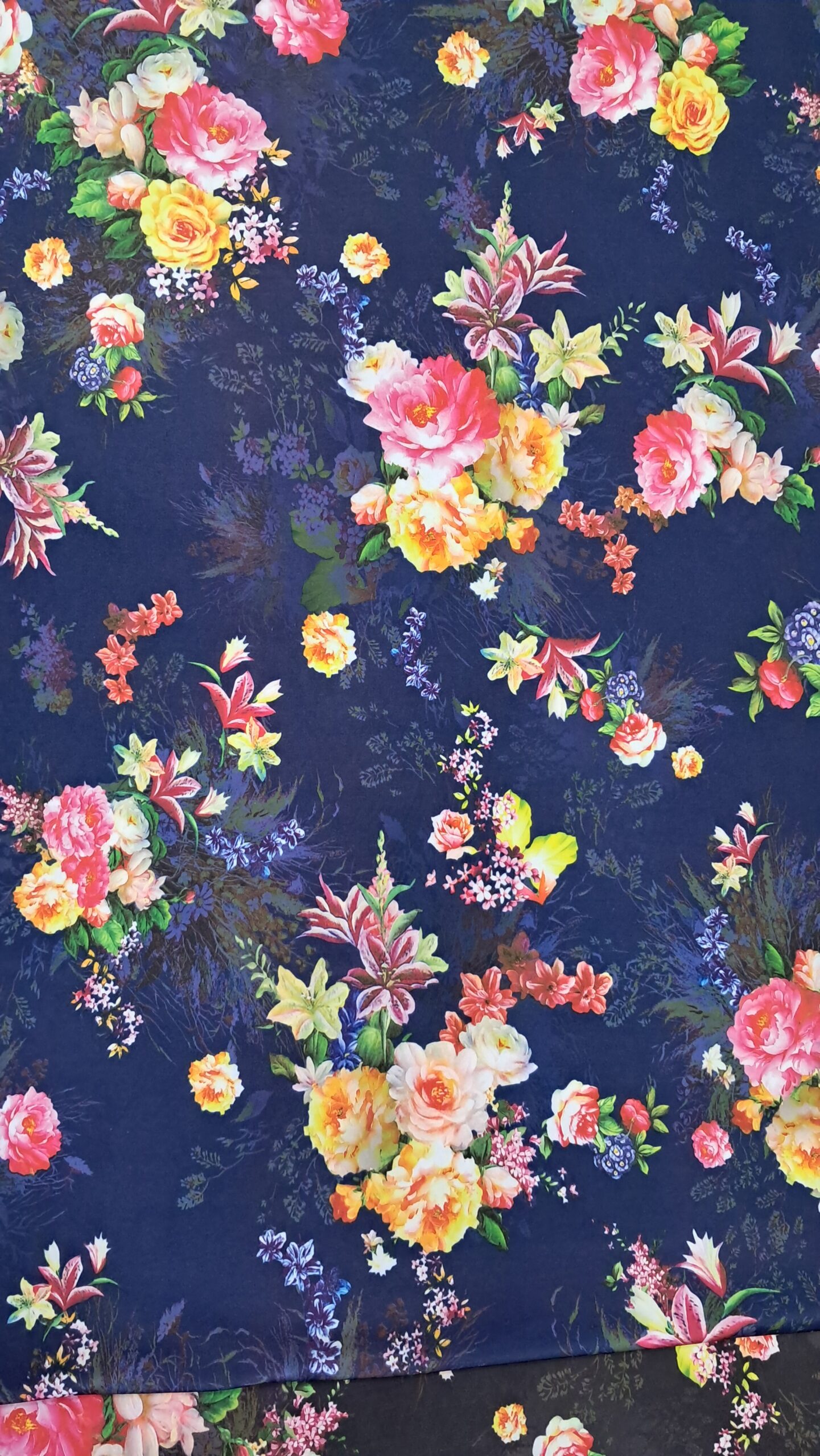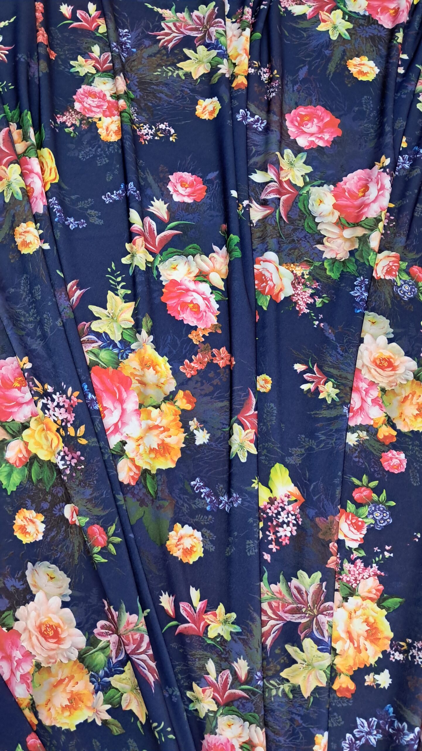 Надзвичайно приємна, м’яка і еластична тканина біфлекс, яка ідеально підходить для створення комфортного та стильного одягу. Виробництва Італії, ця тканина поєднує в собі високу якість і неперевершений дизайн. На темно-синьому фоні розсипані яскраві, різнокольорові квіти, що створюють ефектний і привабливий квітковий букет. Тканина чудово драпірується, має стійкі кольори і приємна на дотик, що робить її універсальною для різноманітних виробів. Вона може використовуватися для пошиття як повсякденного, так і святкового одягу.