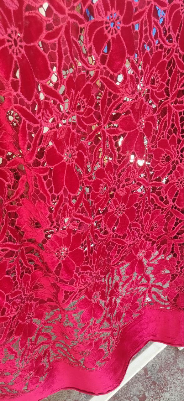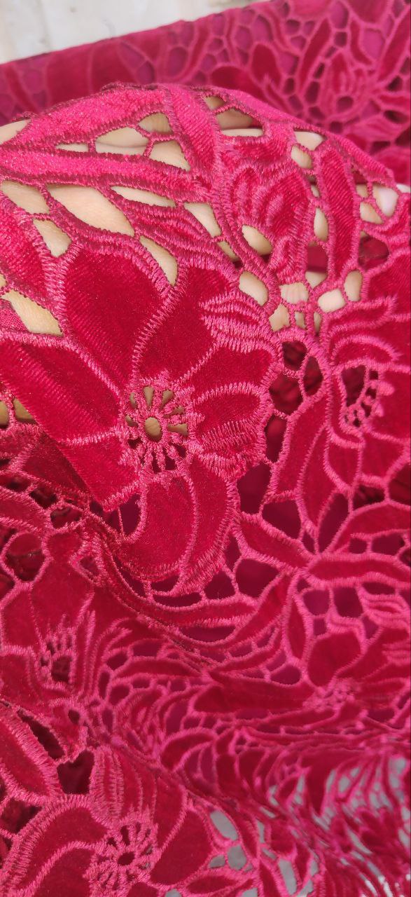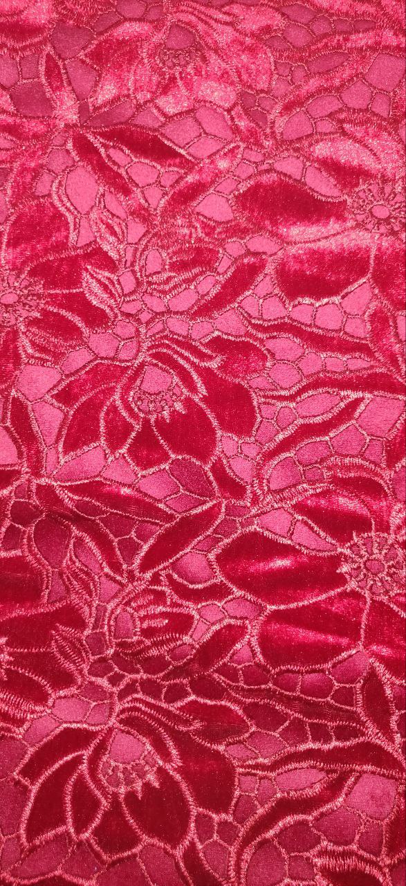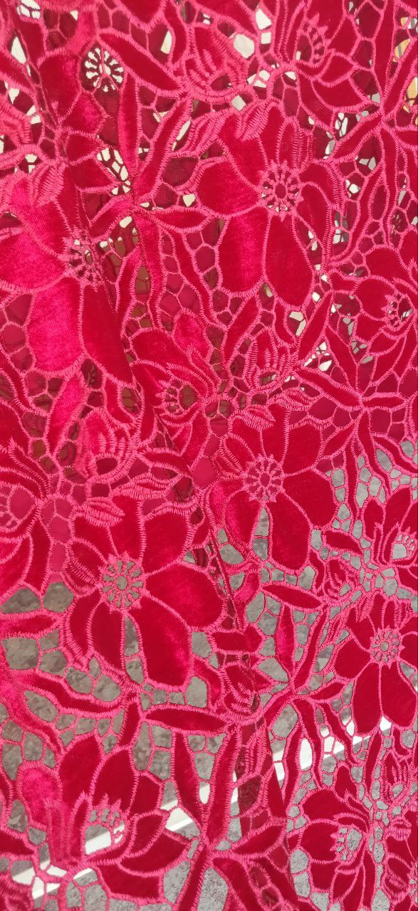 Ця вишукана тканина є високоякісним велюром, оздобленим елегантною вишивкою. М’яка, приємна на дотик поверхня велюру чудово поєднується з рельєфним візерунком, що створює неповторний, об’ємний ефект. Вишивка у формі квітів із фігурними вирізами додає матеріалу легкості та витонченості, перетворюючи його на ідеальний вибір для особливих випадків. Ця тканина вирізняється не лише естетичним виглядом, а й високою зносостійкістю, що робить її практичним і довговічним рішенням.