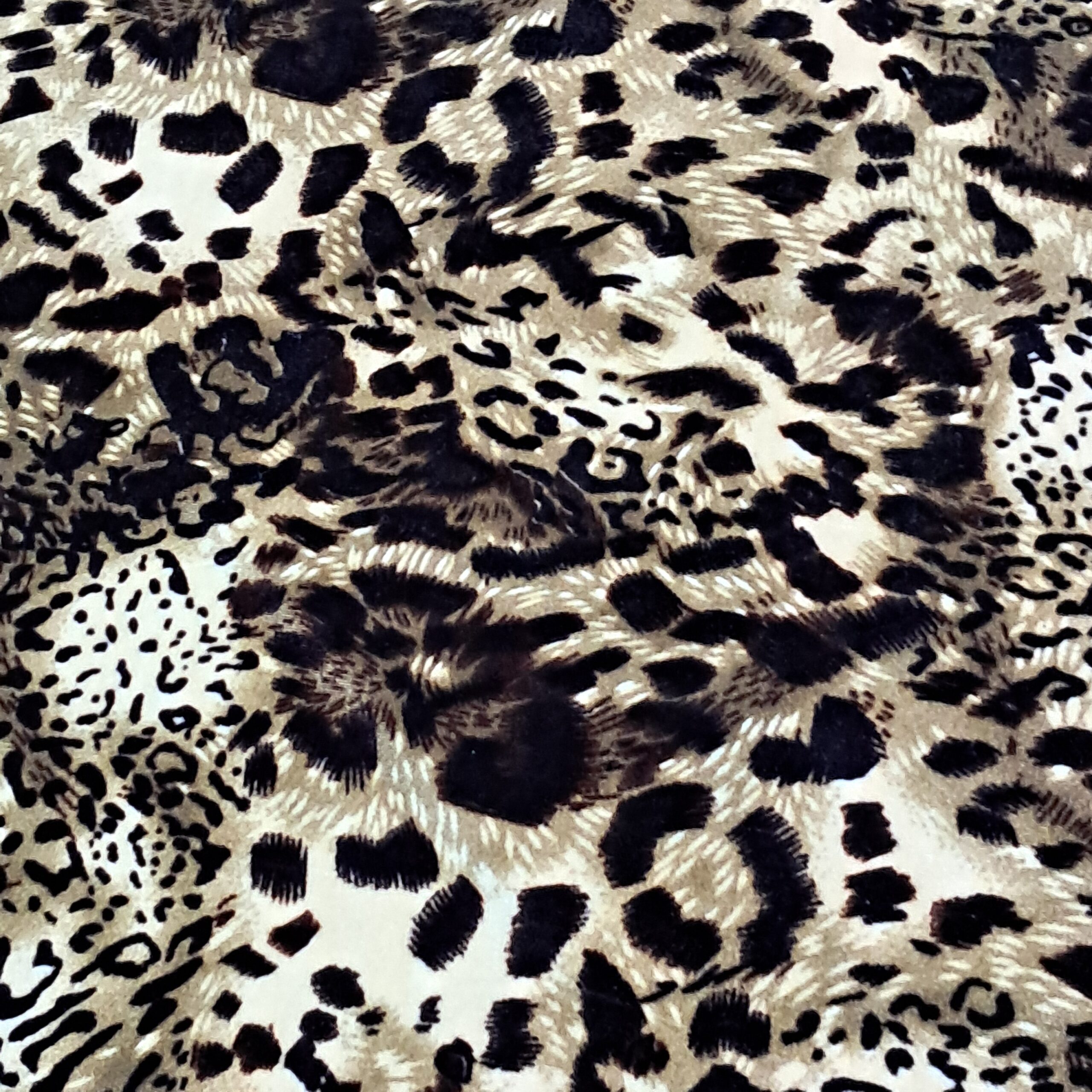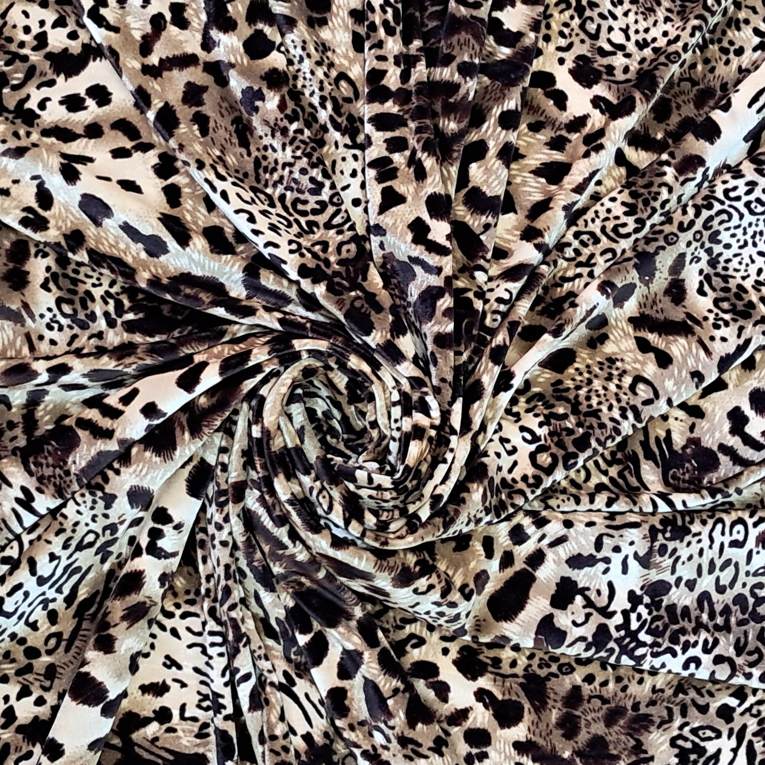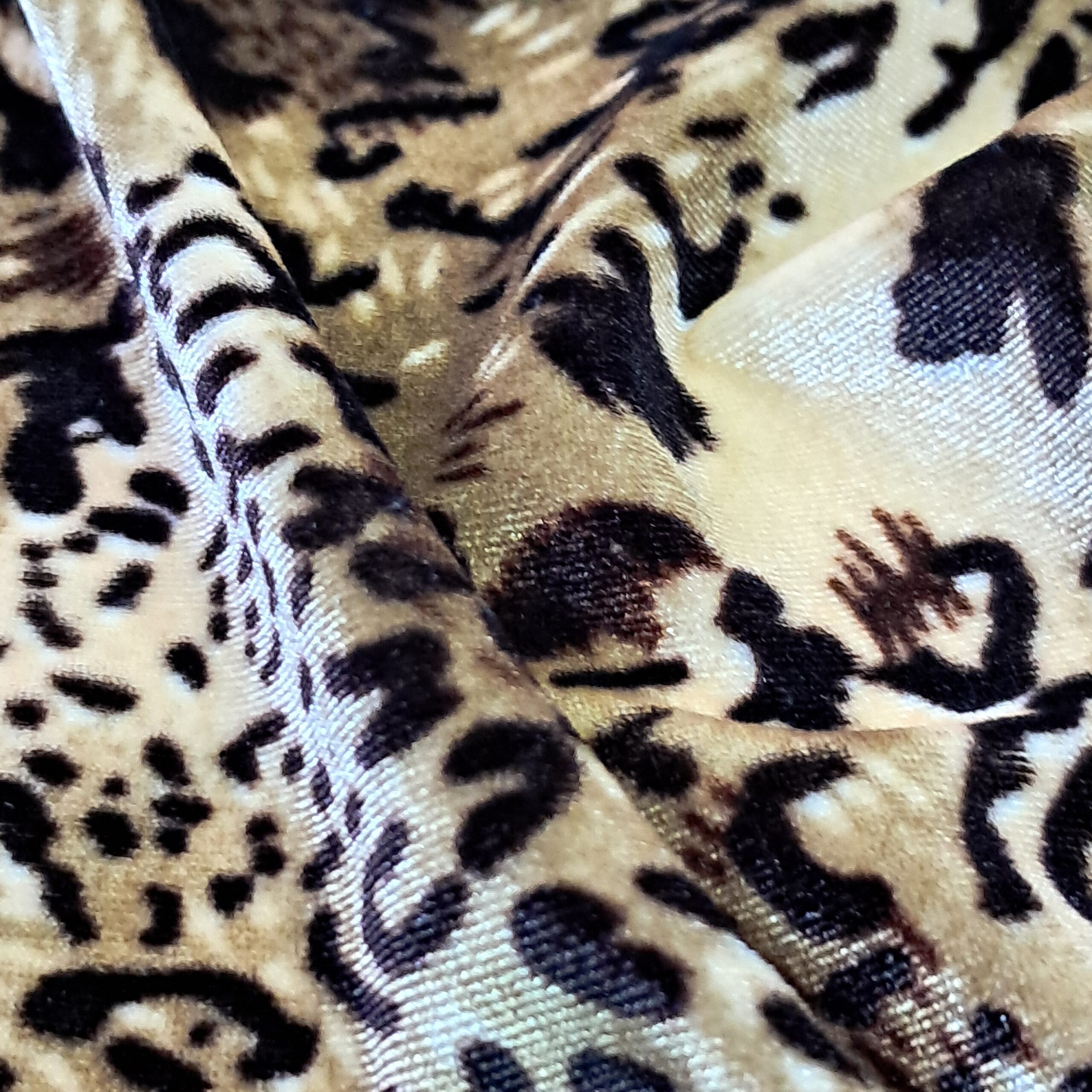 Велюр “леопард” – це велюрова тканина з характерним візерунком, що імітує хутро леопарда. Ця тканина вирізняється м’якістю, оксамитовою поверхнею та яскравим, сміливим дизайном. Вона може бути використана для пошиття одягу (суконь, спідниць, жакетів), домашнього текстилю (подушок, пледів) та оббивки меблів, додаючи інтер’єру або образу нотку розкоші та екзотики.