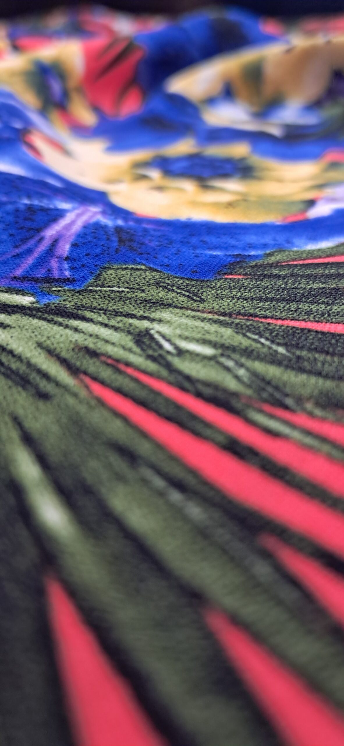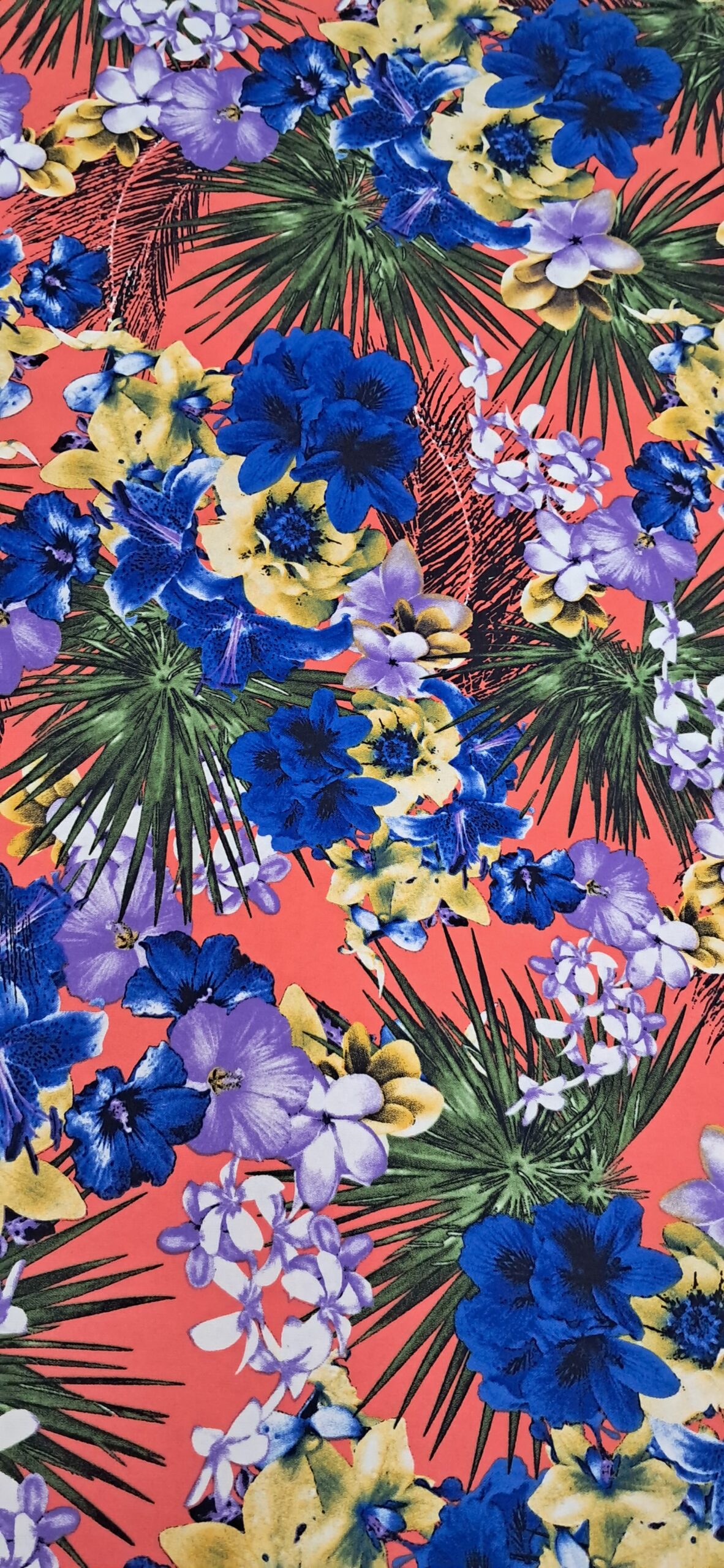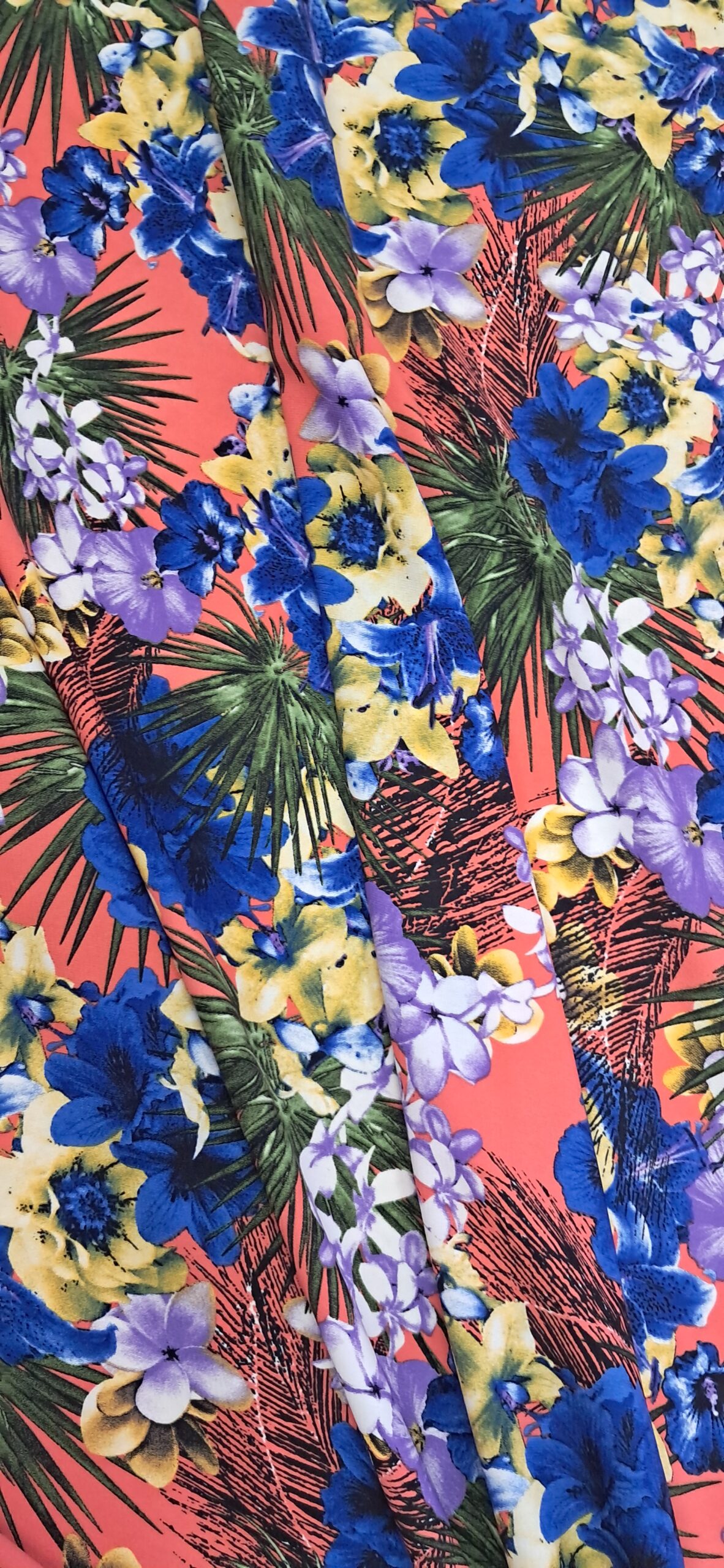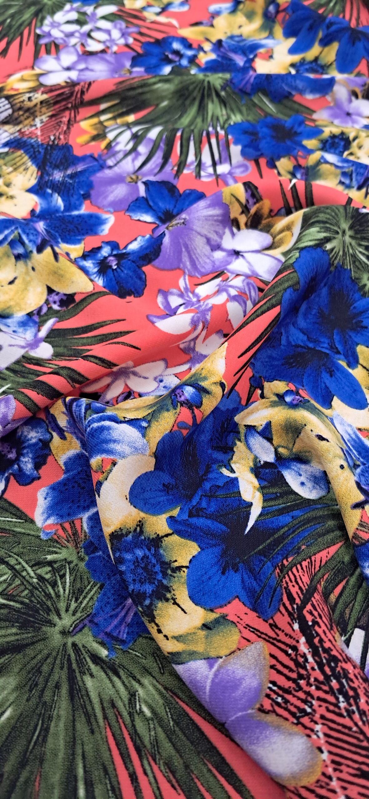 Дизайн виконаний на кораловій основі, яка слугує яскравим і соковитим фоном. На ньому розцвітає пишний тропічний малюнок: великі, виразні квіти синього, фіолетового, жовтого та білого кольорів чергуються із зеленим пальмовим листям. Цей динамічний та екзотичний принт надає тканині живого та ошатного вигляду, нагадуючи про відпочинок і сонячні дні.