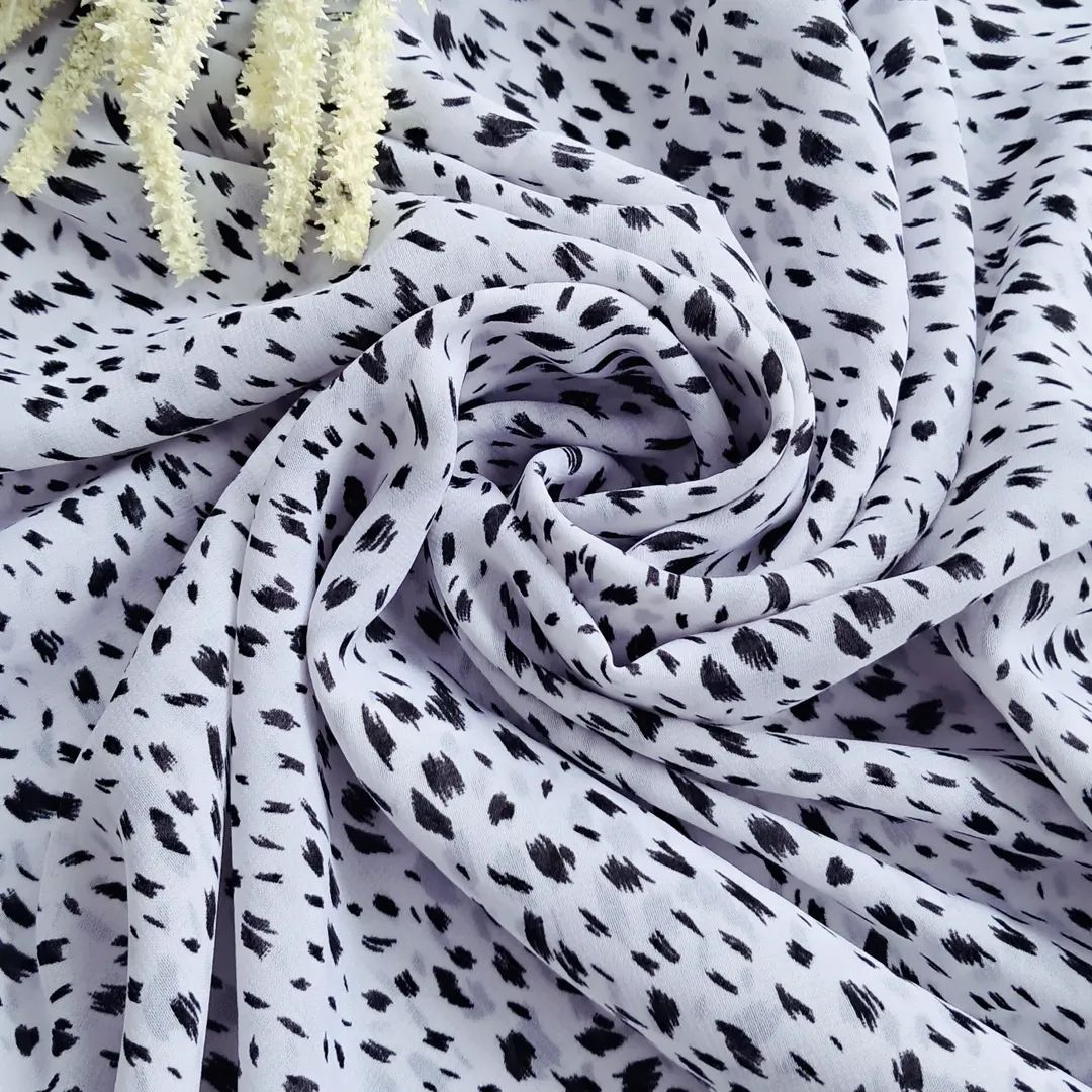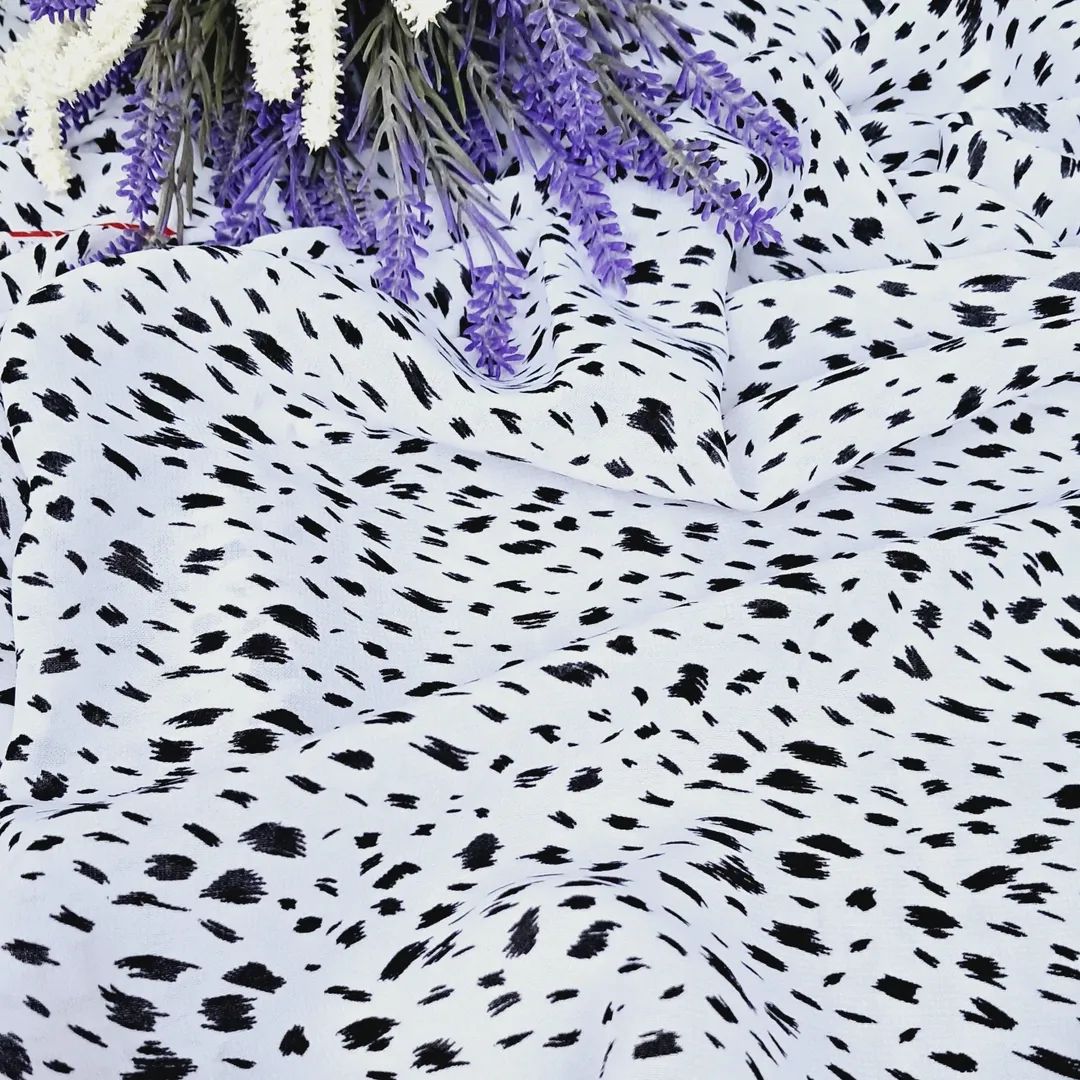 Основний колір — чистий білий, який служить фоном для дуже дрібних, незвичайних цяточок чорного кольору. Ці цяточки не мають чіткої геометричної форми, що надає принту неординарності та сучасного вигляду, імітуючи дорогу ручну роботу. Завдяки високому вмісту натуральних волокон (шовк та віскоза), тканина має винятково гарну драпіруємість, приємна до тіла і створює нарядний, витончений силует. Полотно не просвічується, що дозволяє шити самодостатні вироби без підкладки.