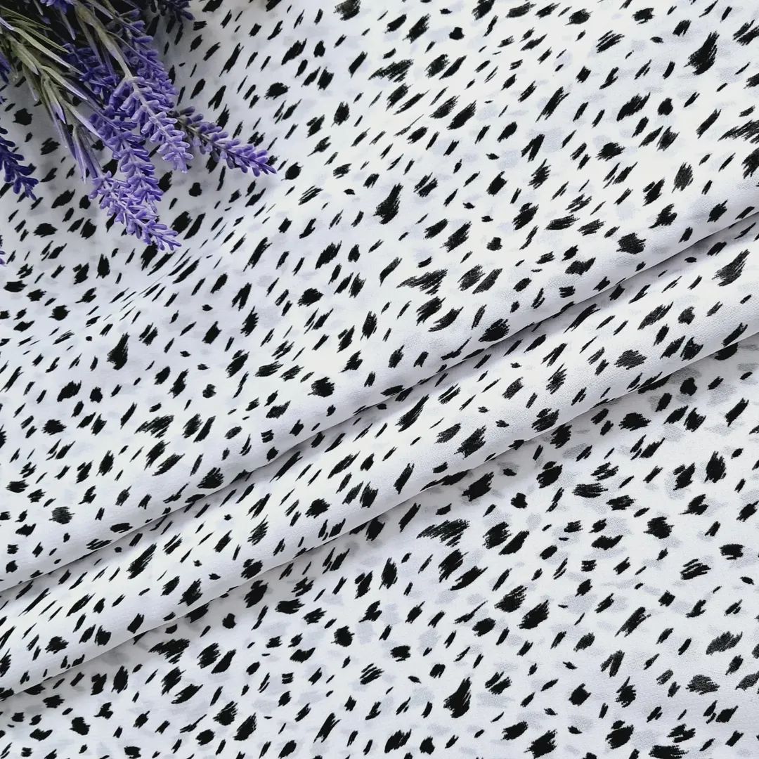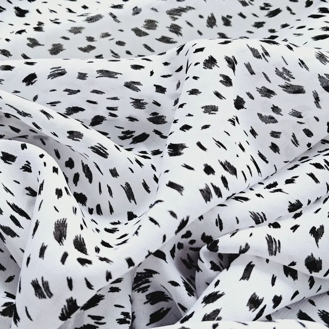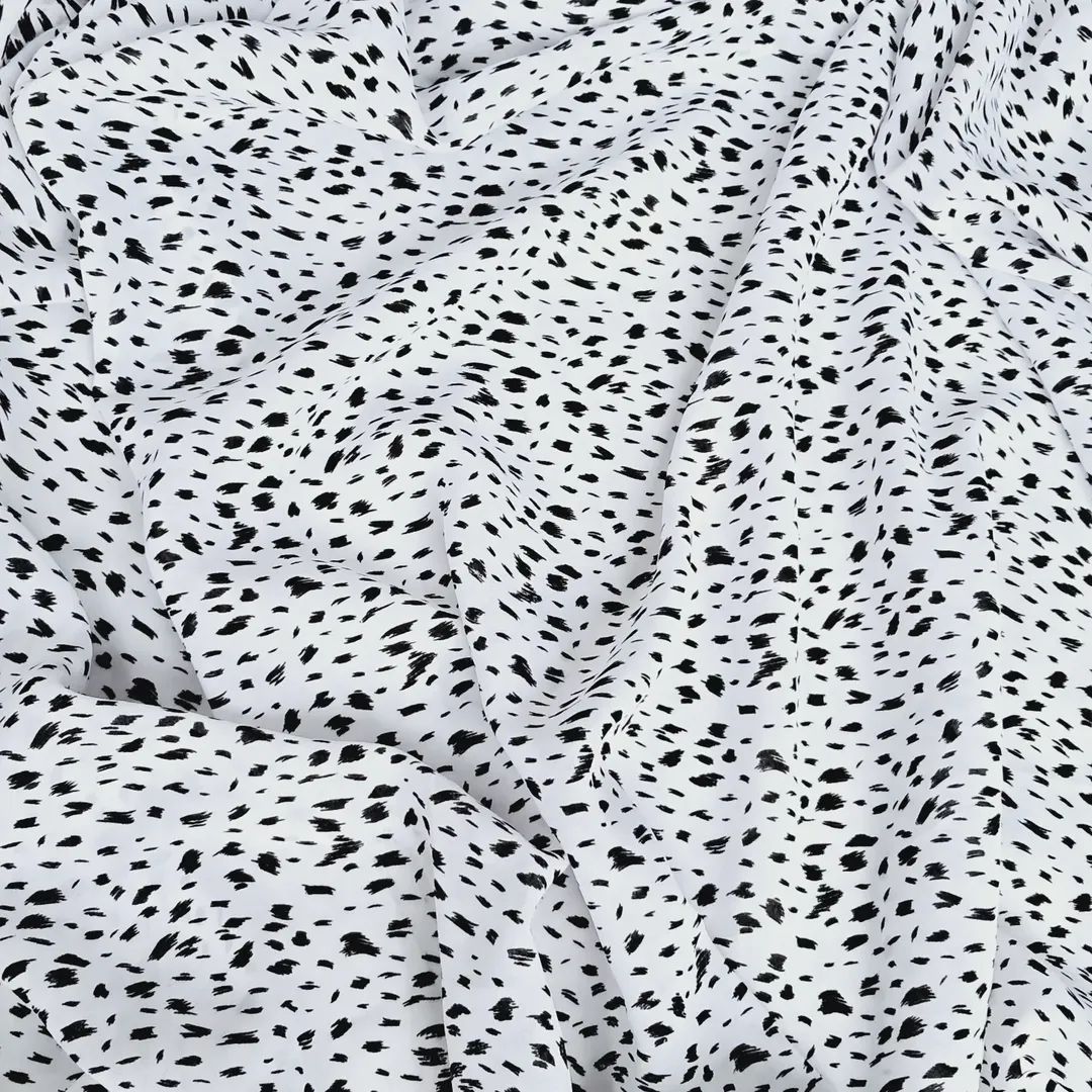 Шовк-Віскоза “Елегантний Пунктир”: Розкішна, непрозора тканина на білому фоні з неординарними чорними цяточками. Комфорт натуральних волокон (шовк + віскоза) ідеально поєднується з елегантною драпіровкою. Класика та вишуканість! м.
