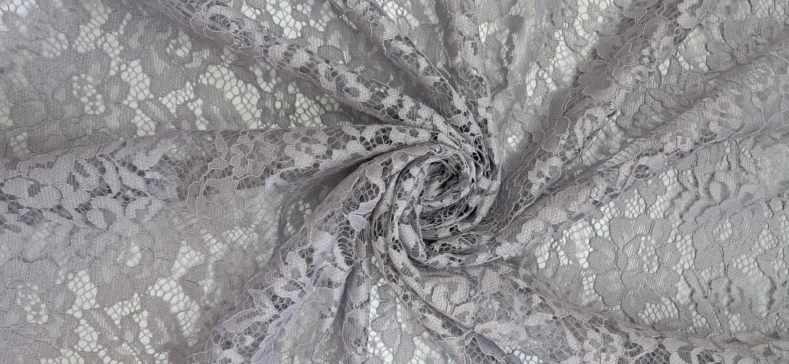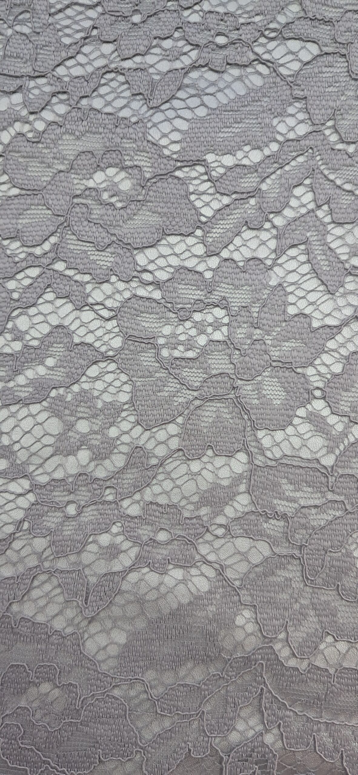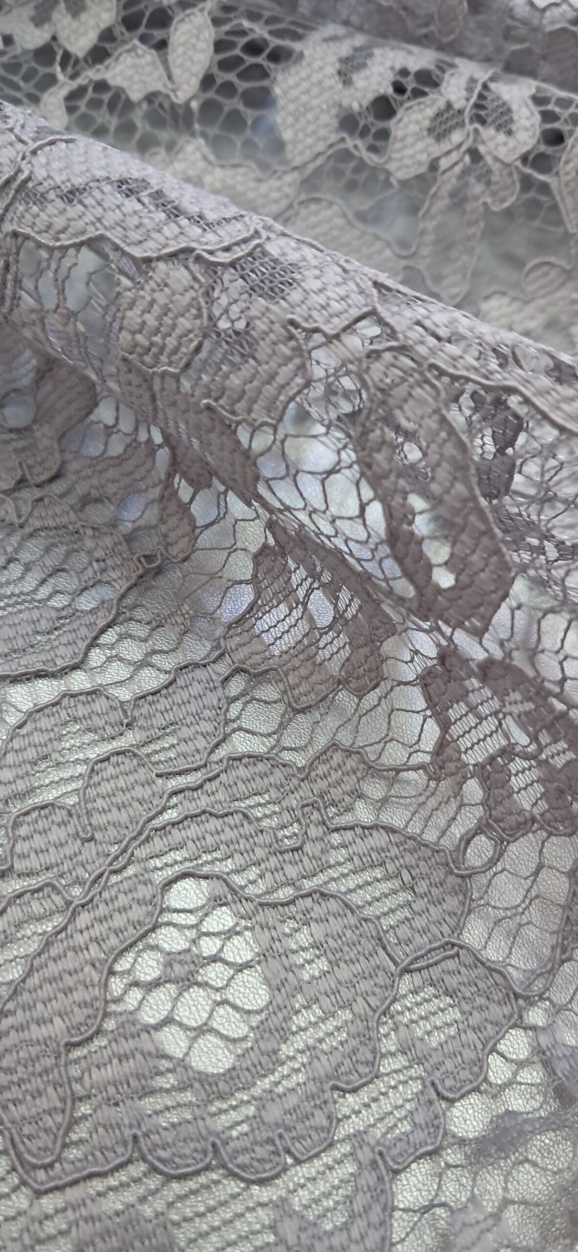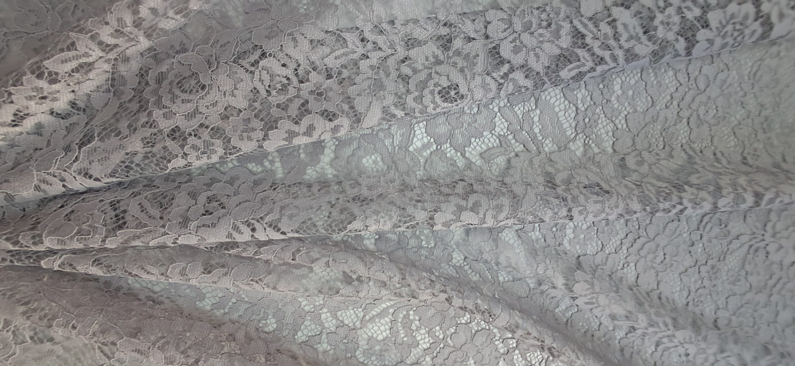 Тканина Гіпюр — це вишукане мереживне полотно, що вирізняється своєю елегантністю та легкістю. Цей гіпюр виконаний у світло-сірому кольорі та має крупновізерунковий малюнок на міцній сітці. Особливістю є використання акордової нитки, що надає рельєфності та об’ємності візерунку, підкреслюючи його витонченість. Тканина не стрейчева, добре тримає форму та є досить міцною, незважаючи на свою делікатність. Це ідеальний матеріал для створення вечірніх та святкових образів.