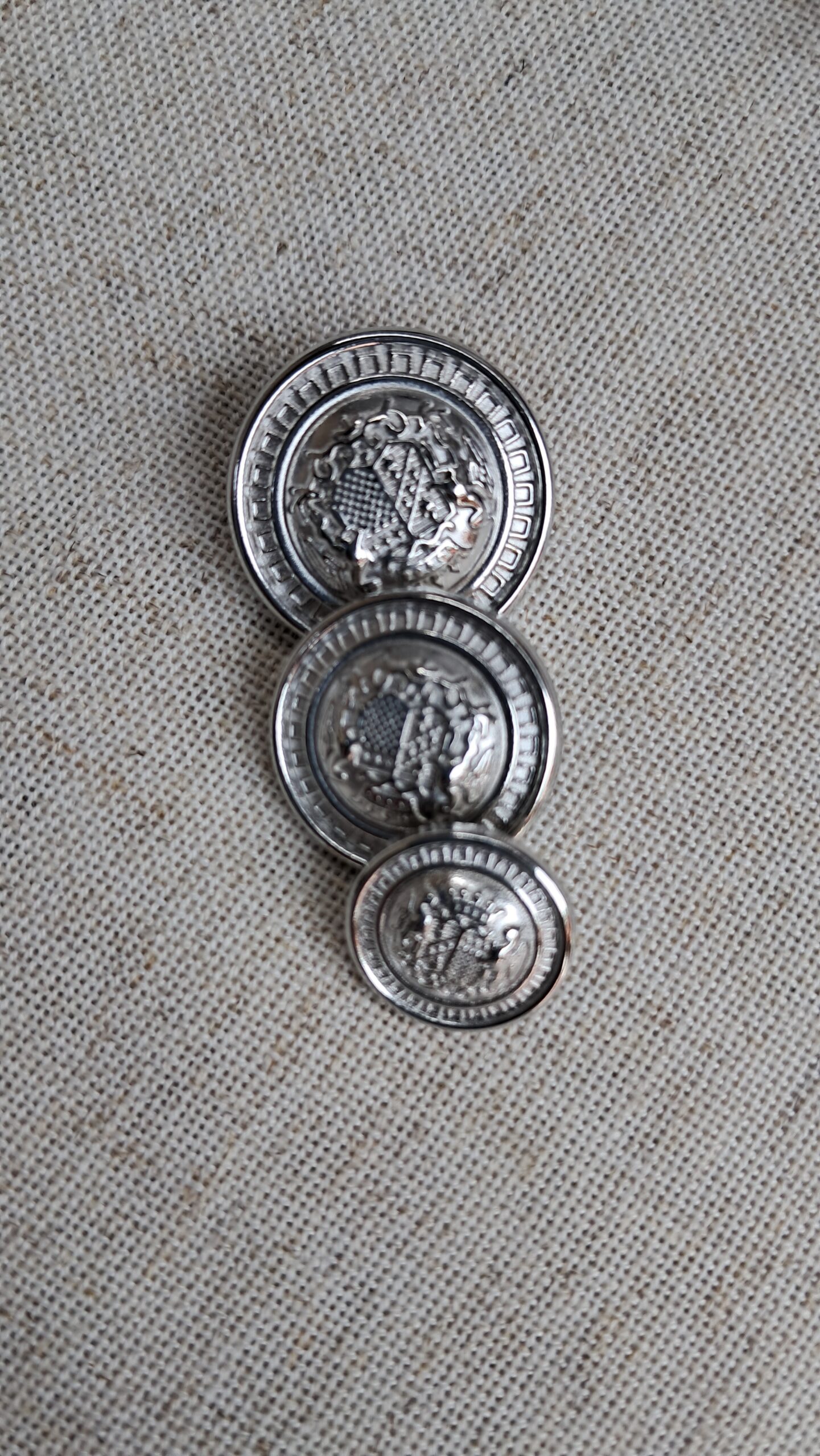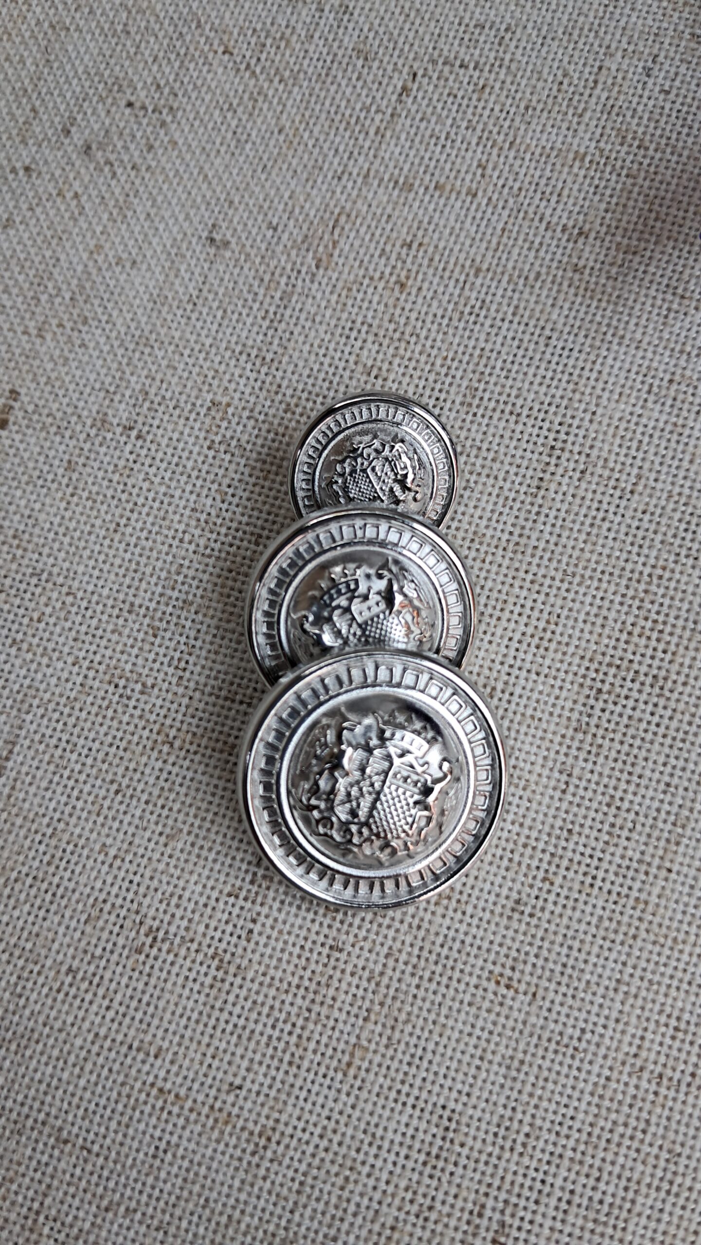 Металеві ґудзики преміум’якості, колір Світле Срібло. Вирізняються унікальним декоративним рельєфним елементом, що додає виробу вишуканості та об’єму. Важка, надійна фурнітура італійського виробництва.