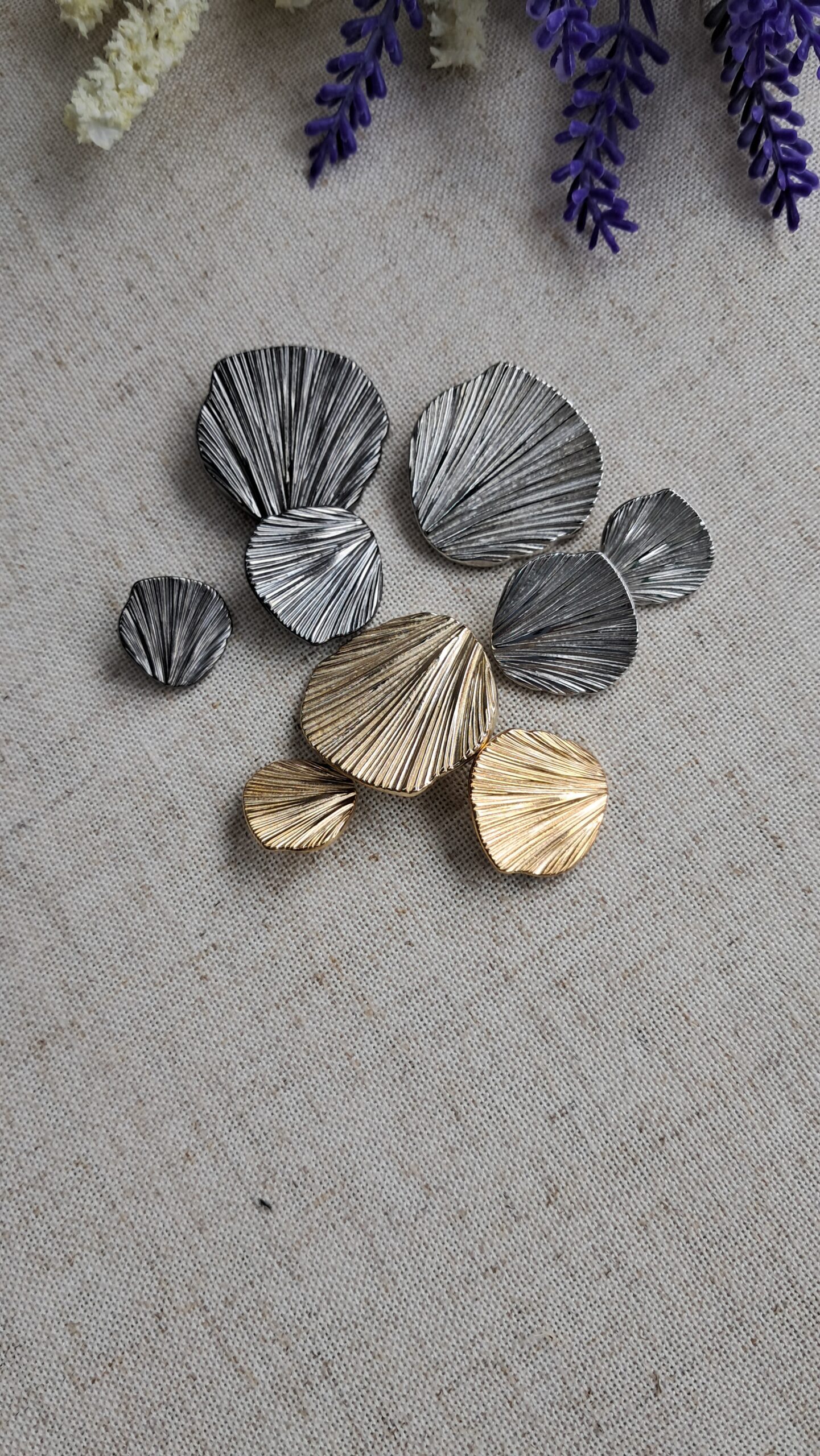 Ексклюзивні італійські металеві ґудзики преміум’якості, що стануть вишуканим декоративним елементом Вашого гардероба. Дизайн натхненний природною красою та рельєфом морської мушлі (ракушки). Кожен ґудзик має унікальну хвилясту або нашаровану текстуру, що надає виробу органічного, водночас розкішного вигляду.