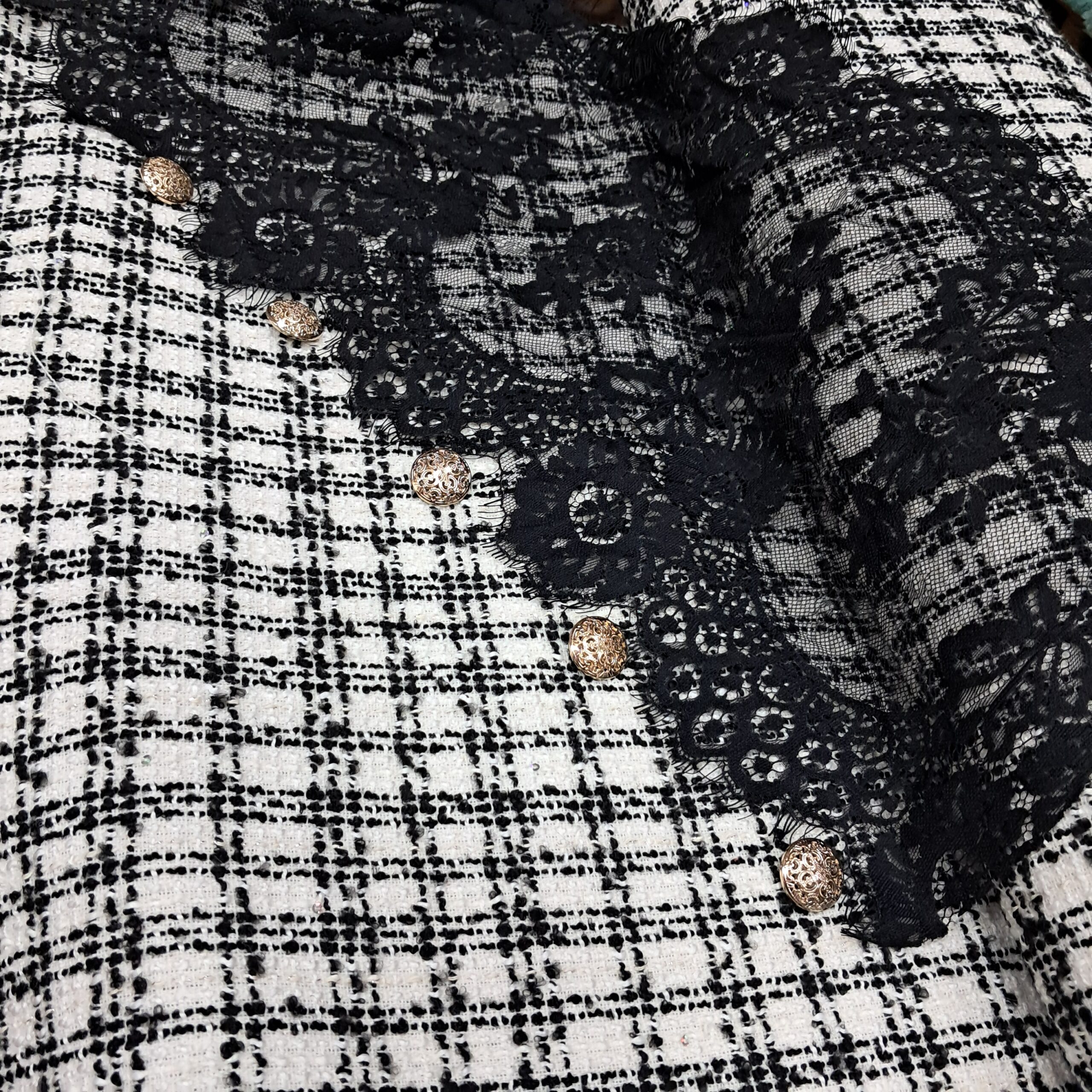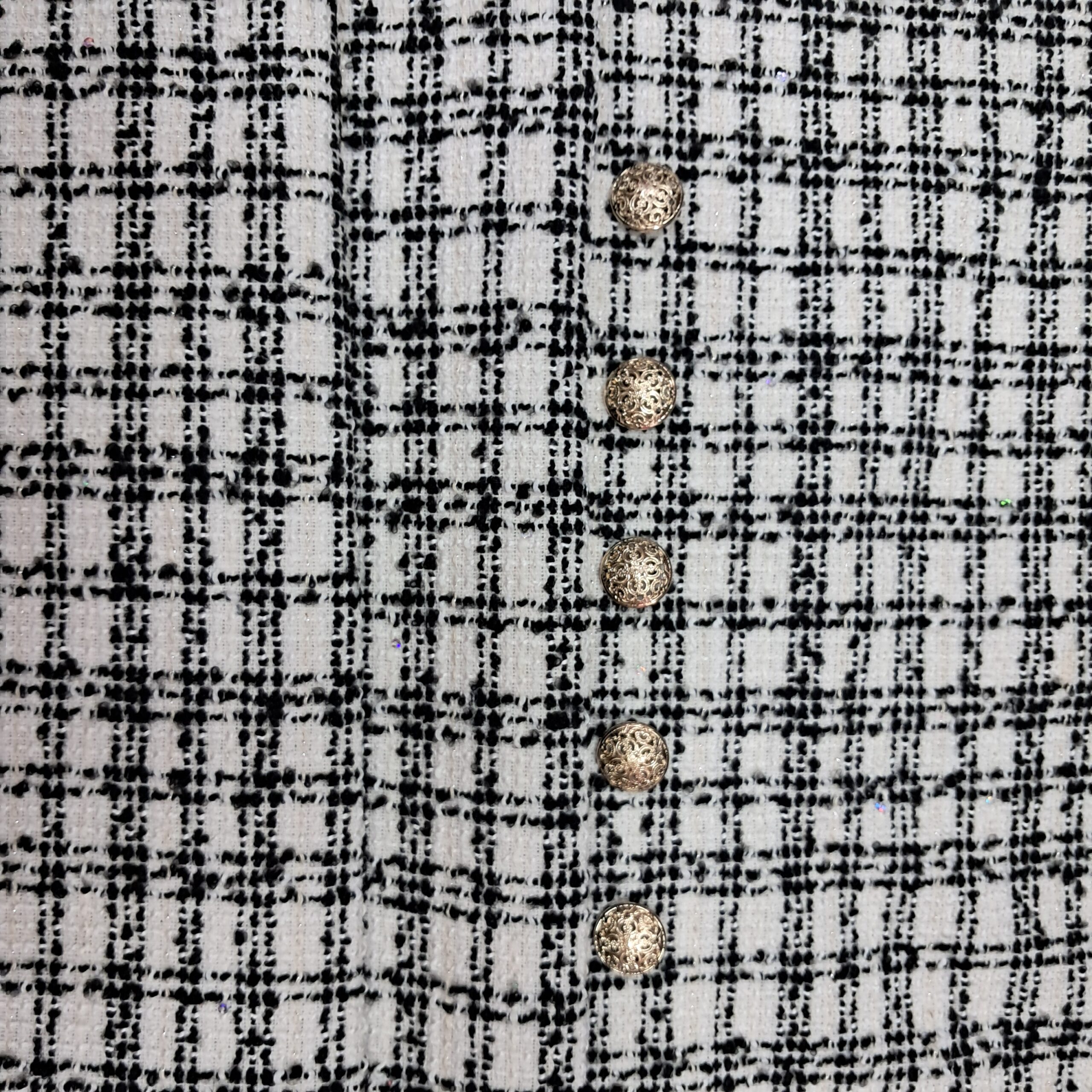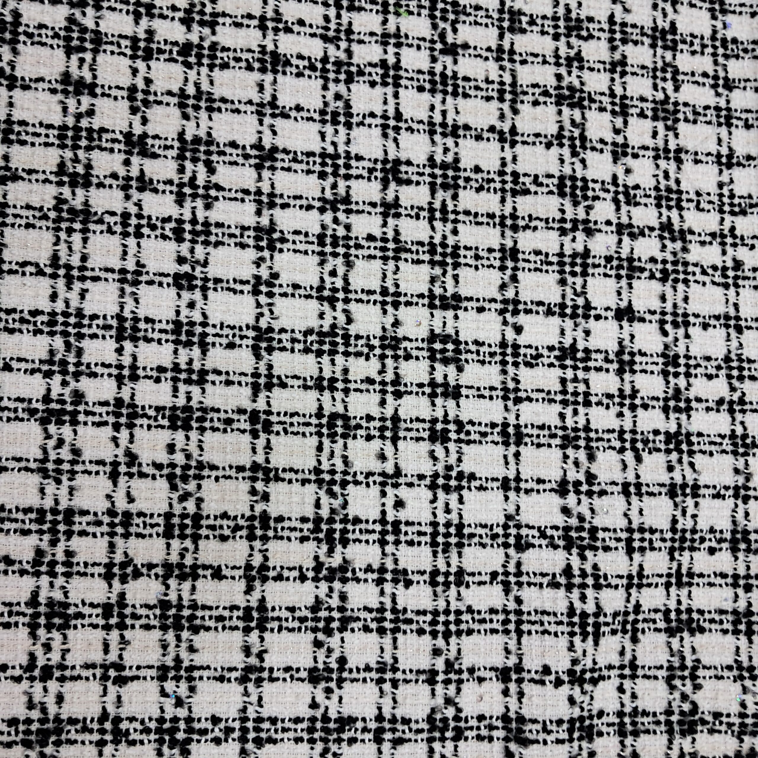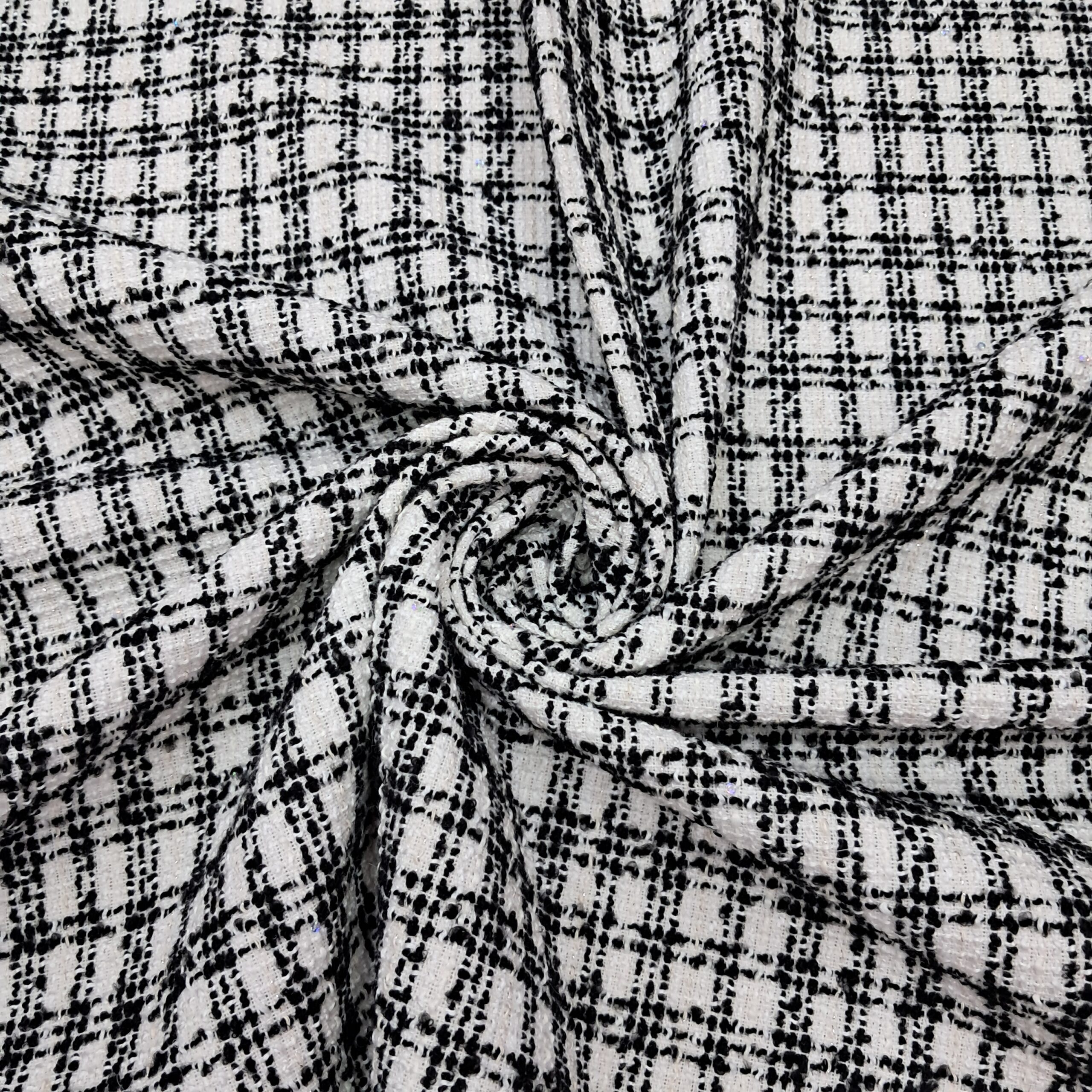 Твід Шанель із пайеткою ― розкішна костюмна тканина турецького виробництва, що поєднує класичний стиль і сучасний акцент. Матеріал має щільне букле-плетіння з товстих ниток біло-чорній гамі. Між волокнами делікатно вшиті дрібні пайетки, які створюють вишукане мерехтіння. Тканина чудово тримає форму, не скочується й при цьому залишається комфортною в носінні