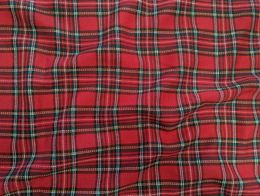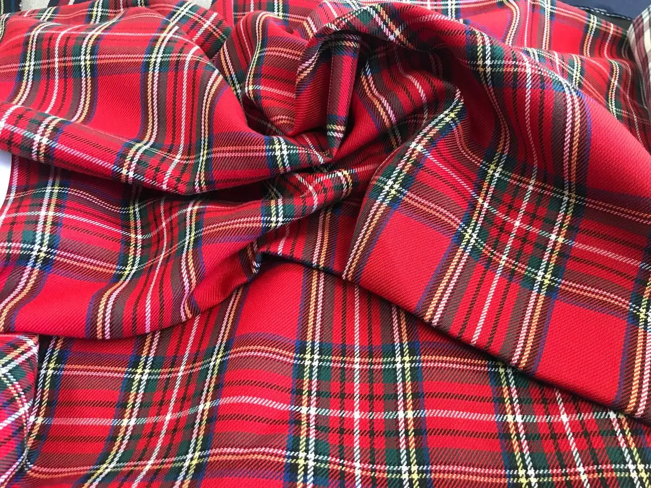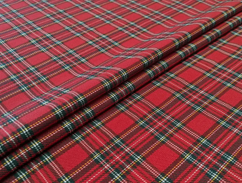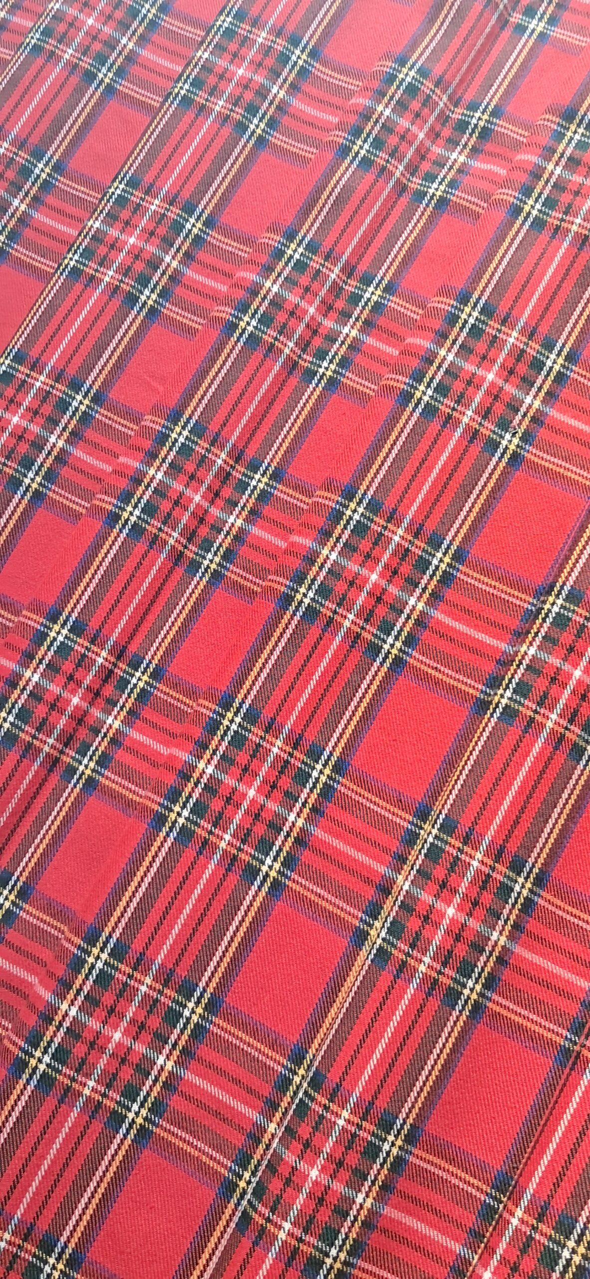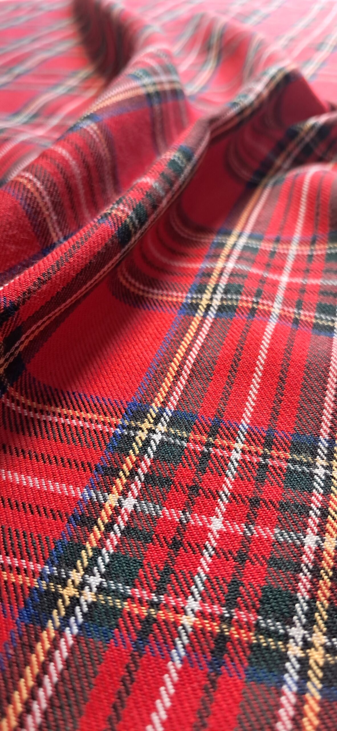 Шотландка (Корея) — класична тканина з червоним фоном та малюнком у клітинку. Склад: 70% поліестер, 30% віскоза. Щільність 200 г/м². Ідеально підходить для пошиття костюмів, шкільної форми, суконь та спідниць. Практична, зносостійка та легка у догляді.