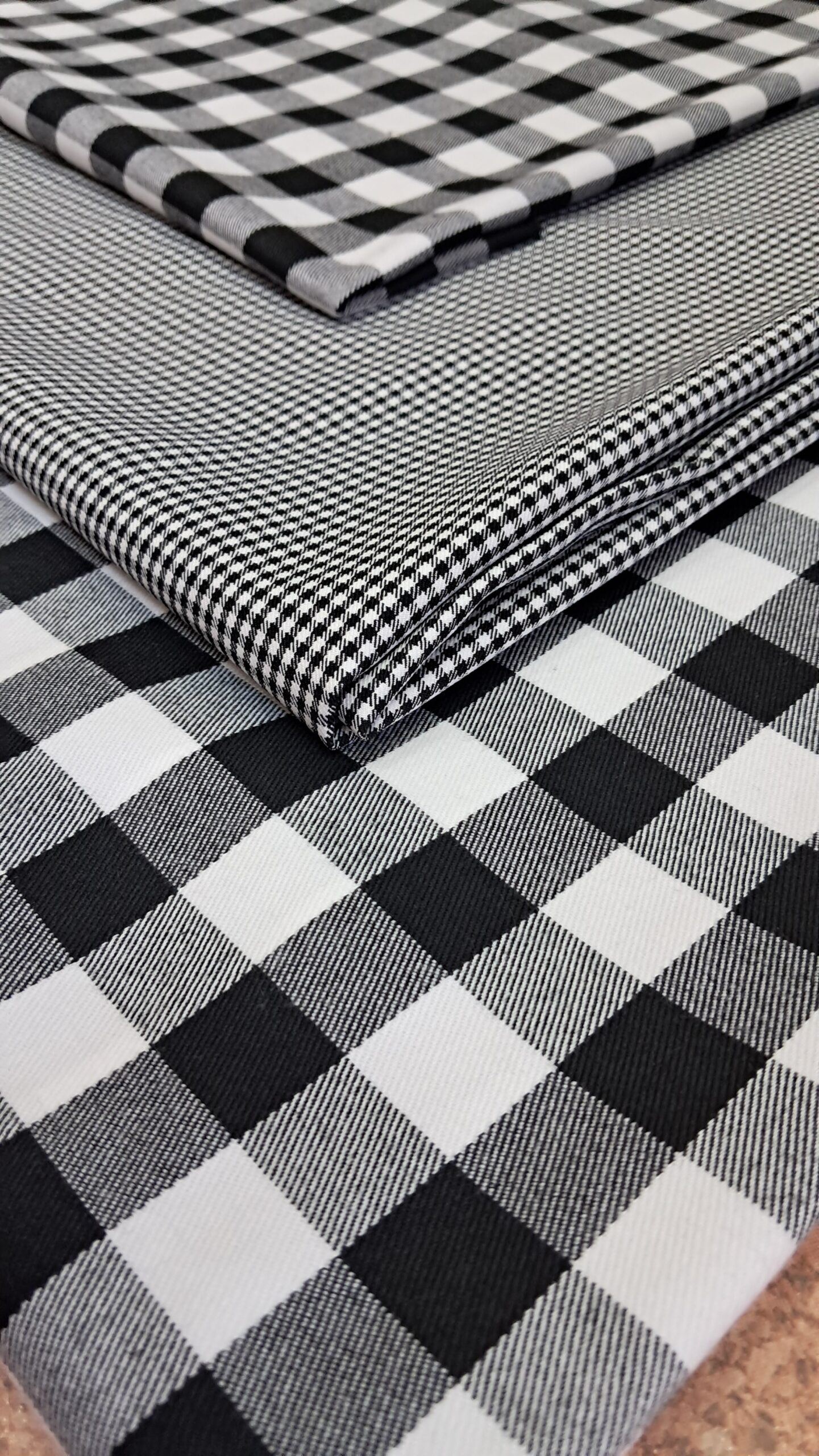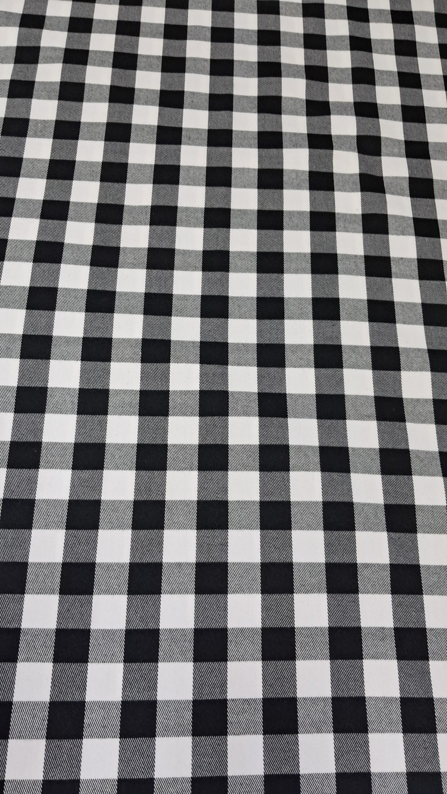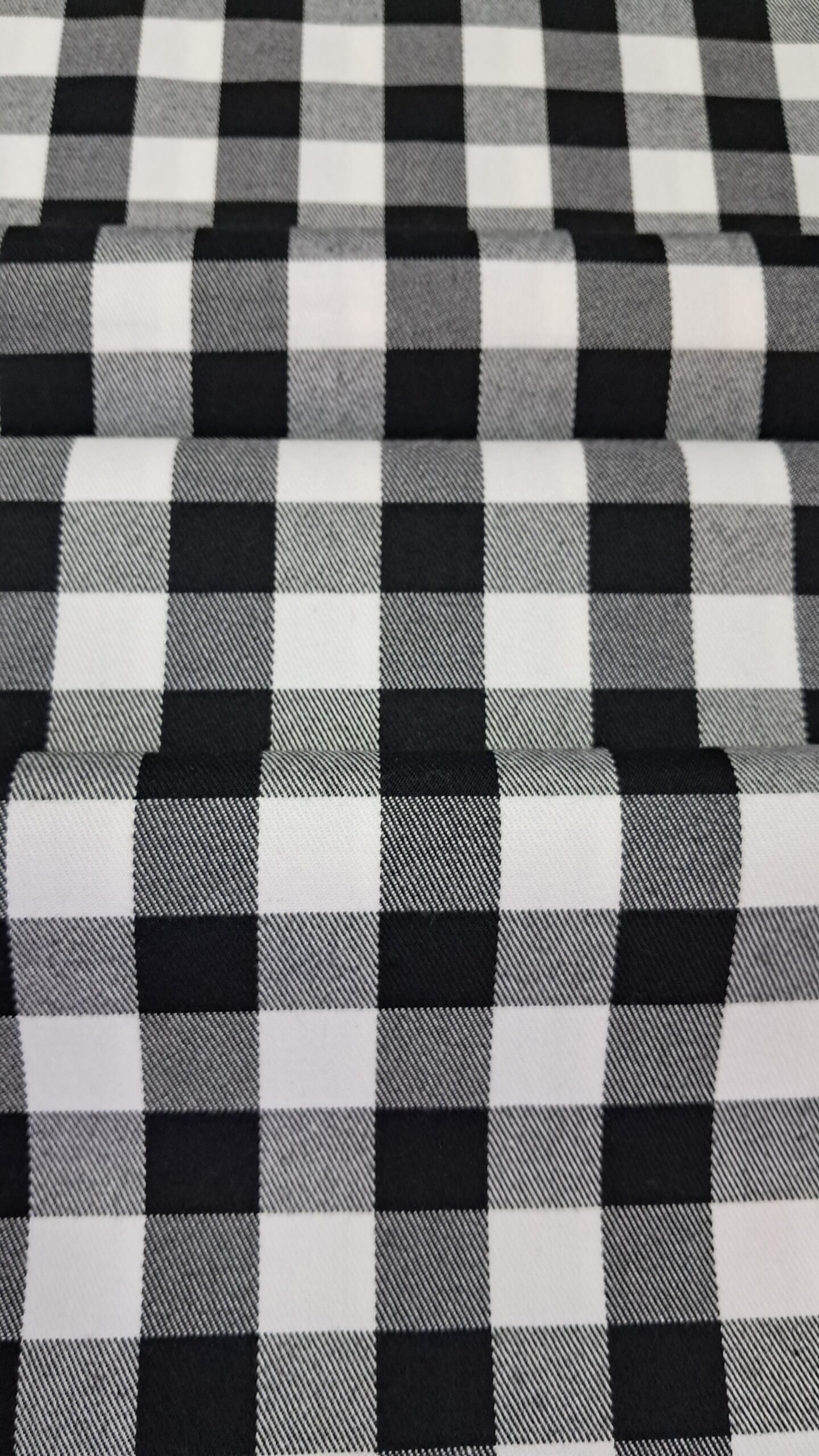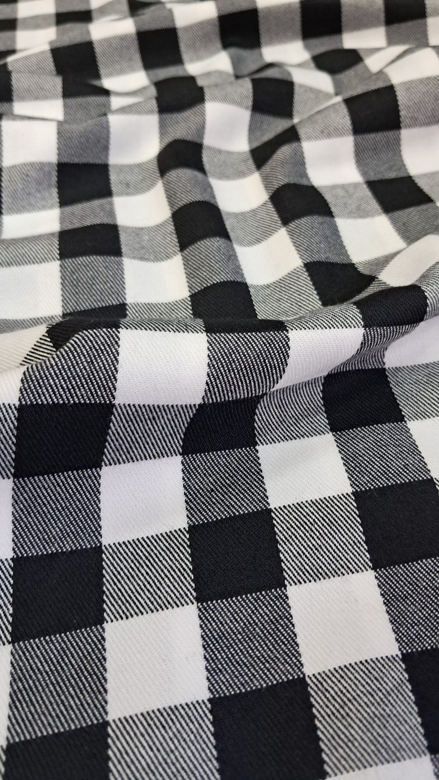 Полотно має чітку, структуровану поверхню, що видно по фактурі переплетення ниток. Малюнок – традиційна чорно-біла клітинка, яка ніколи не виходить з моди. Цей візерунок є універсальним і дозволяє створювати як строгі ділові образи, так і елегантні повсякденні речі. Тканина достатньо щільна, але при цьому м’яка на дотик, добре тримає форму та не мнеться, що є важливою характеристикою для костюмних матеріалів.