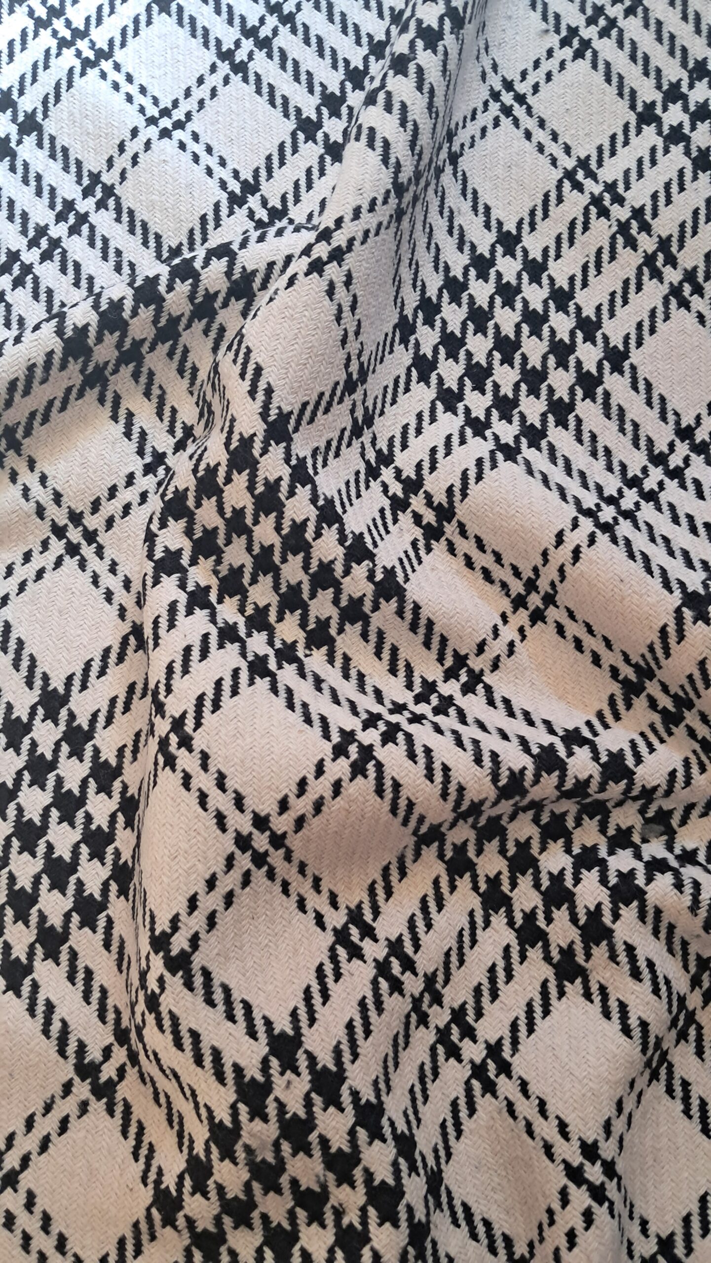 Ця костюмна тканина з великим візерунком “гусяча лапка” на молочному тлі — стильне поєднання класики та сучасності. Чітка графіка широкої клітинки додає виробам виразності, а натуральний склад дарує комфорт. Виготовлена зі 100% бавовни, вона приємна до тіла, добре пропускає повітря, зберігає форму та має м’яку фактуру. Щільне переплетення ниток забезпечує довговічність, а ширина 1,5 м дозволяє створювати як класичний, так і креативний одяг. Тканина ідеально підходить для костюмів, суконь, демісезонних пальт, жакетів та інших стильних виробів.
