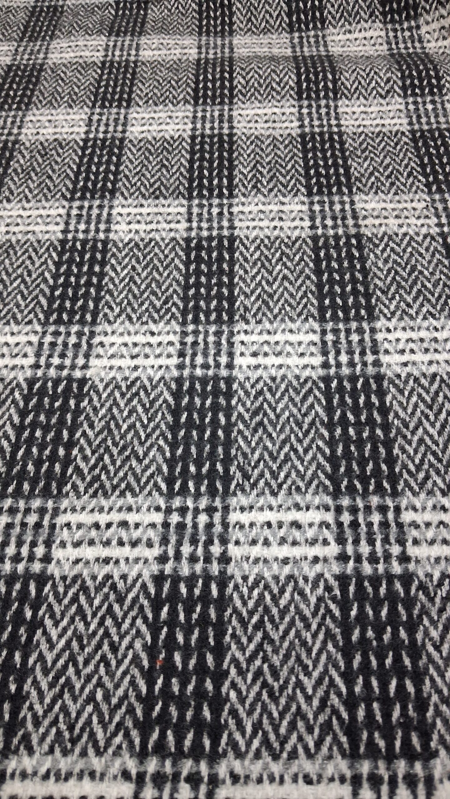 Матеріал має складну, об’ємну текстуру завдяки використанню традиційного переплетення “Ялинка” (Herringbone), яке слугує фоном. Поверх цього рельєфного фону розташовується класичний, чіткий візерунок Клітинка. Тканина має помірну щільність, є м’якою, приємною на дотик, добре тримає форму та мало схильна до зминання, забезпечуючи охайний вигляд виробу.
