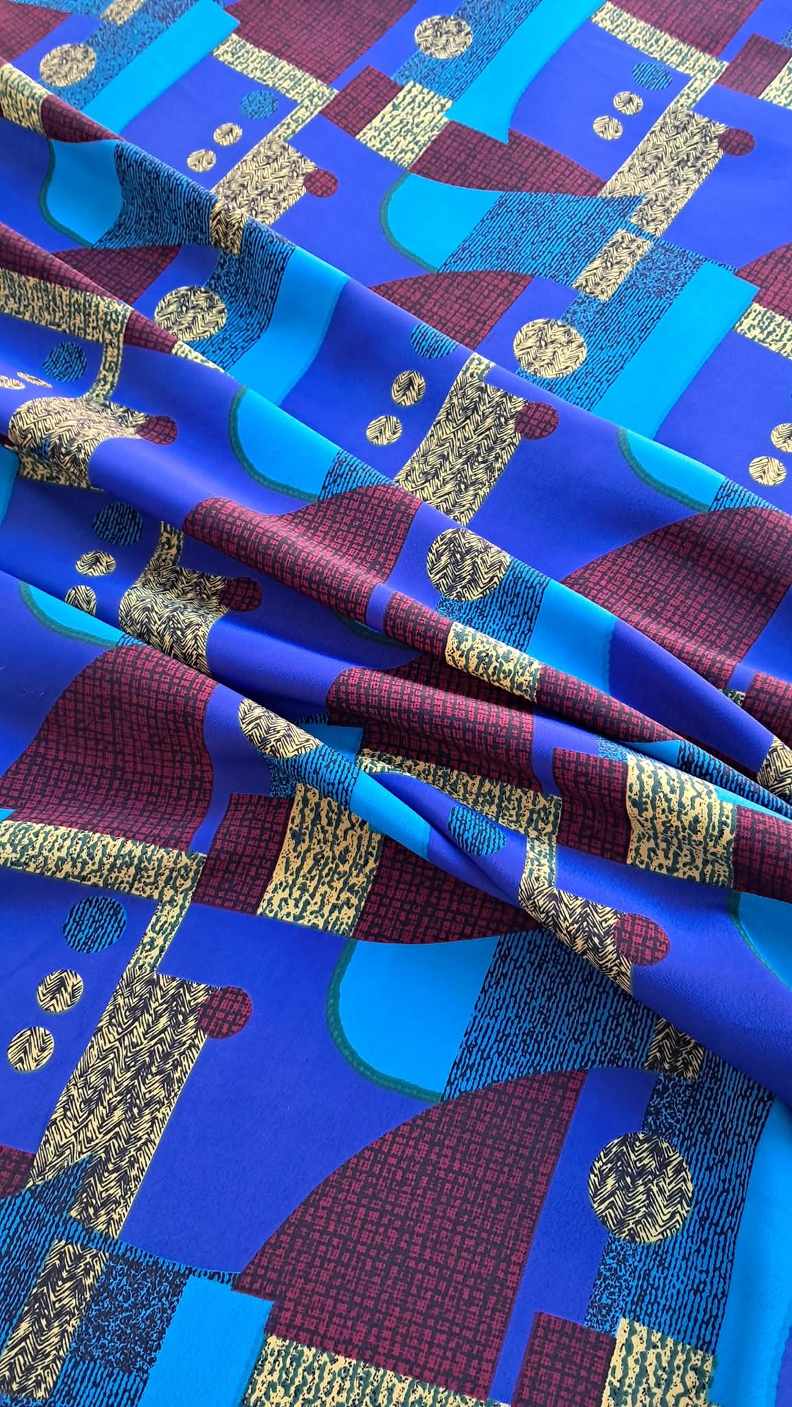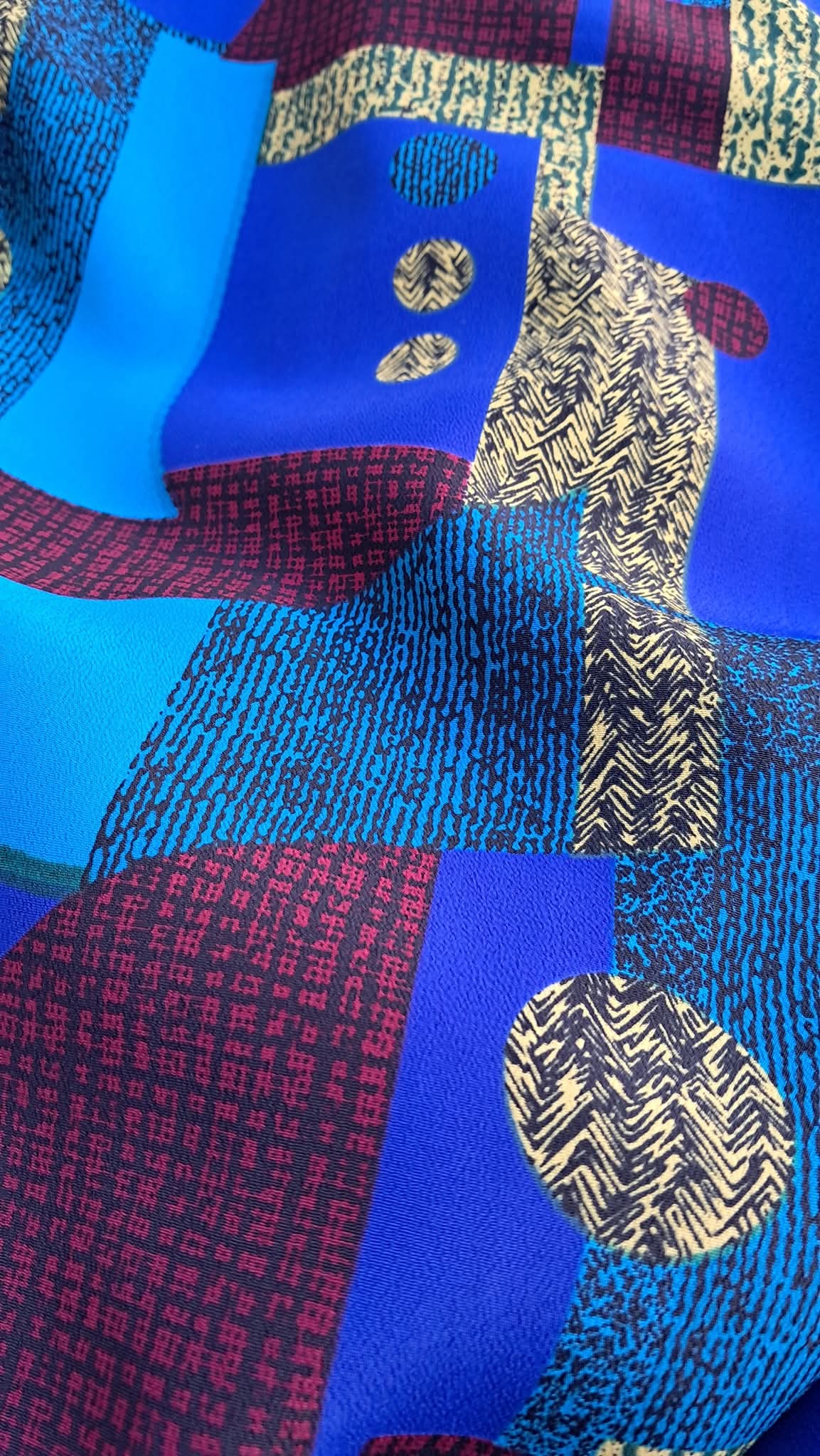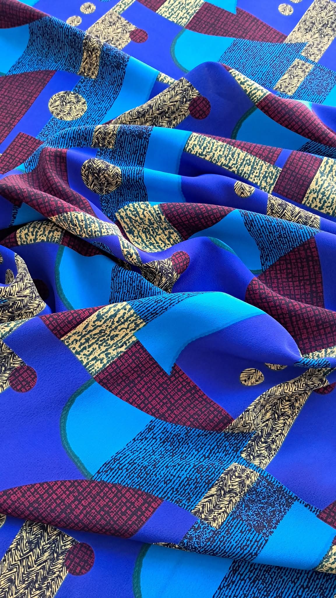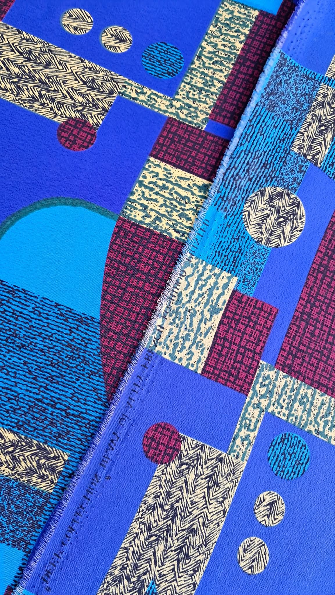 Цей креп-принт — справжня знахідка для тих, хто шукає щось особливе. Завдяки яскравому геометричному візерунку та насиченим кольорам, ця тканина одразу привертає увагу. Її незвичний, сучасний дизайн дозволяє створювати справді унікальні речі, що виділяються з натовпу.