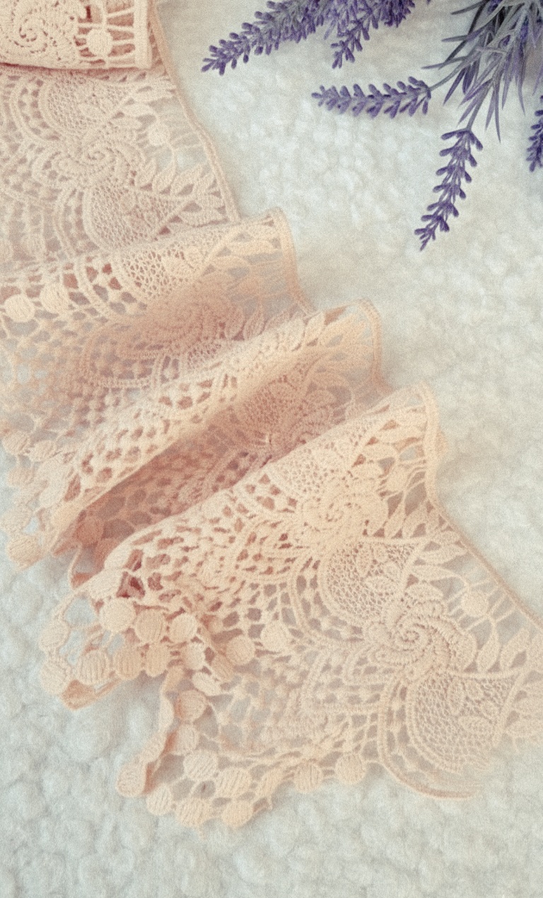 Це високоякісне декоративне мереживо виготовлене з натуральної бавовняної (ХБ) нитки. Відрізняється м’якою, приємною на дотик текстурою та насиченими кольорами. Представлено в асортименті з різноманітними, чітко вираженими візерунками та різною шириною, що робить його універсальним для оздоблення. Мереживо міцне, зносостійке та зберігає форму після прання (за умови дотримання правил догляду).