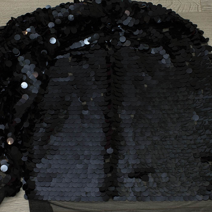 ​Ця тканина відзначається максимальним блиском та виразним гліттер-ефектом. Текстура об’ємна та рельєфна за рахунок великого розміру паєток. Основа — синтетична сітка, яка може мати невелику еластичність, що полегшує драпірування та пошиття виробів. Вимагає делікатного поводження через пришиті елементи.