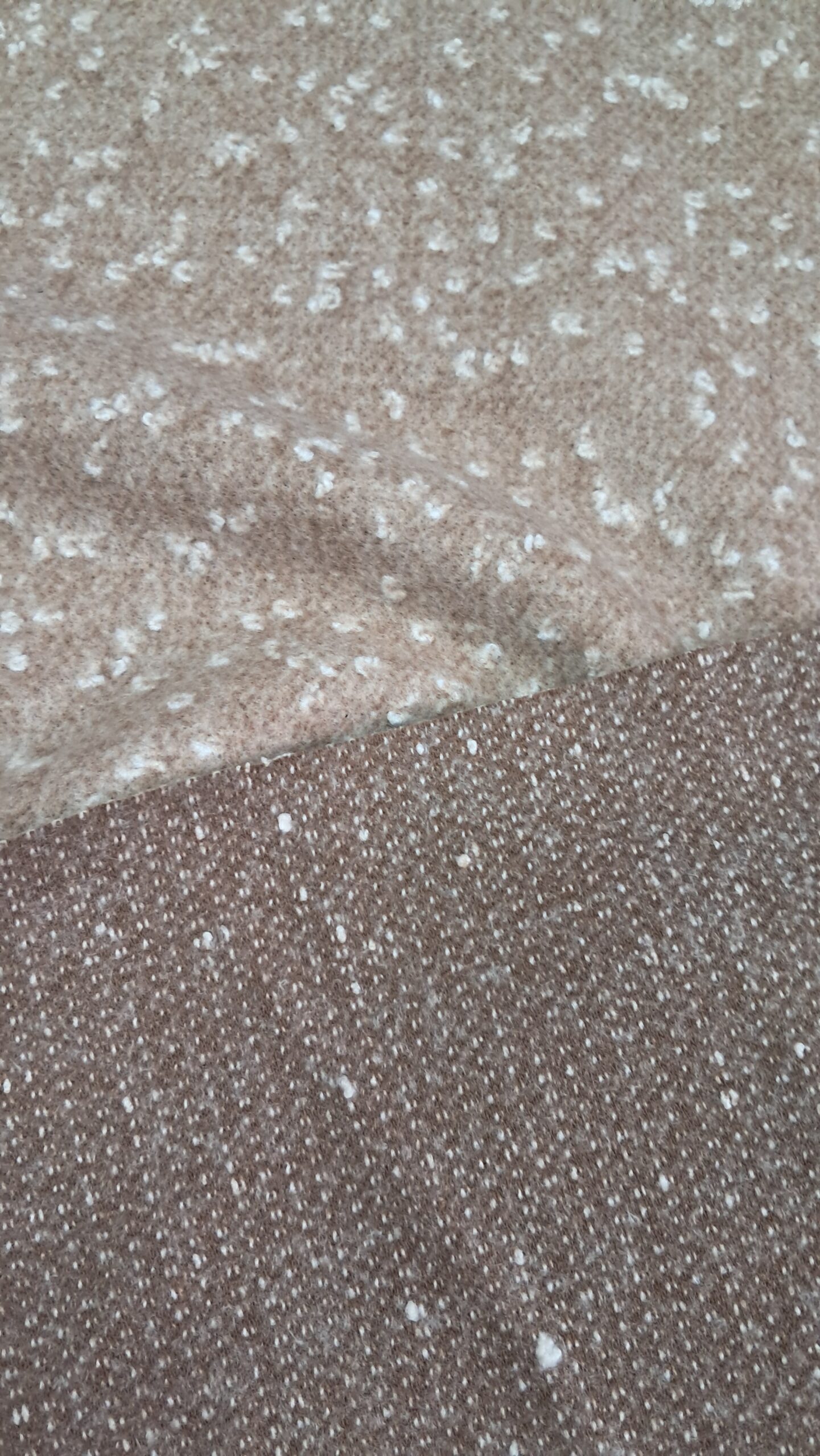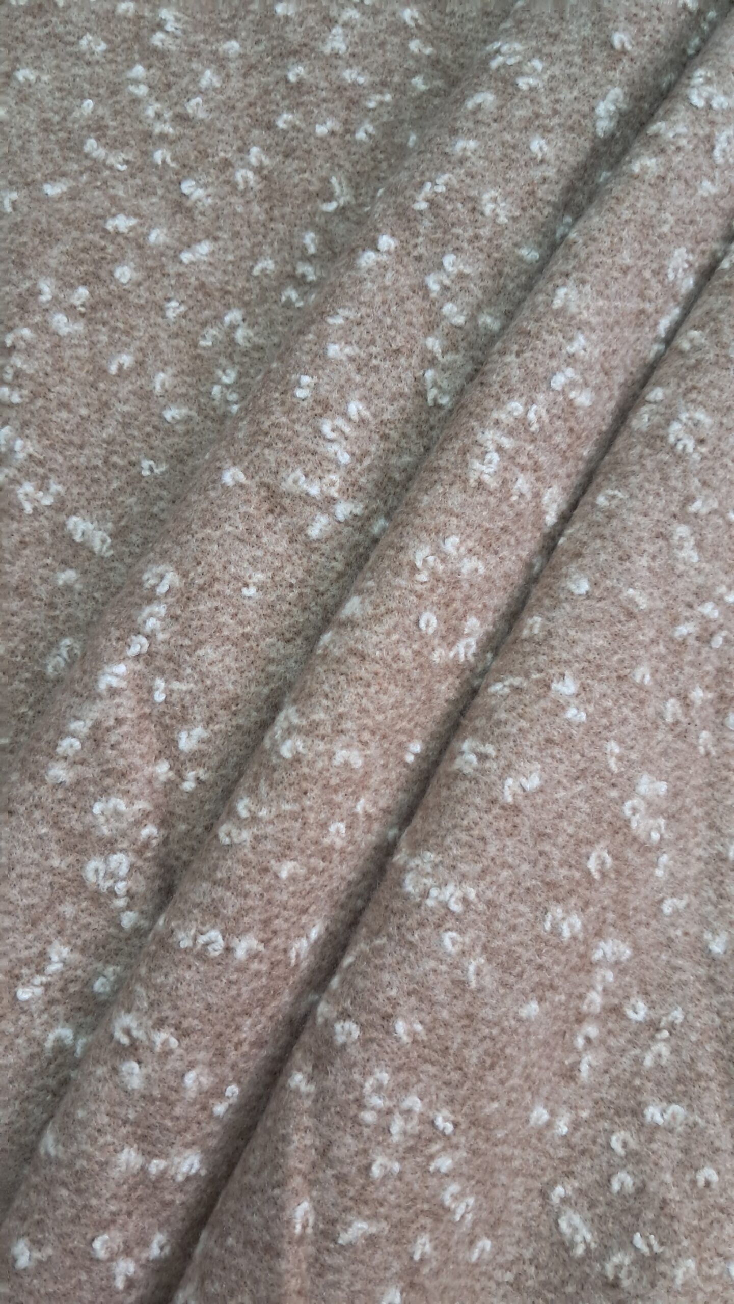 Ця твідова тканина, виготовлена в Туреччині, є чудовим матеріалом преміум-якості для створення елегантного та теплого одягу. Її унікальність полягає в особливому, фактурному переплетенні ниток. Основний бежевий колір полотна доповнюється вкрапленнями молочнихих ниток, які утворюють дрібні “буклешечки” по всій поверхні. Це створює об’ємну, “пухнасту” текстуру, яка не лише приємна на дотик, але й виглядає дуже стильно та дорого.