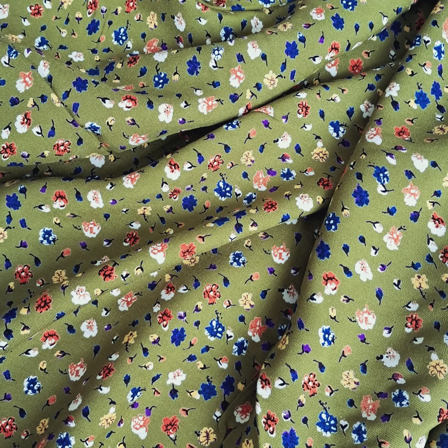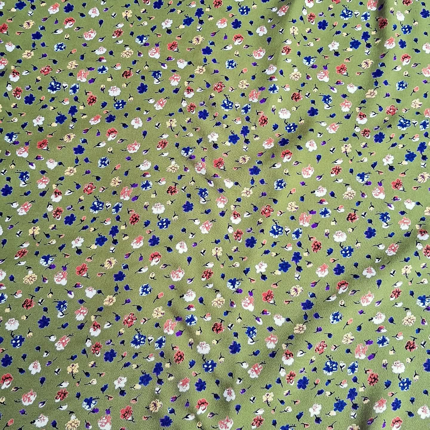 Штапель із дрібним квітковим візерунком на зеленому фоні — легка й дихаюча тканина, приємна до тіла. Завдяки поєднанню волокон вона поєднує натуральність і практичність, зберігаючи гарний вигляд у носінні. Маленькі квіточки на ніжній основі створюють романтичний та водночас універсальний образ.