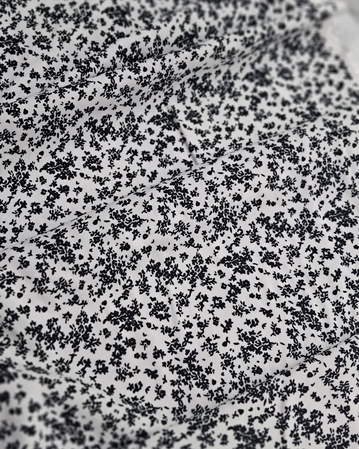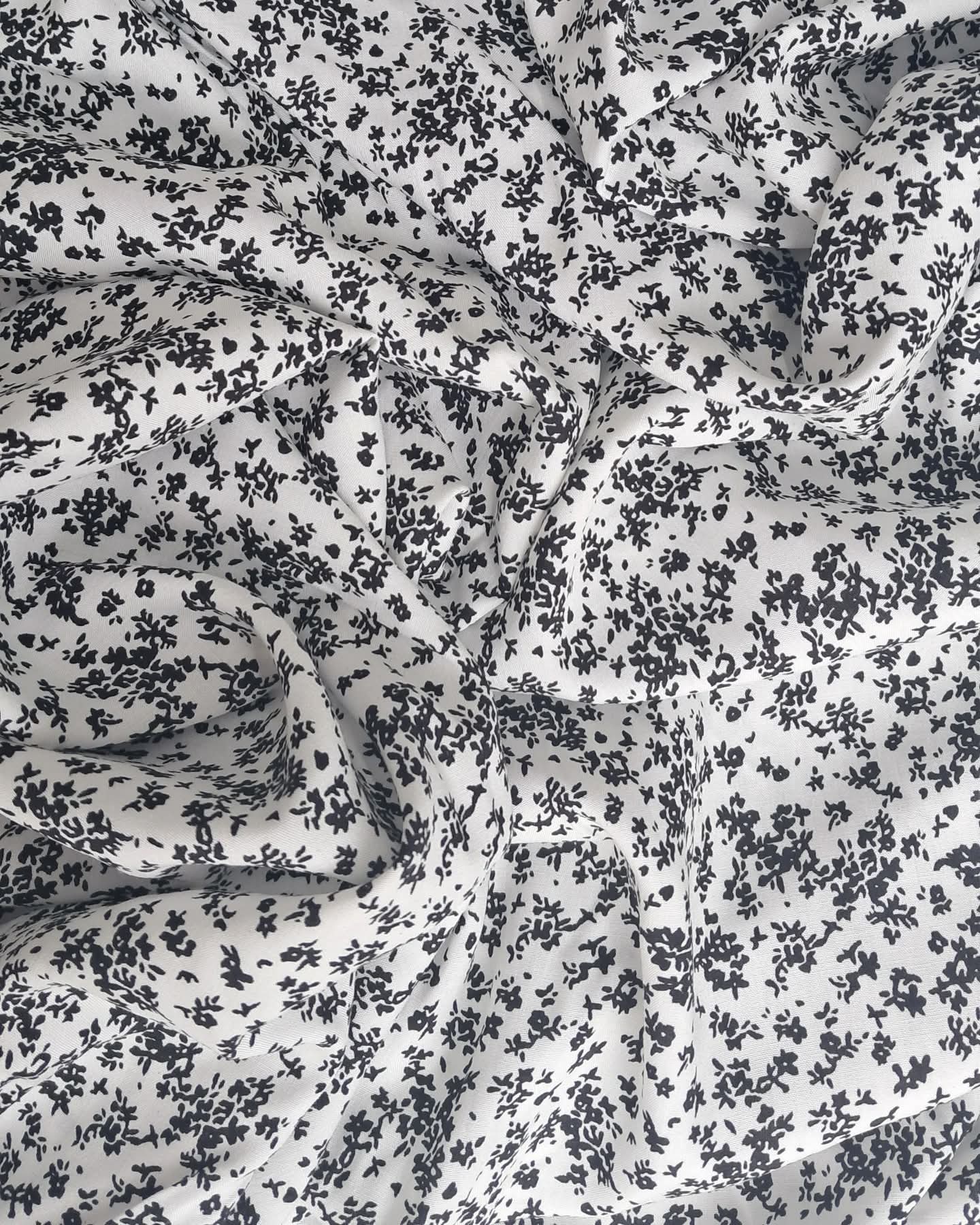 Штапель із дрібним квітковим візерунком на біломуому фоні — легка й дихаюча тканина, приємна до тіла, з м’яким природним блиском. Завдяки поєднанню волокон вона поєднує натуральність і практичність, зберігаючи гарний вигляд у носінні. Маленькі квіточки на ніжній основі створюють романтичний та водночас універсальний образ.