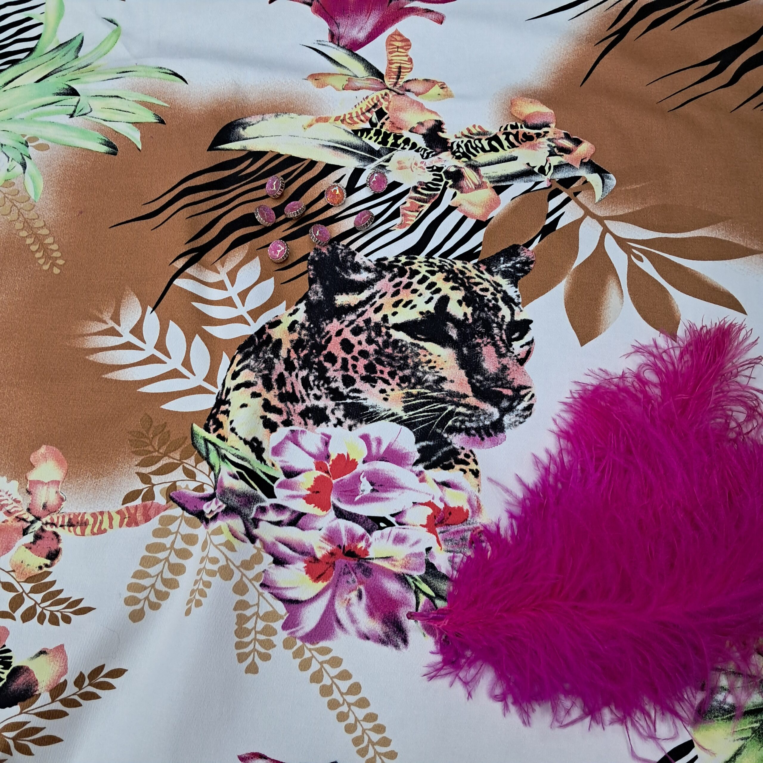 - Принт: Леопард у квітах, на білій основі.