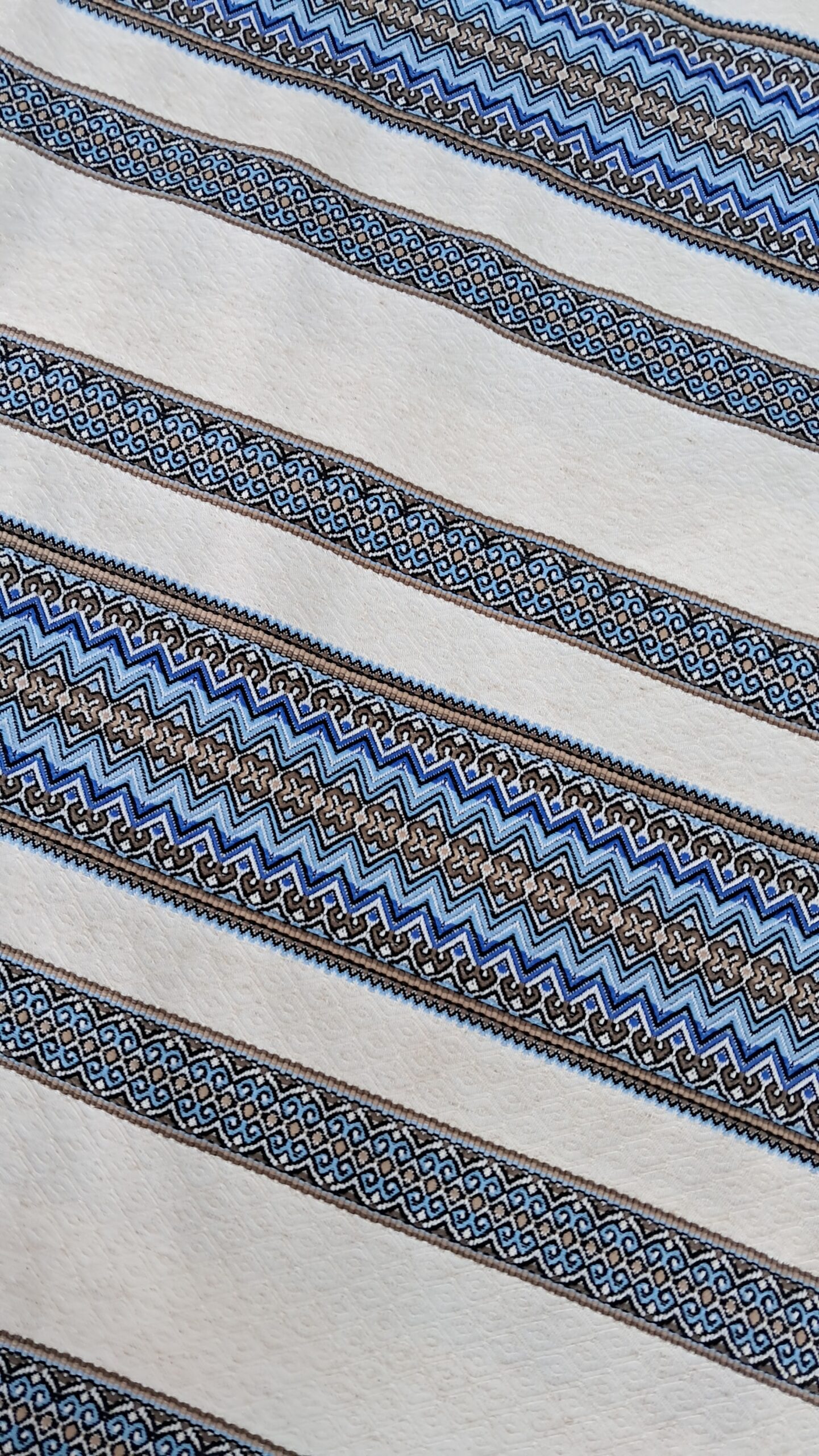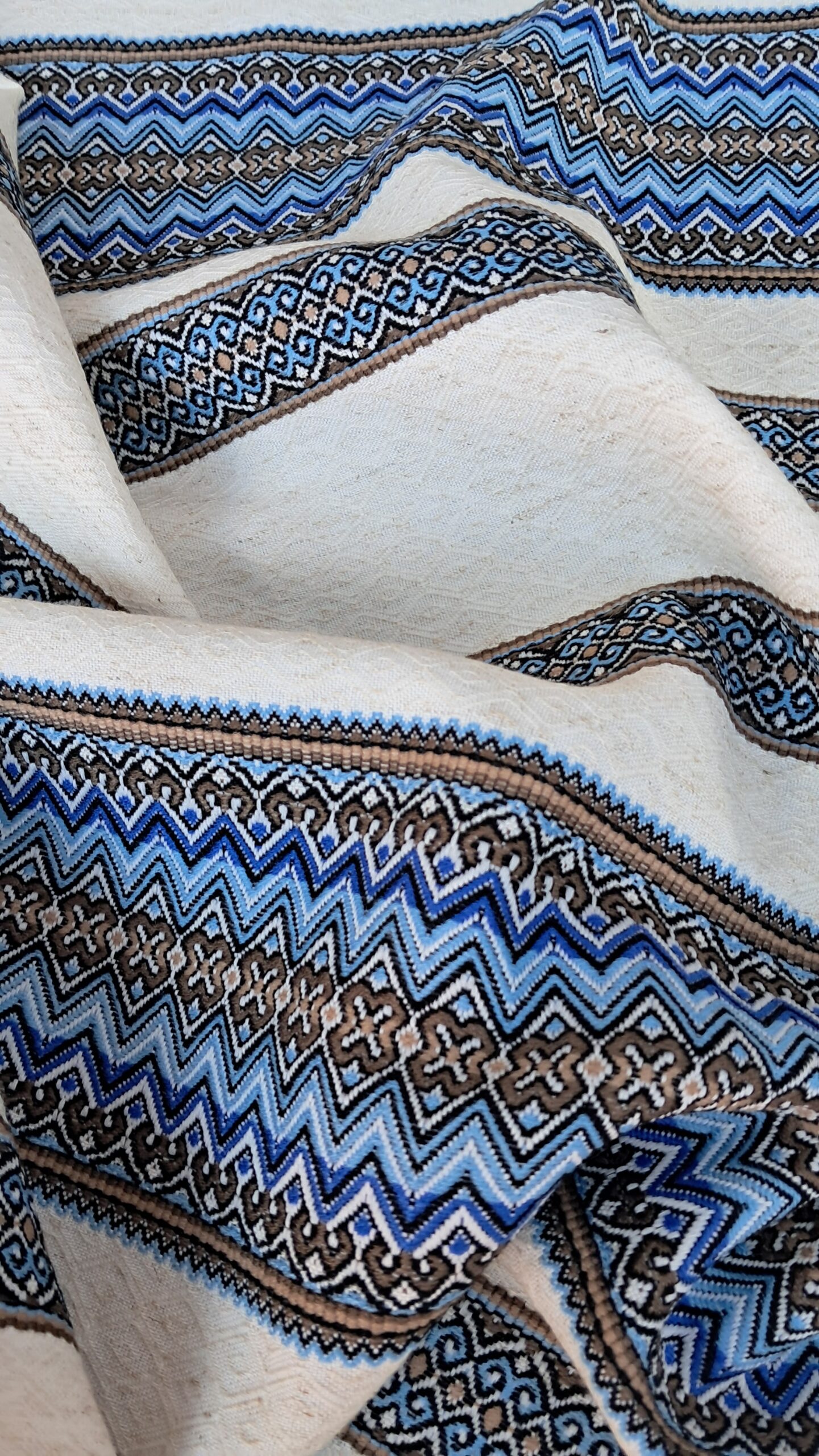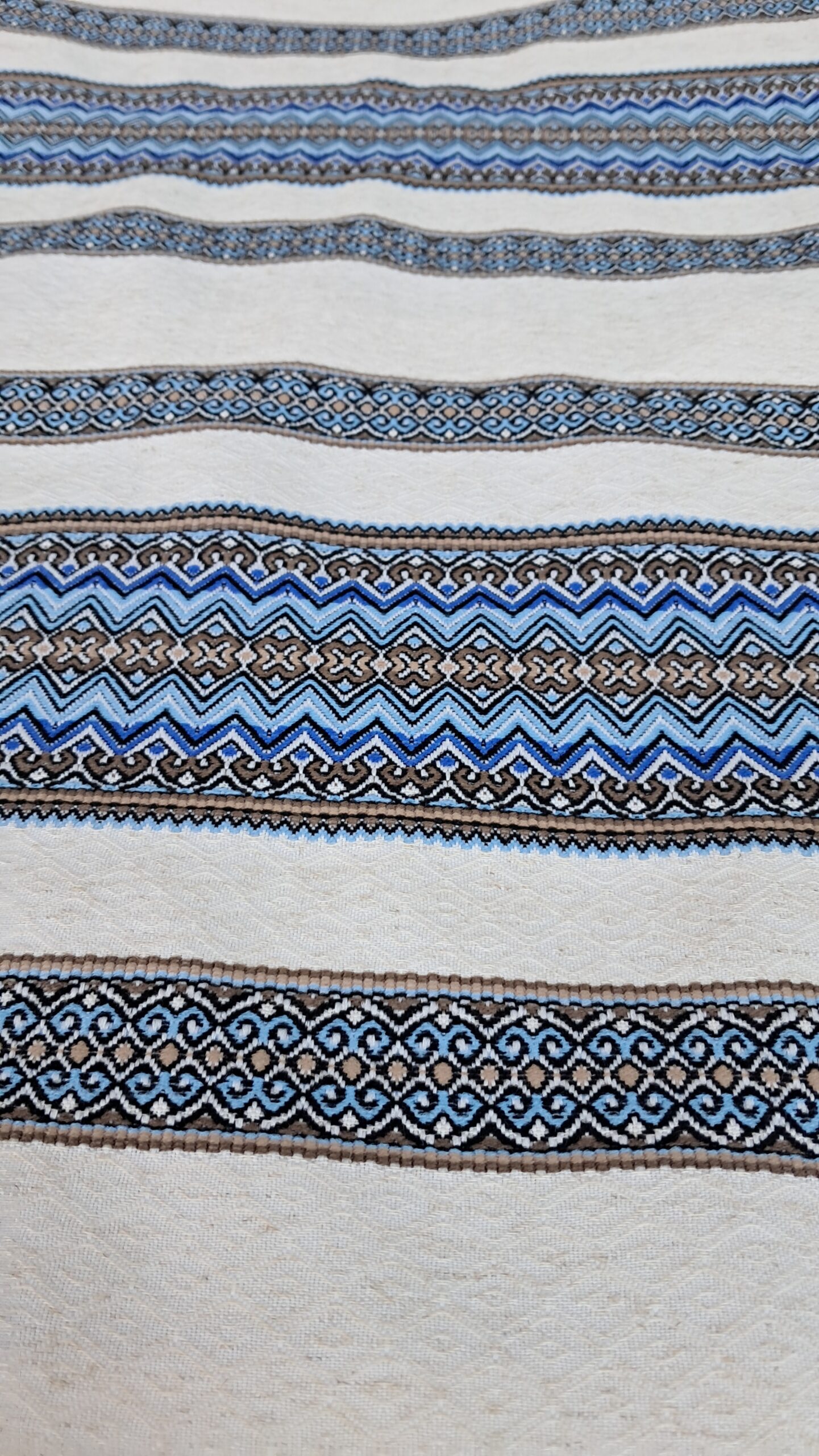 Народна жакардова тканина на бежевому фоні з витканим етнічним орнаментом у ніжно-голубих та бежевих відтінках. Завдяки жакардовому плетінню малюнок виглядає об’ємним та виразним, створюючи справжній ефект ручного ткацтва. Поєднання натуральних волокон (бавовна та льон) з поліестером і акрилом забезпечує міцність, зносостійкість та легкість у догляді, при цьому тканина зберігає природний вигляд та приємну фактуру. Щільність 293 г/м² робить матеріал достатньо міцним та універсальним: він тримає форму, не надто тонкий і водночас пластичний у роботі.