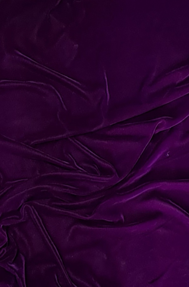 Благородний оксамит на шовковій основі в сіро-баклажановому відтінку – вишукана тканина для вечірніх суконь, жакетів та сценічних костюмів. М’який, приємний на дотик, з розкішною ворсистою поверхнею.