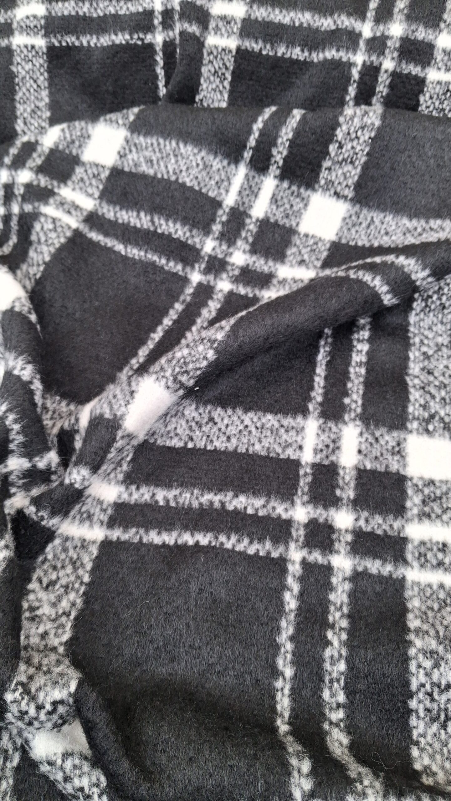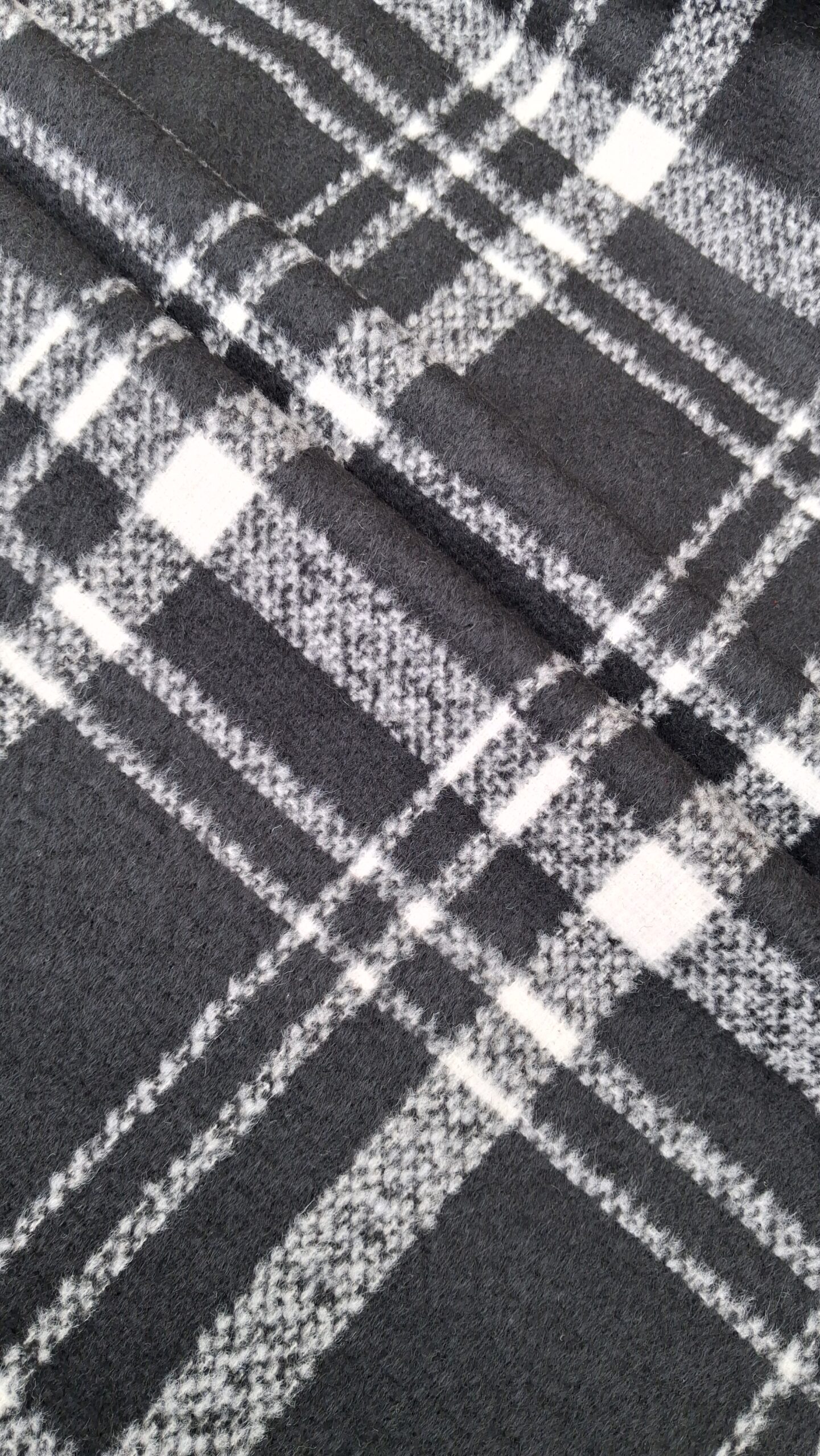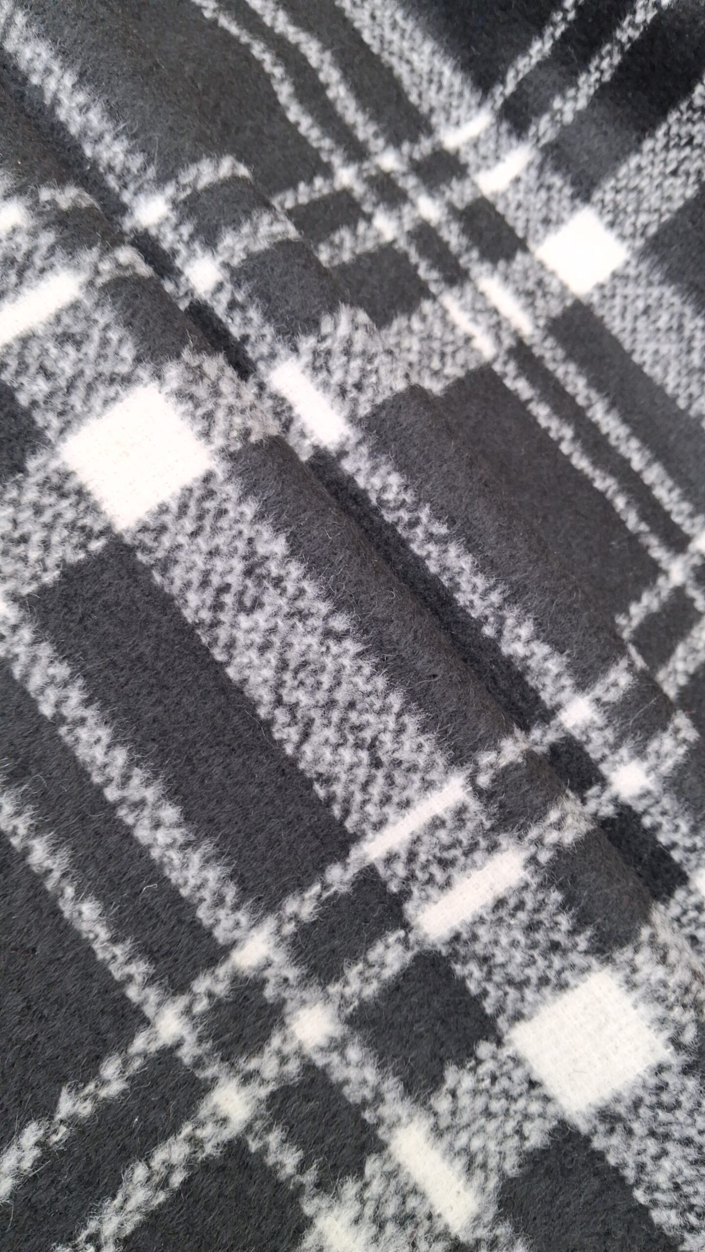 Представляємо стильний, висококонтрастний матеріал — пальтову тканину у класичну чорно-білу клітинку. Ця тканина вирізняється великим, чітко окресленим візерунком, що забезпечує готовому виробу виразний та сучасний вигляд. Ідеально підходить для створення модного, геометрично точного верхнього одягу.