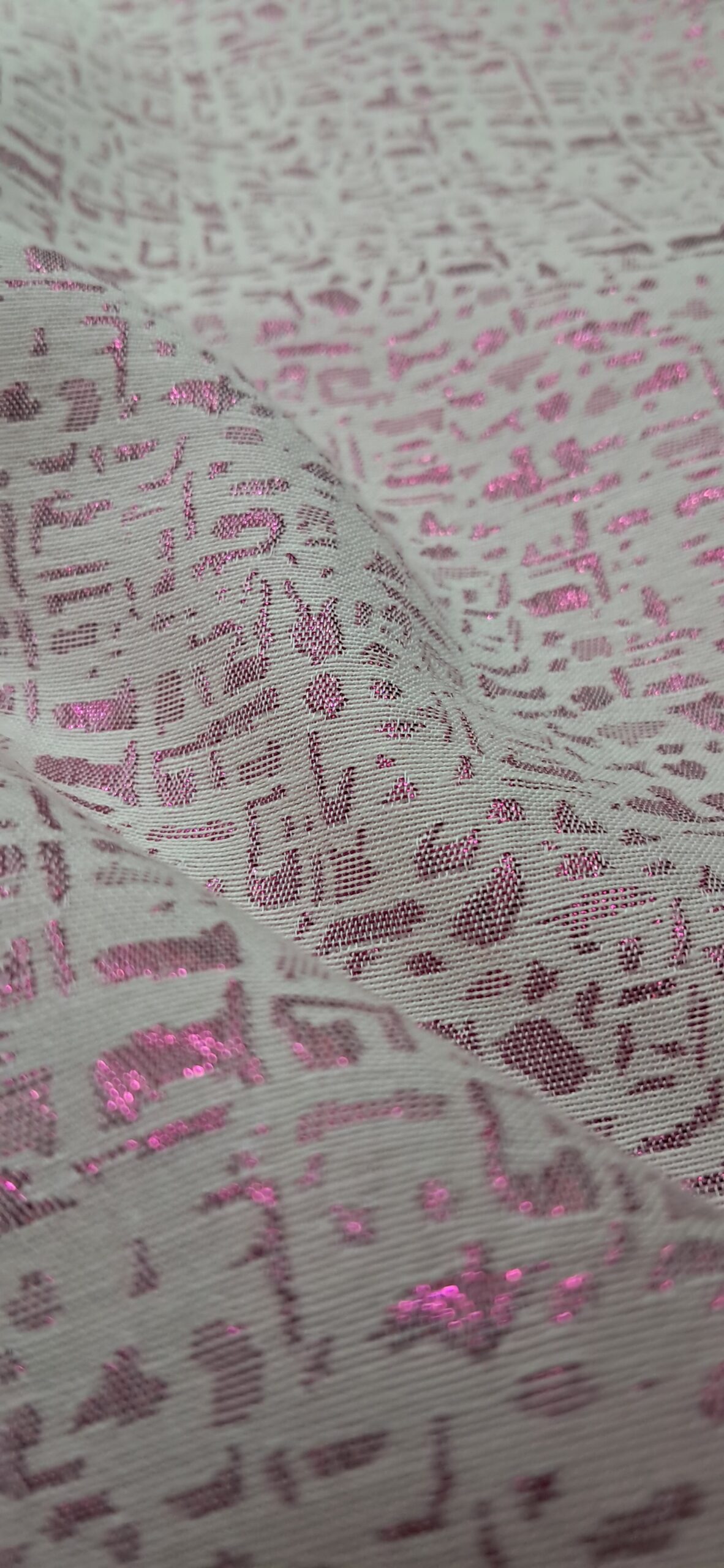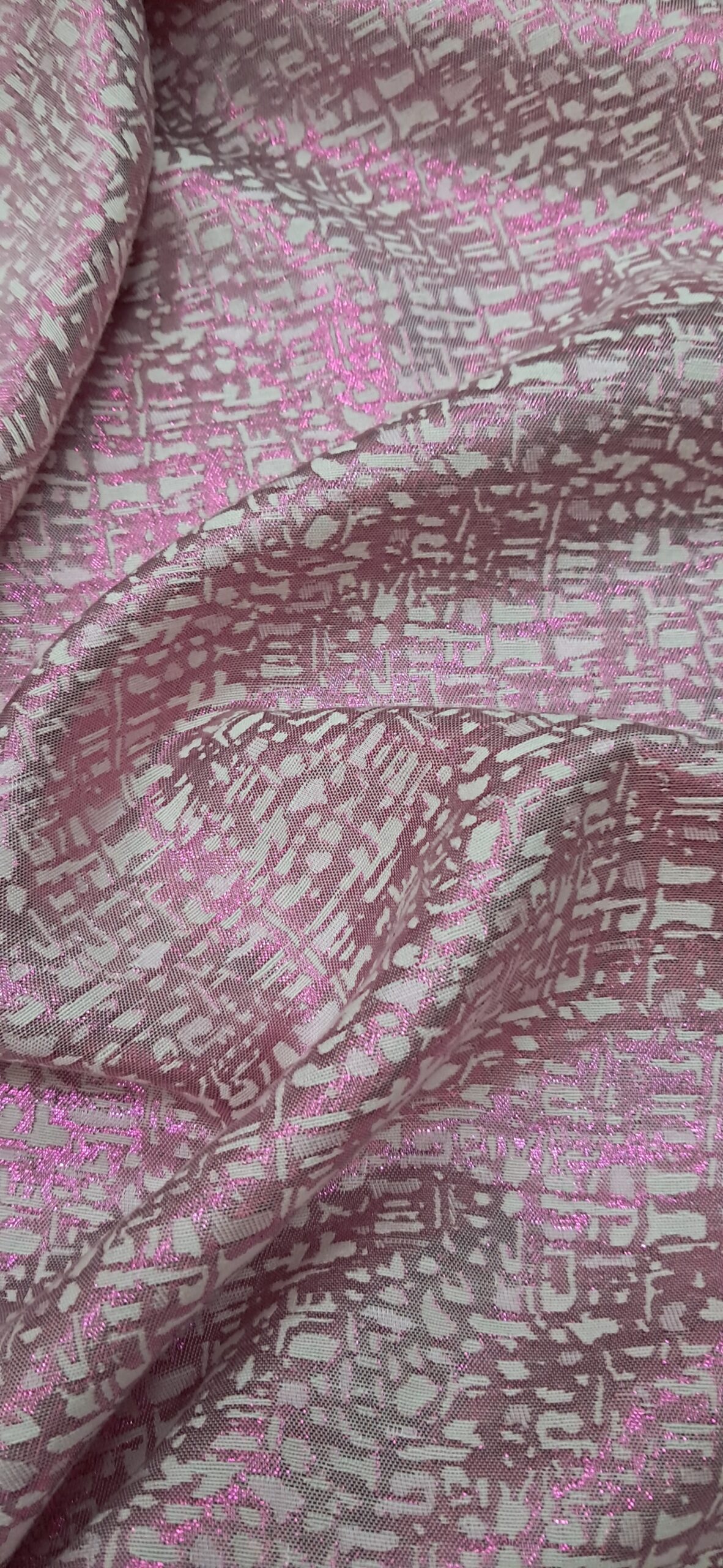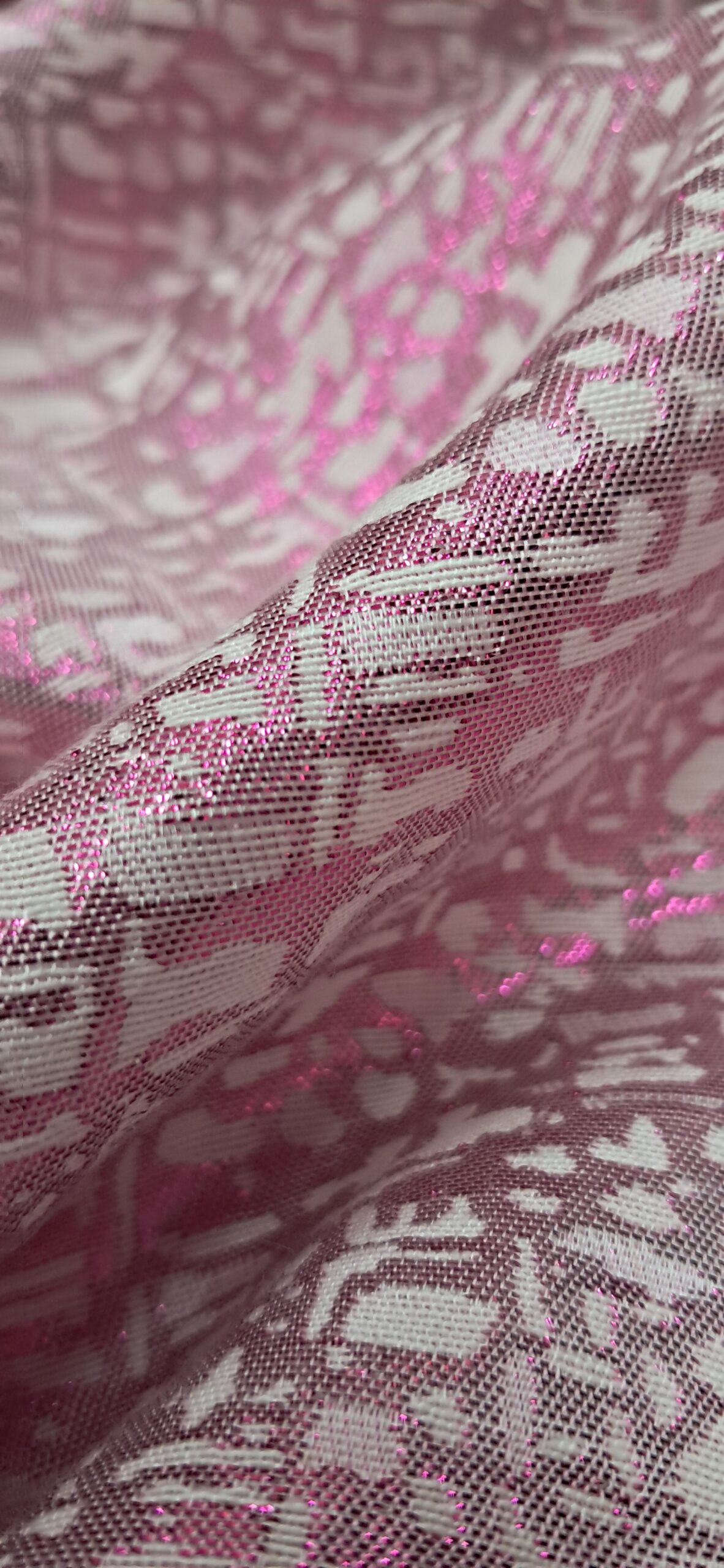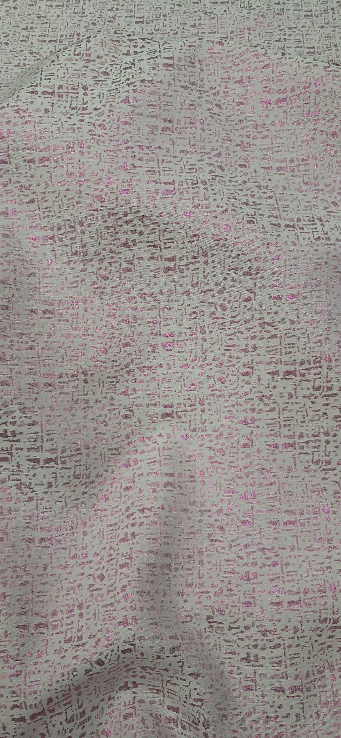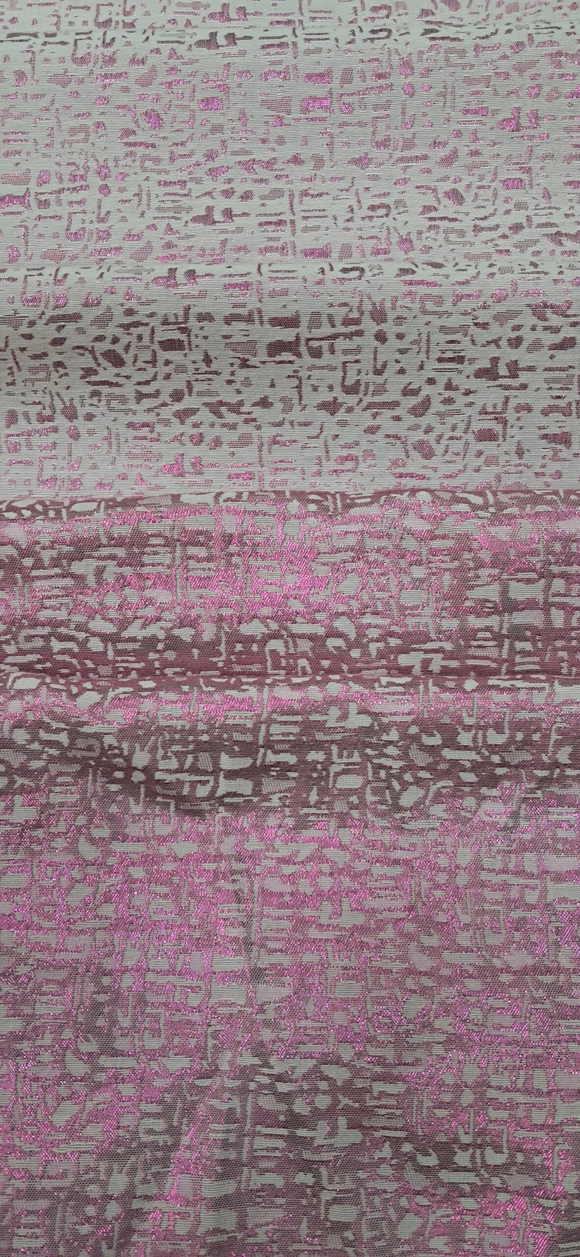 Елегантна двостороння жакардова парча, що поєднує в собі розкішний вигляд і незвичайну фактуру. Завдяки техніці жакардового плетіння тканина має складний візерунок, який виглядає по-різному з обох боків. Одна сторона має бежево-сріблясту основу з рожевим блискучим візерунком, тоді як інша – навпаки, рожева, більш блискуча, з бежево-сріблястим малюнком. Ця тканина ідеально підходить для створення ексклюзивних, ошатних виробів.