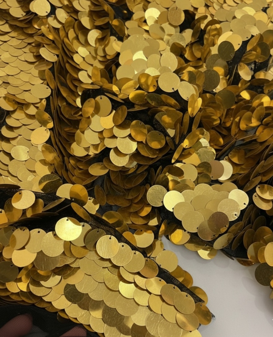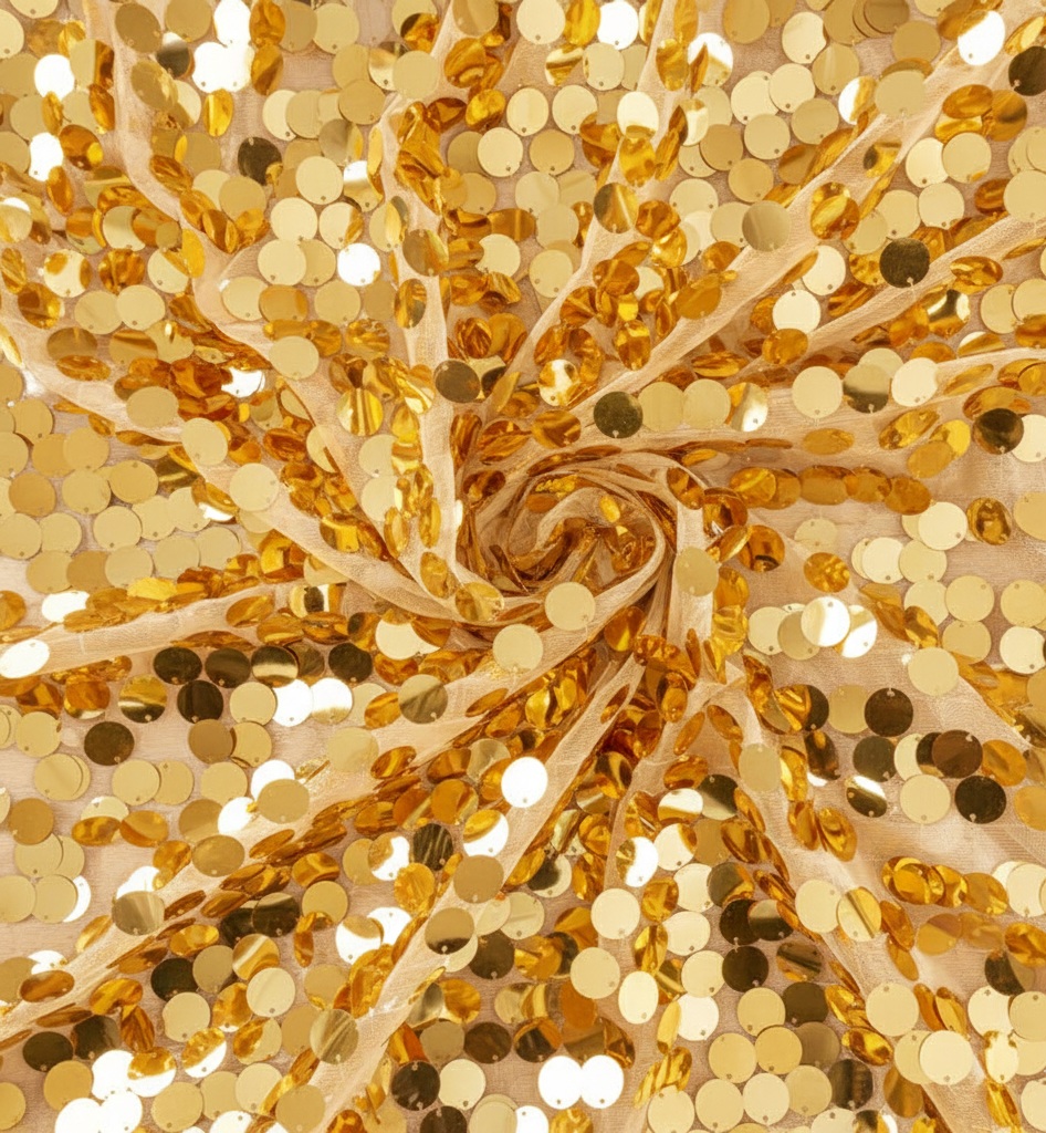Розкішна та святкова паєткова тканина “Сяйво Копійок” на сітці. Великі круглі золоті паєтки діаметром 8 мм ефектно виділяються на фоні, забезпечуючи багатий блиск та вишукану текстуру. Це втілення гламуру для створення незабутніх вечірніх суконь, блискучих сценічних образів та ексклюзивних елементів декору, що підкреслюють статус та стиль