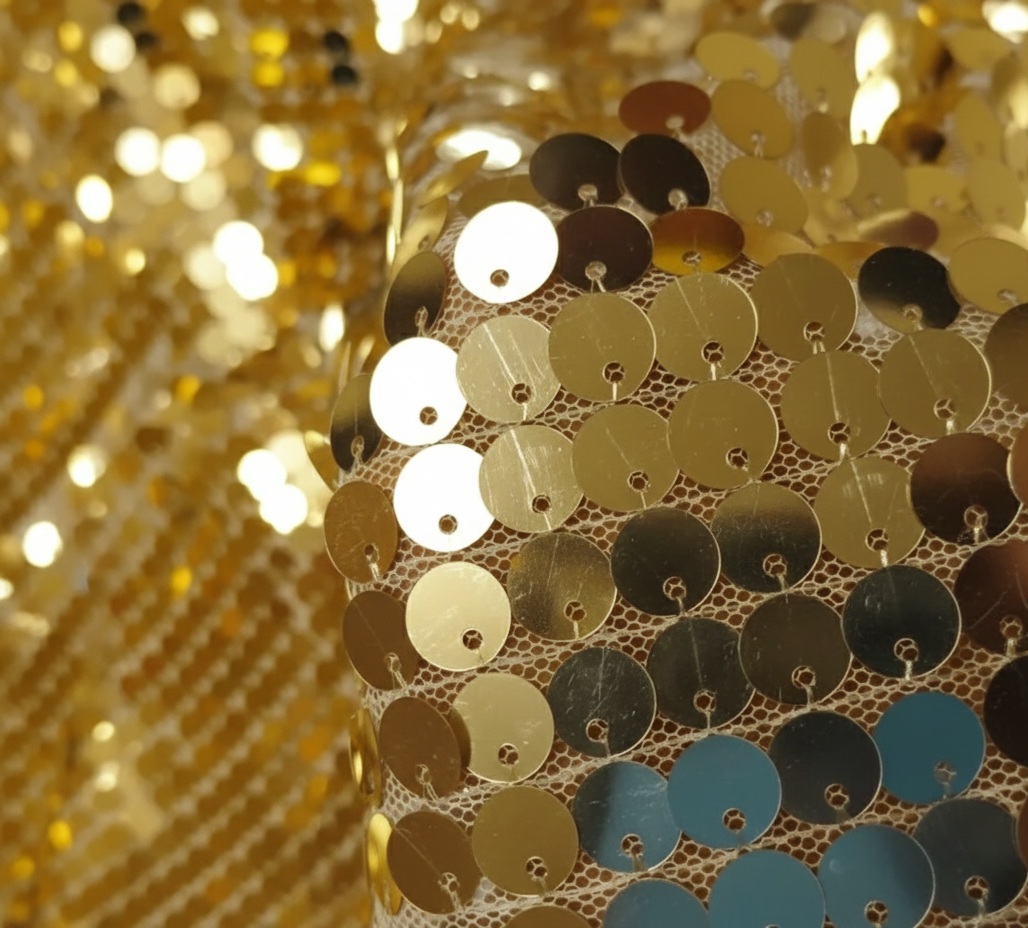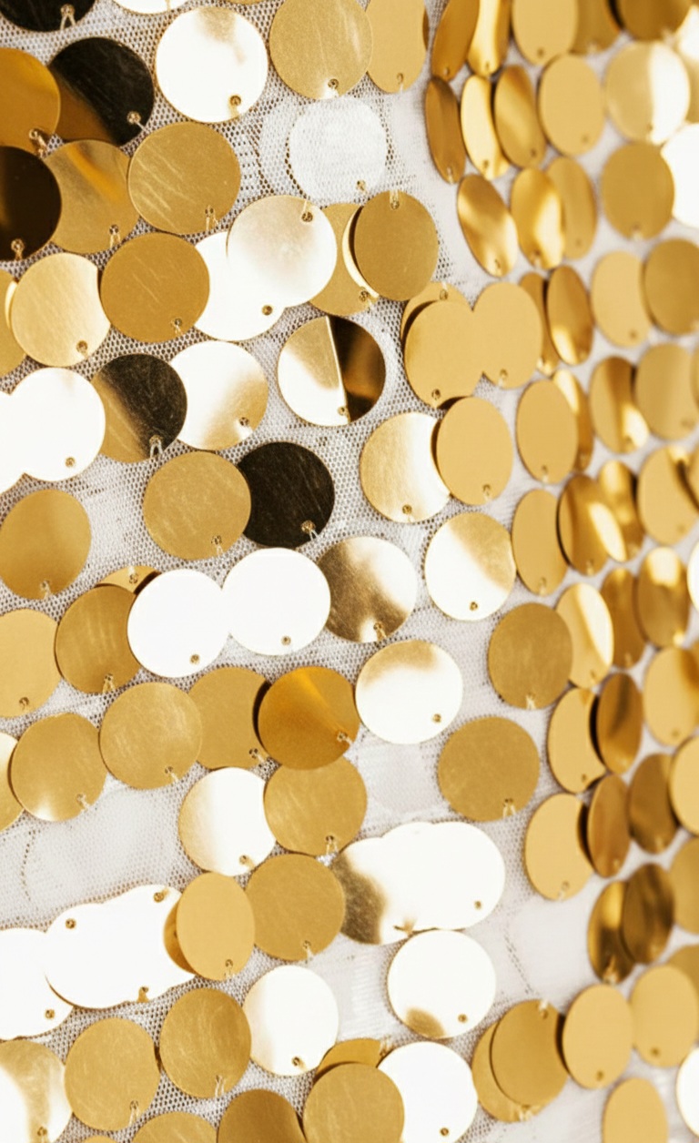 Опис тканини з великими паєтками: “Сяйво Копійок” (Золото та Срібло) 🌟