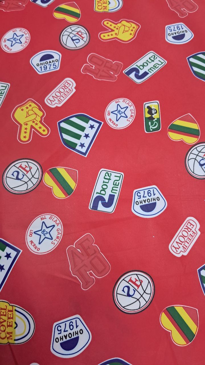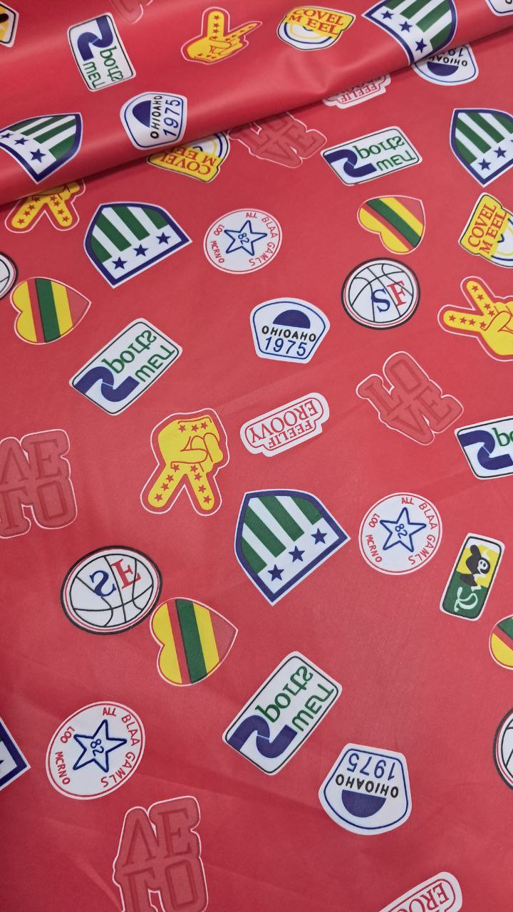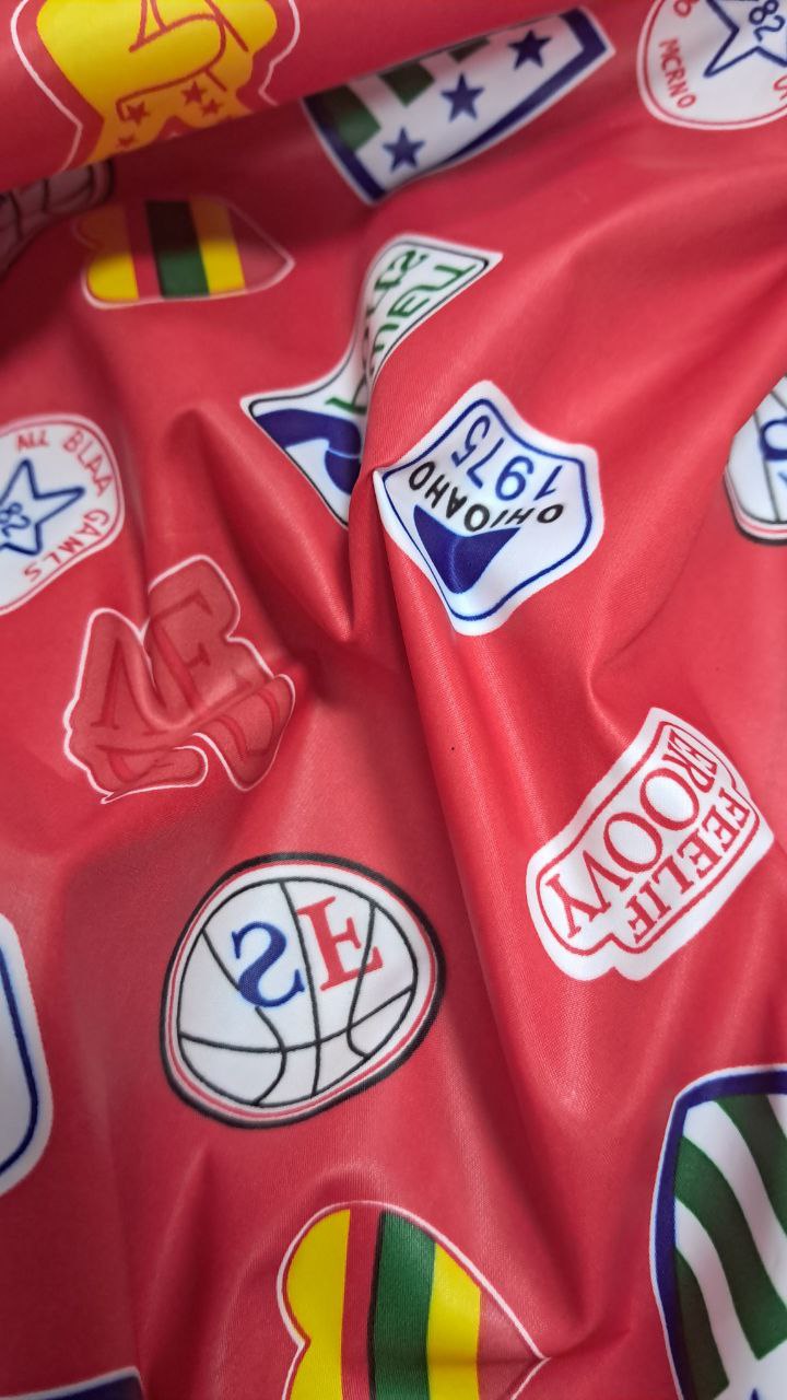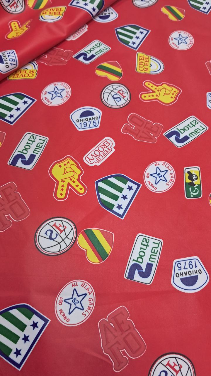 Динамічна та стильна плащова тканина насиченого червоно-коралового кольору, прикрашена різноманітними спортивними емблемами, значками та логотипами. Цей дизайн надає виробам сучасний та спортивний вигляд, що робить її чудовим вибором для активного стилю.
