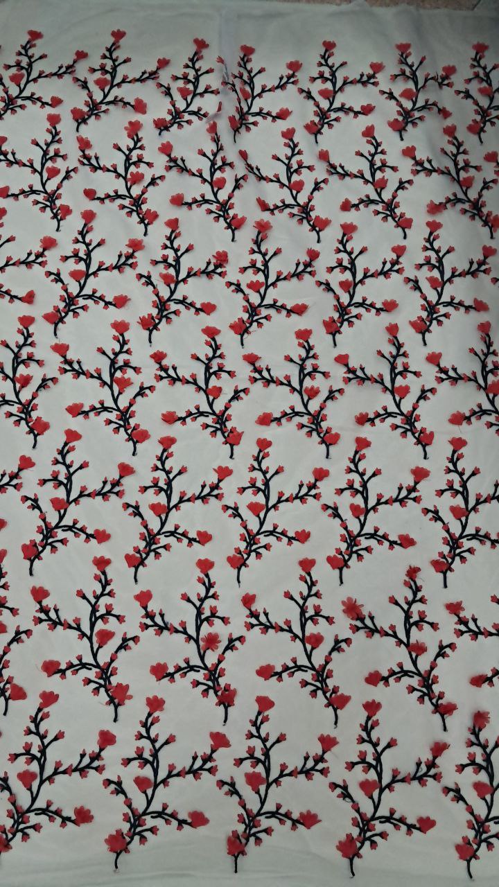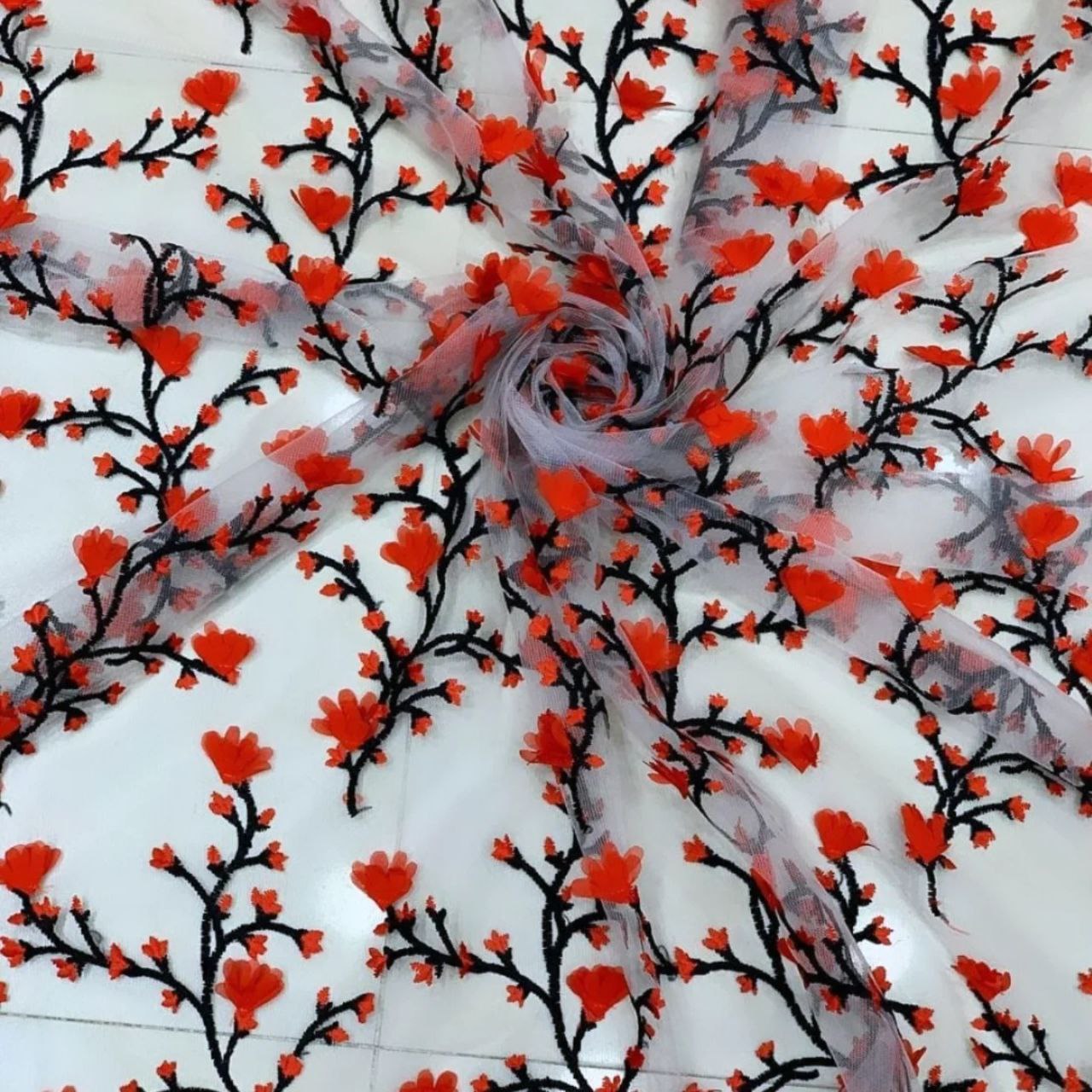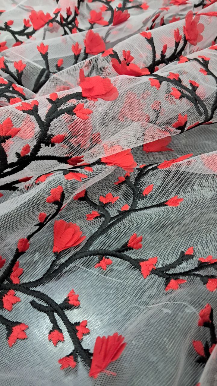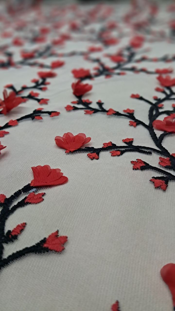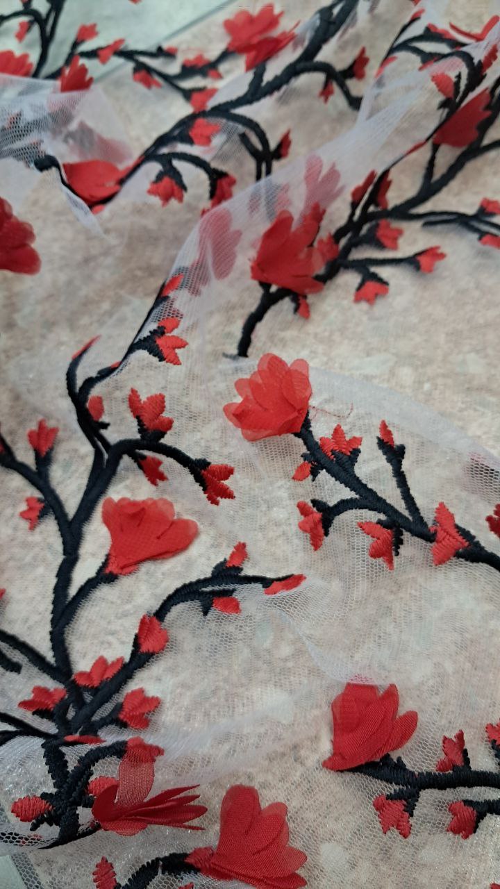 Легка та повітряна сітка, прикрашена витонченою 3D-вишивкою у вигляді гілочок сакури. Ця тканина вирізняється об’ємним візерунком, що створює ефектний та витончений вигляд. Основний малюнок складається з чорних вишитих гілочок і ніжних, об’ємних квітів, які додають матеріалу особливої романтичності.