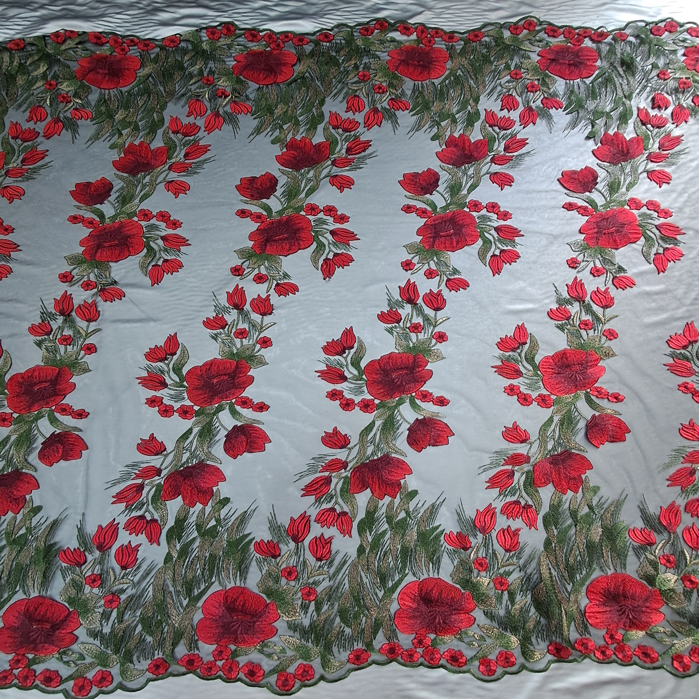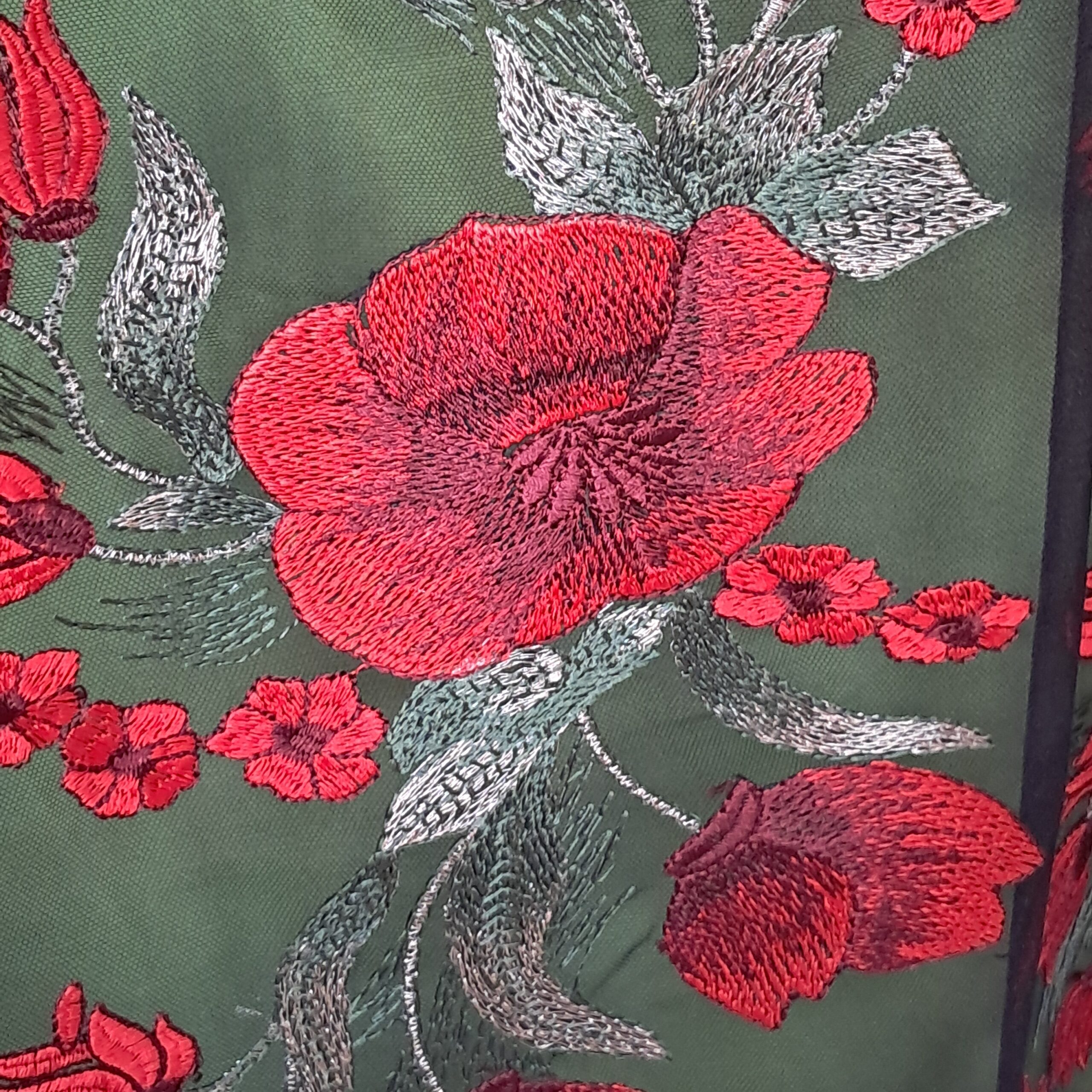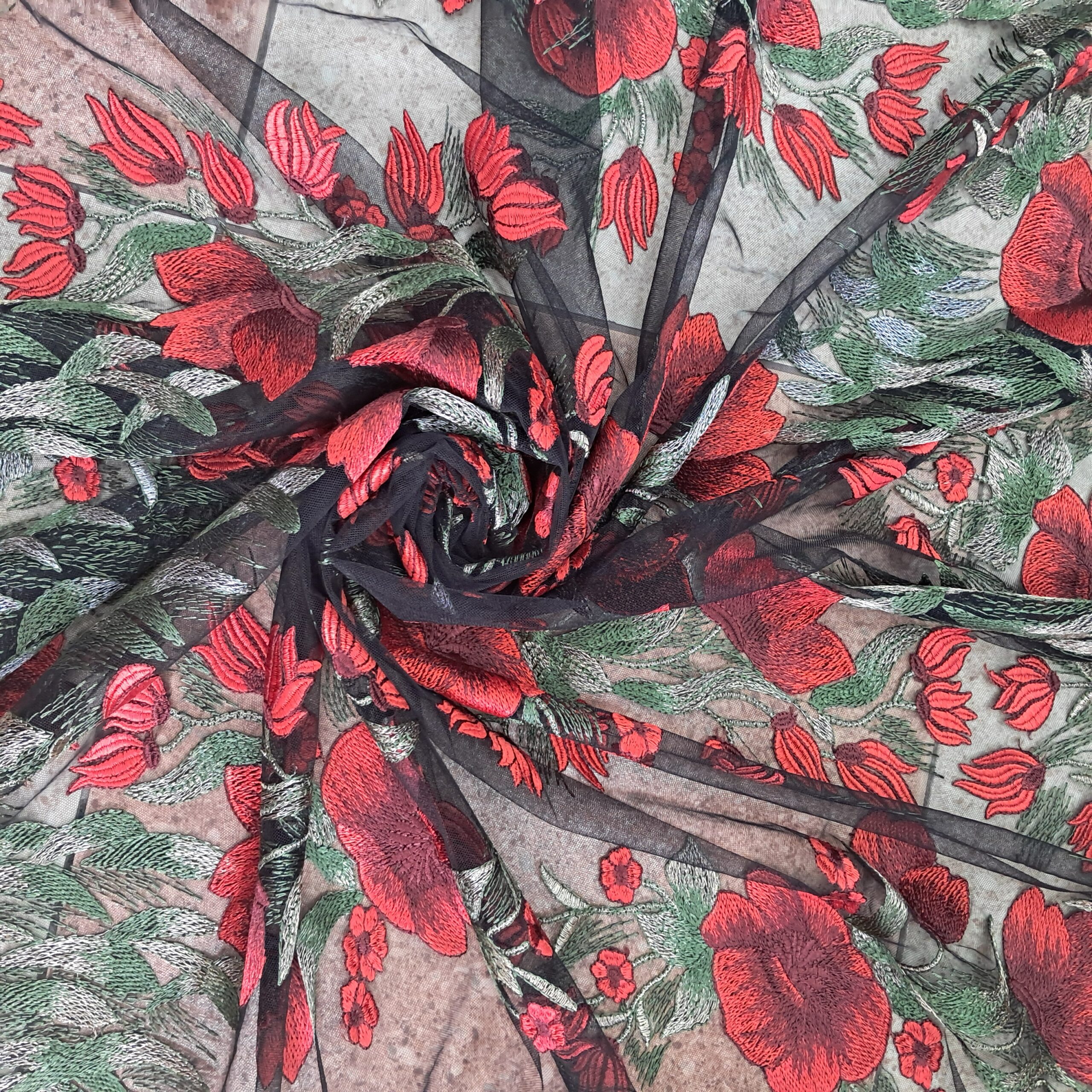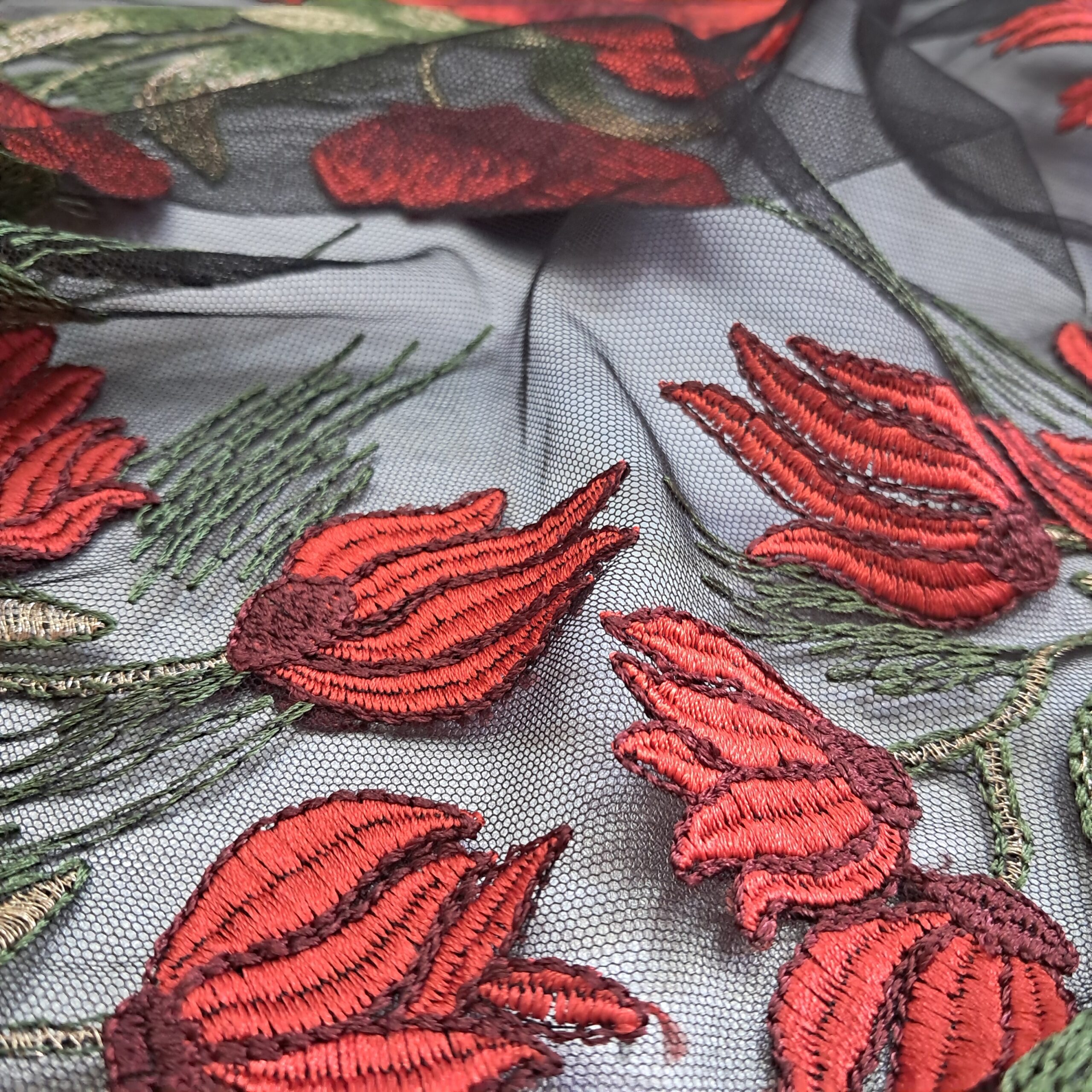 Особливості: Ця тканина поєднує в собі прозору основу з витонченим макраме-плетінням. Основна сітка — чорного кольору, прозора, що створює ефект легкості та загадковості. На цій основі виконана вишукана квіткова вишивка у вигляді маків, яка додає яскравості та контрасту. Вишиті елементи включають червоні квіти та зелені гілочки, що робить візерунок живим і об’ємним. Щільність 160 г/м² робить її міцною, а ширина 1.35 м зручною для розкрою.