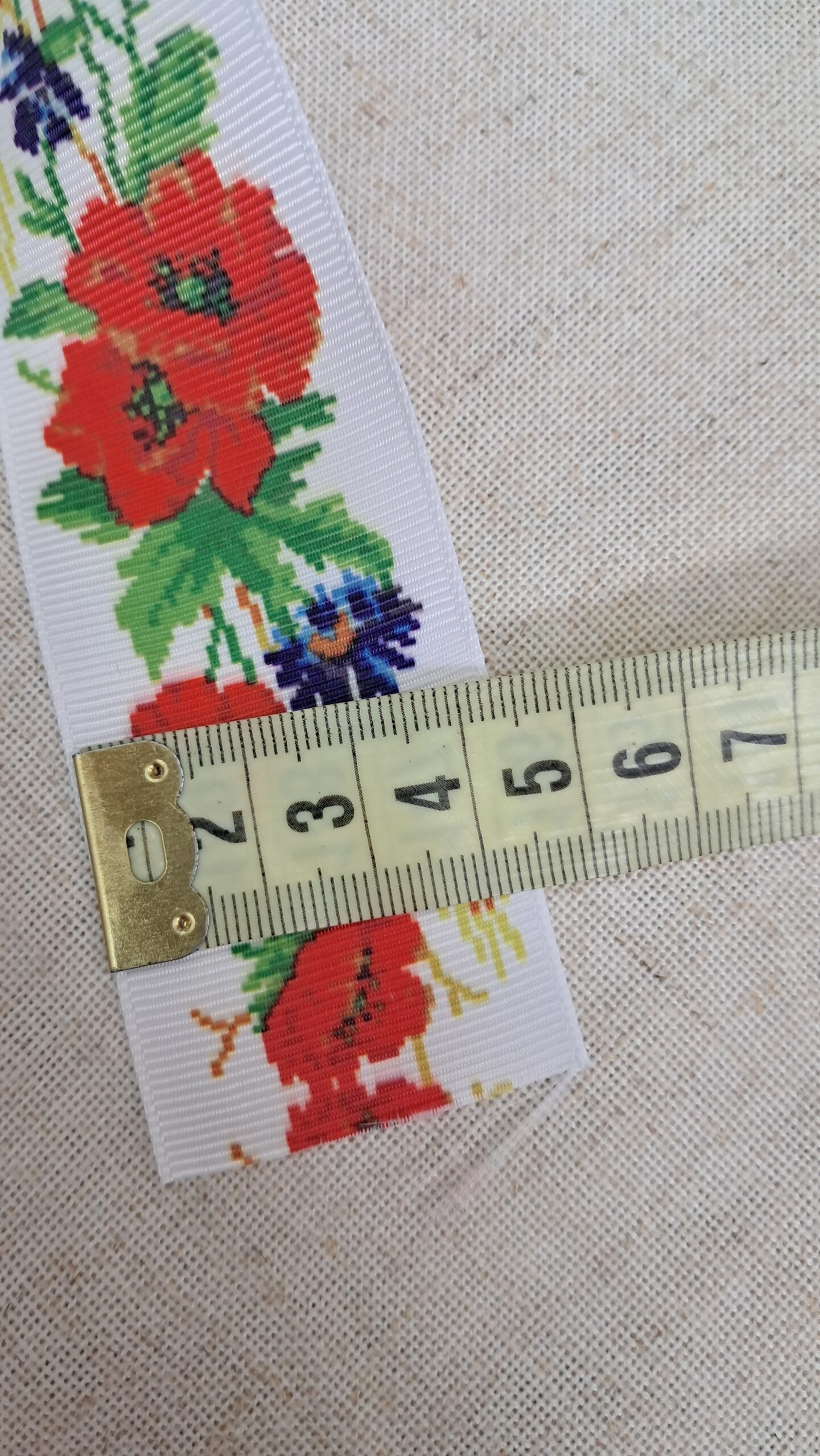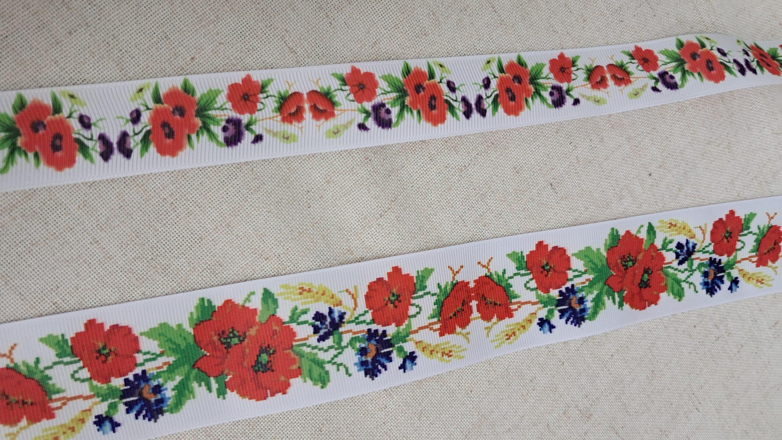 Чарівна репсова тасьма, що поєднує в собі класичну елегантність та яскравість українських народних мотивів. Виготовлена на основі якісної білої репсової стрічки, вона прикрашена вишуканим і виразним орнаментом, центральним елементом якого є соковиті червоні маки в обрамленні зеленого листя та, інших польових квітів. Контраст білого фону та насичених кольорів малюнка робить цю тасьму неймовірно помітною та привабливою, перетворюючи звичайний декоративний елемент на справжній акцент. Щільна та фактурна репсова тканина забезпечує міцність, зносостійкість і добре тримає форму.