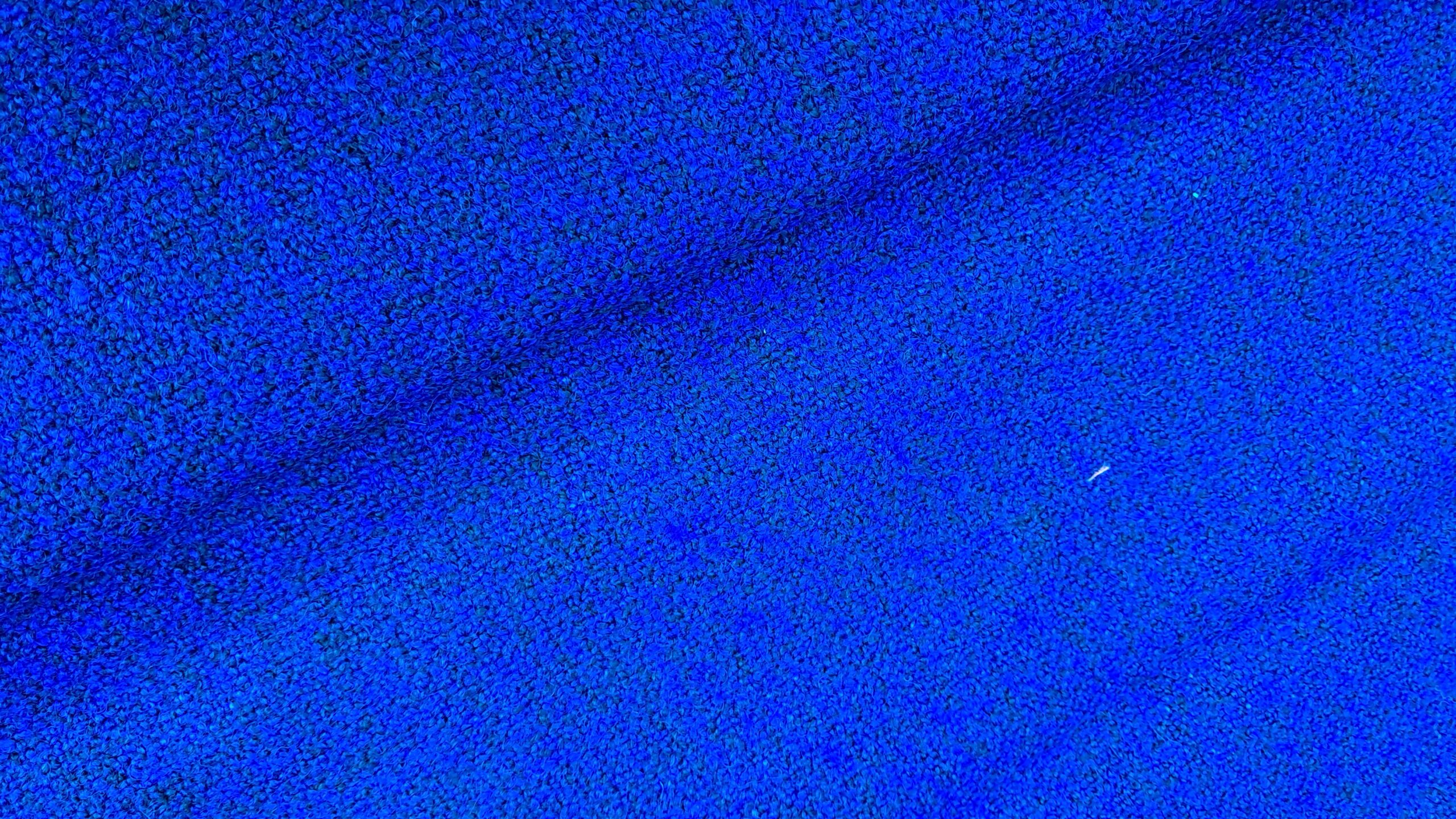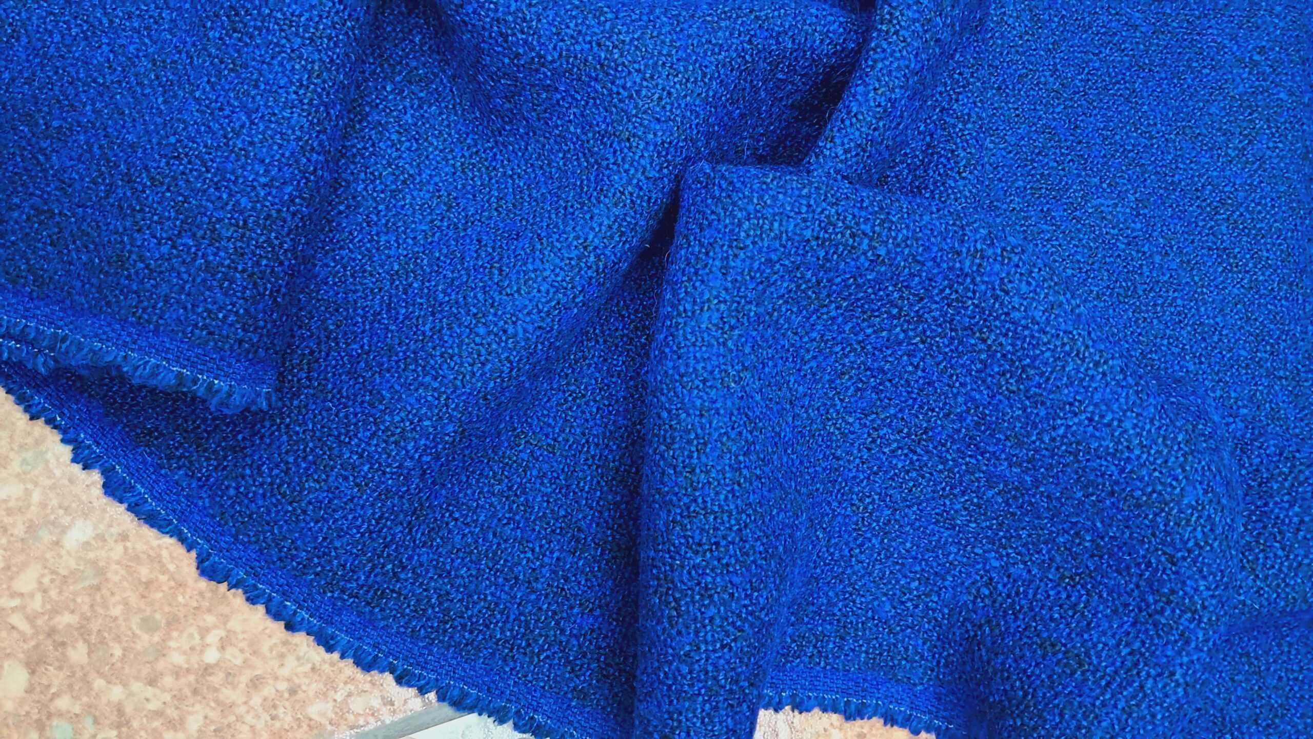 Це вишукана та елегантна тканина твід-букле, що вражає своєю унікальною фактурою. Полотно має складне переплетення ниток, яке створює характерну дрібнопетельчасту або вузликову поверхню. Кольорова гама є особливо цікавою: в’язка поєднує нитки двох відтінків, що надає матеріалу візуальної глибини та багатогранності. Тканина доступна в двох варіантах: синьо-блакитному (електрик синій з темно-синім) та бордовому (з червоним). Завдяки наявності вовни у складі, тканина є приємною на дотик та теплою, що робить її ідеальною для холодного сезону. При цьому, поліестер забезпечує практичність, стійкість до зношування та збереження форми. Цей матеріал чудово тримає форму, що дозволяє створювати структуровані та елегантні вироби.