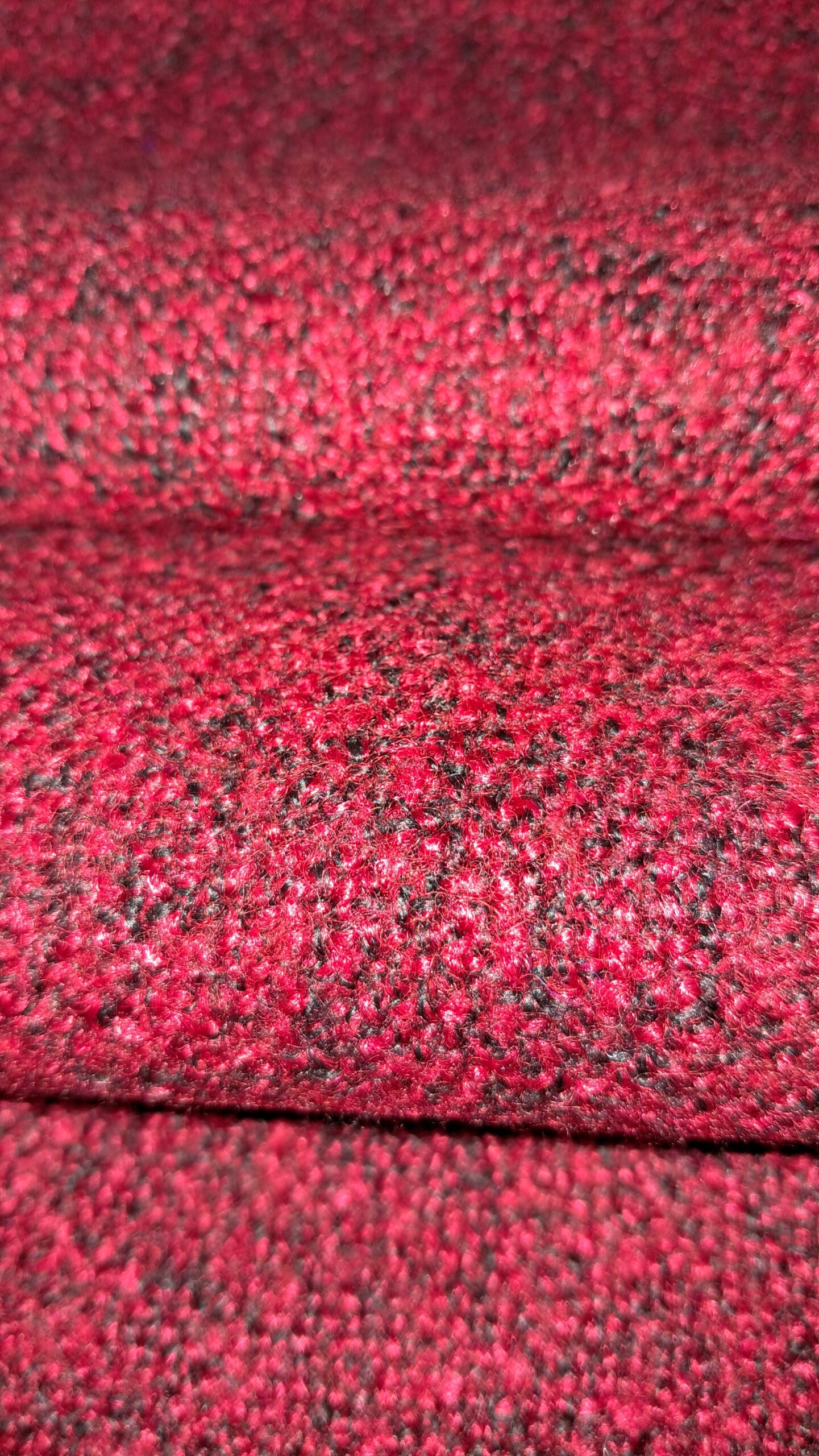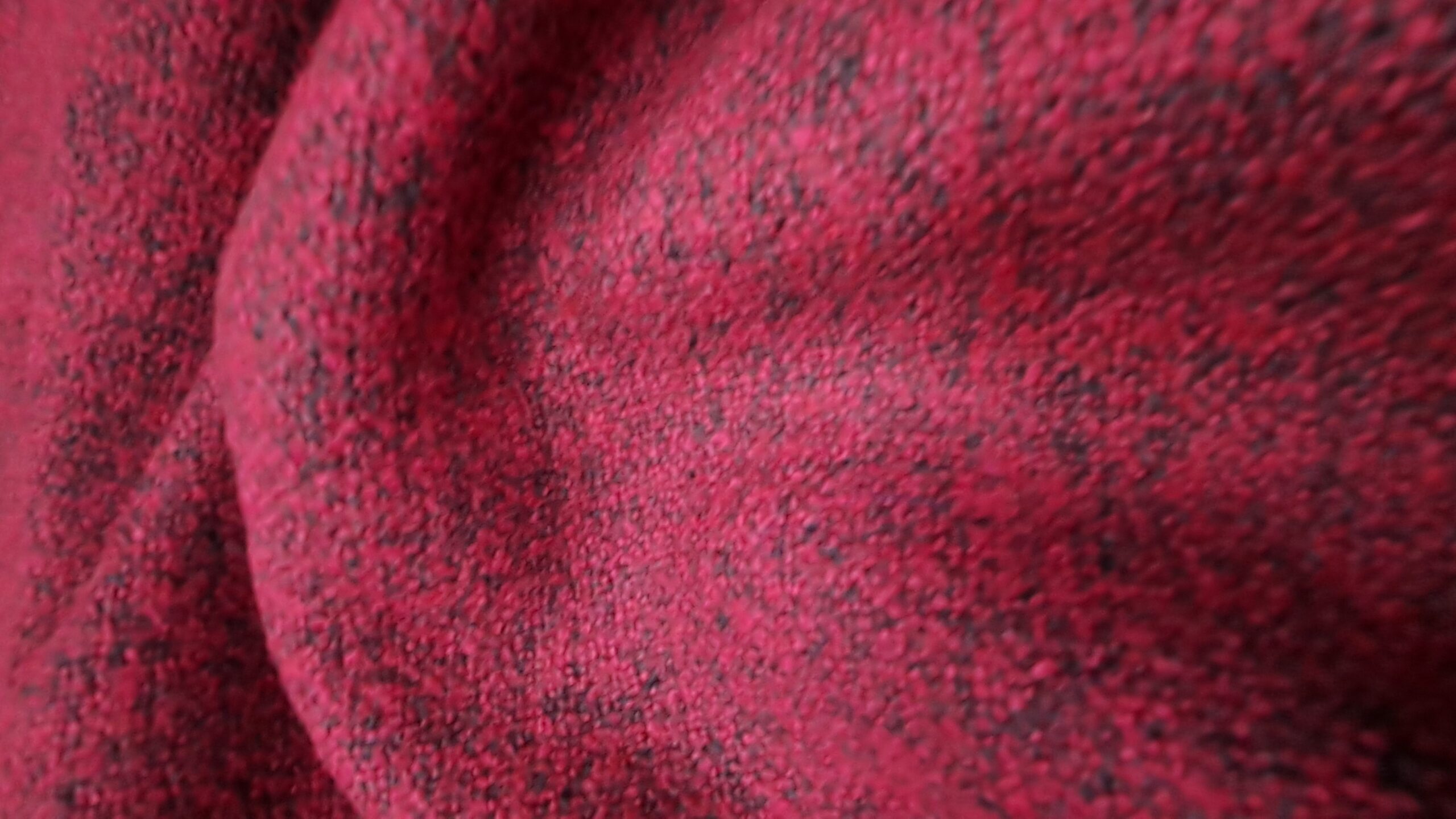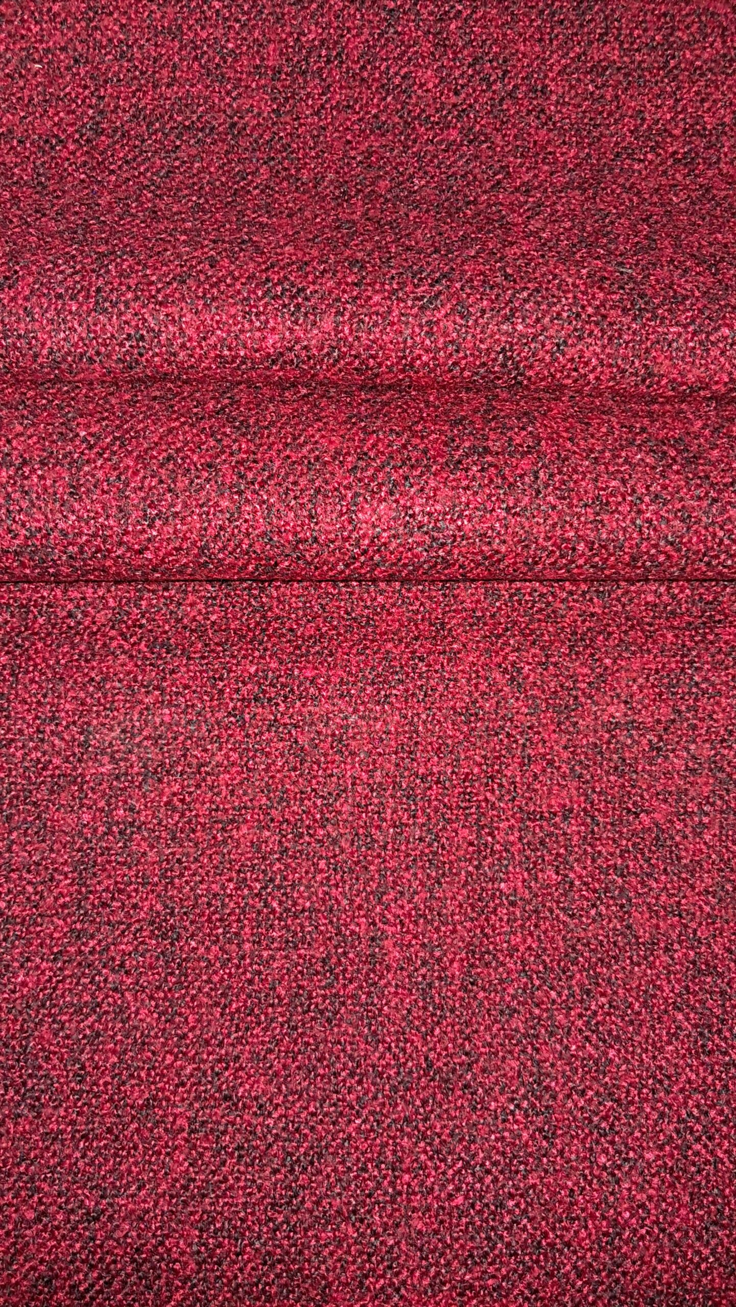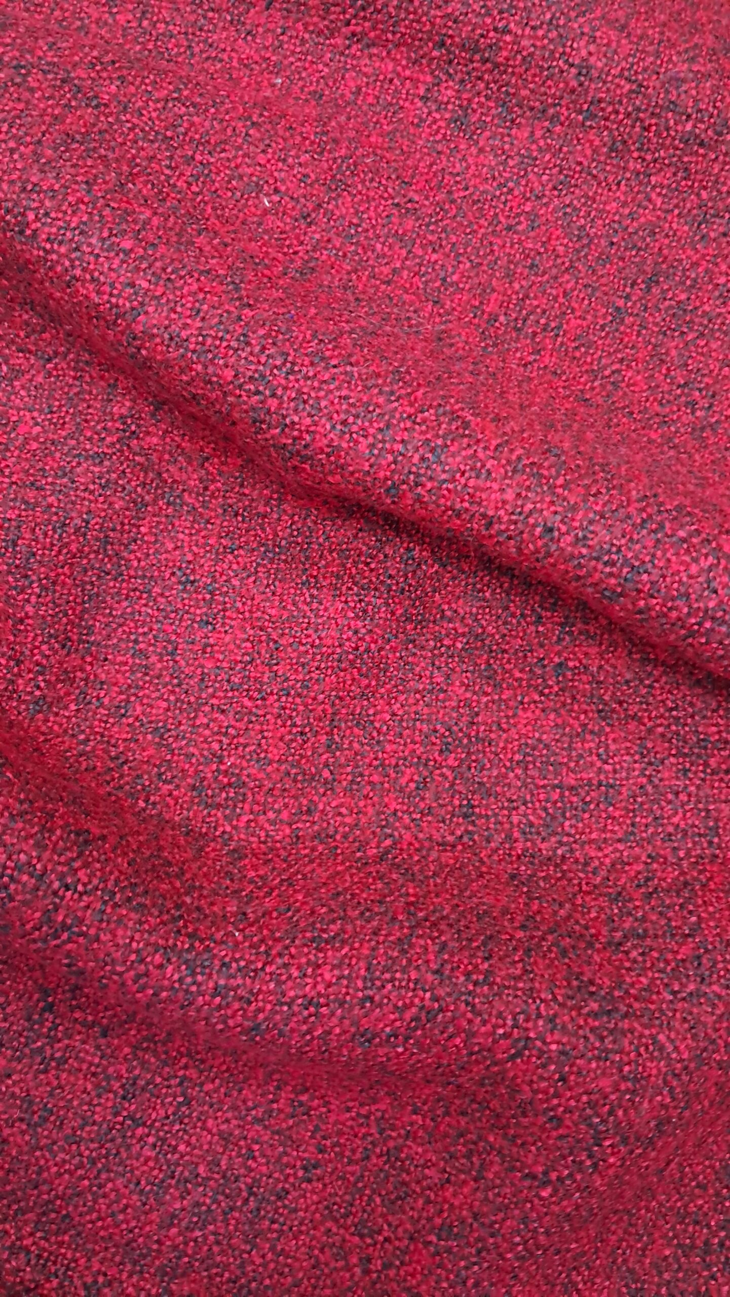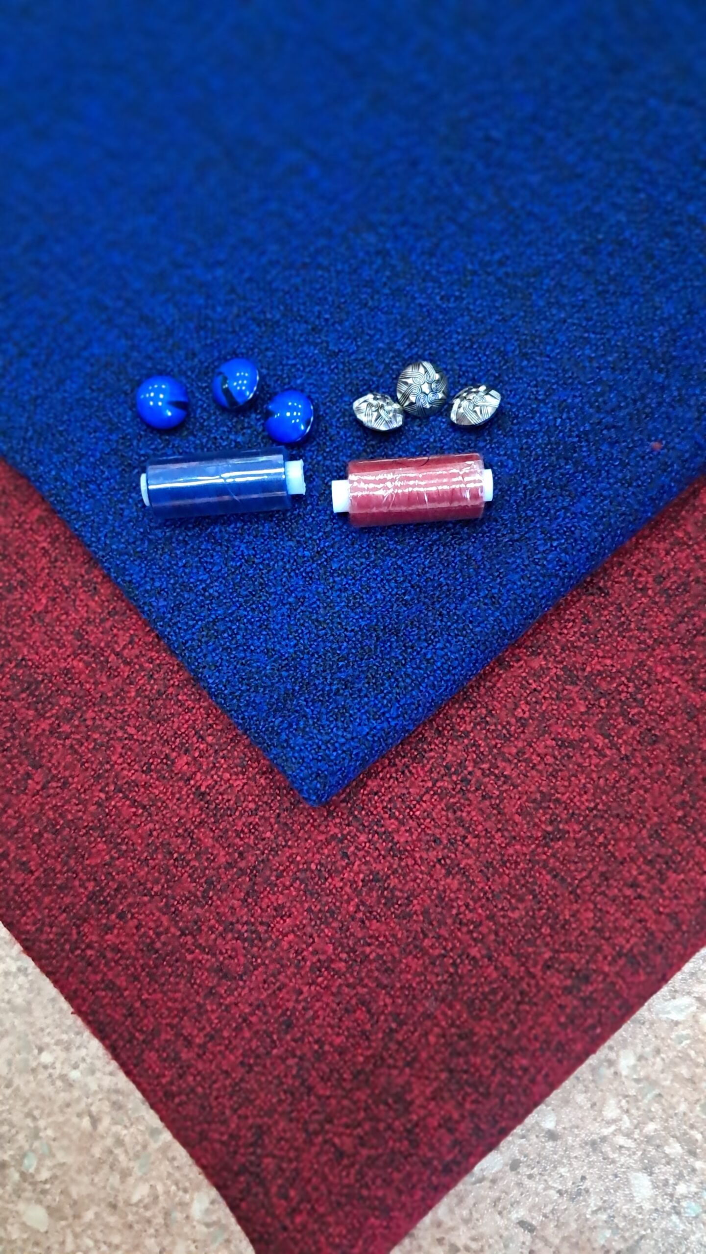 Це вишукана та елегантна тканина твід-букле, що вражає своєю унікальною фактурою. Полотно має складне переплетення ниток, яке створює характерну дрібнопетельчасту або вузликову поверхню. Кольорова гама є особливо цікавою: в’язка поєднує нитки двох відтінків, що надає матеріалу візуальної глибини та багатогранності. Тканина доступна в двох варіантах: синьо-блакитному (електрик синій з темно-синім) та бордовому (з червоним). Завдяки наявності вовни у складі, тканина є приємною на дотик та теплою, що робить її ідеальною для холодного сезону. При цьому, поліестер забезпечує практичність, стійкість до зношування та збереження форми. Цей матеріал чудово тримає форму, що дозволяє створювати структуровані та елегантні вироби.