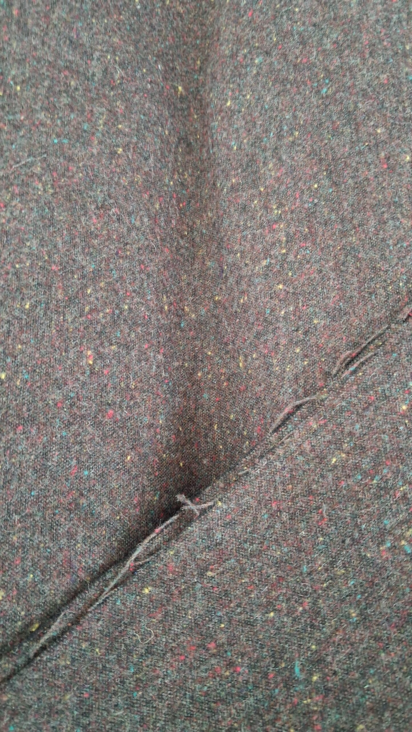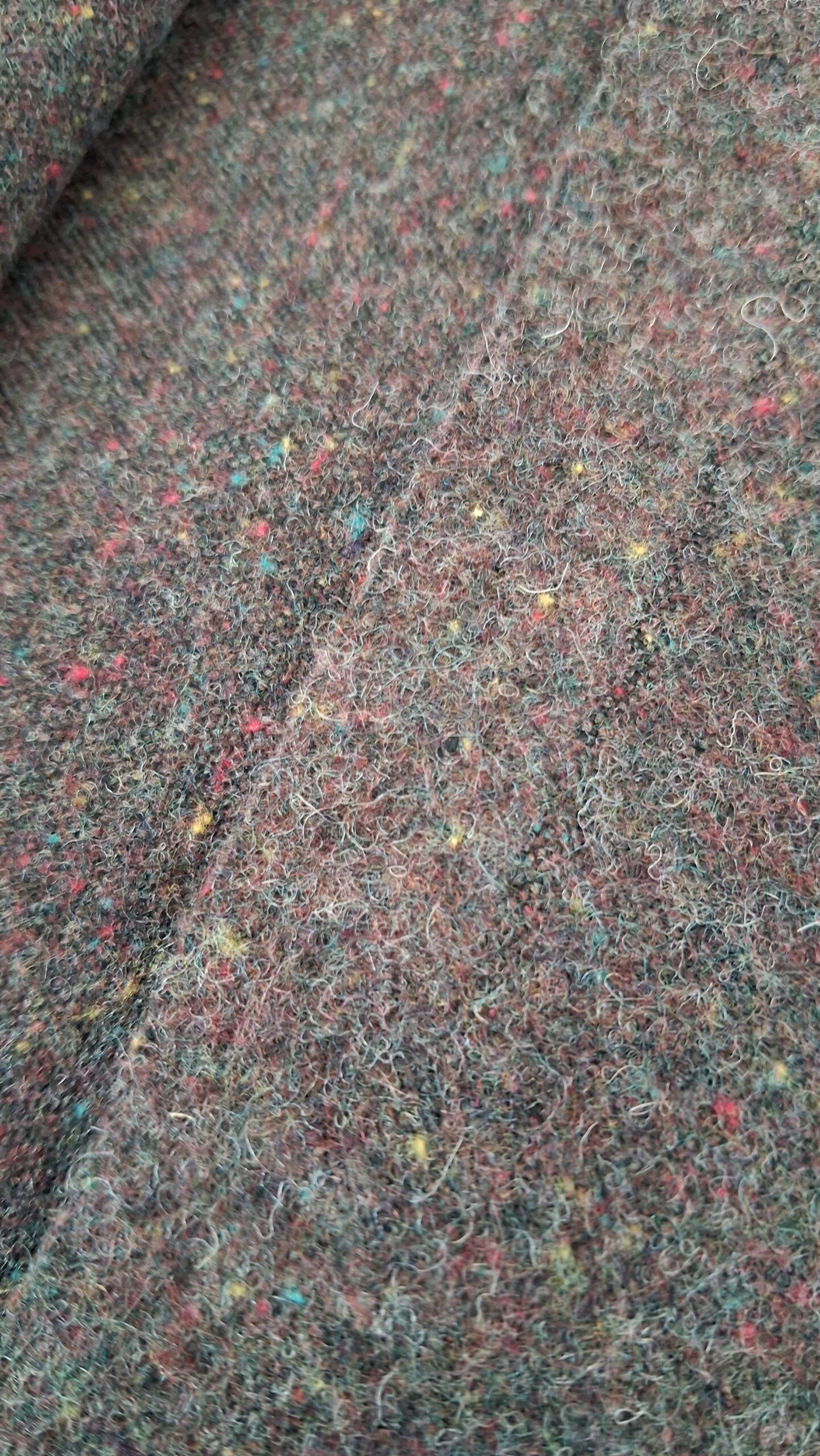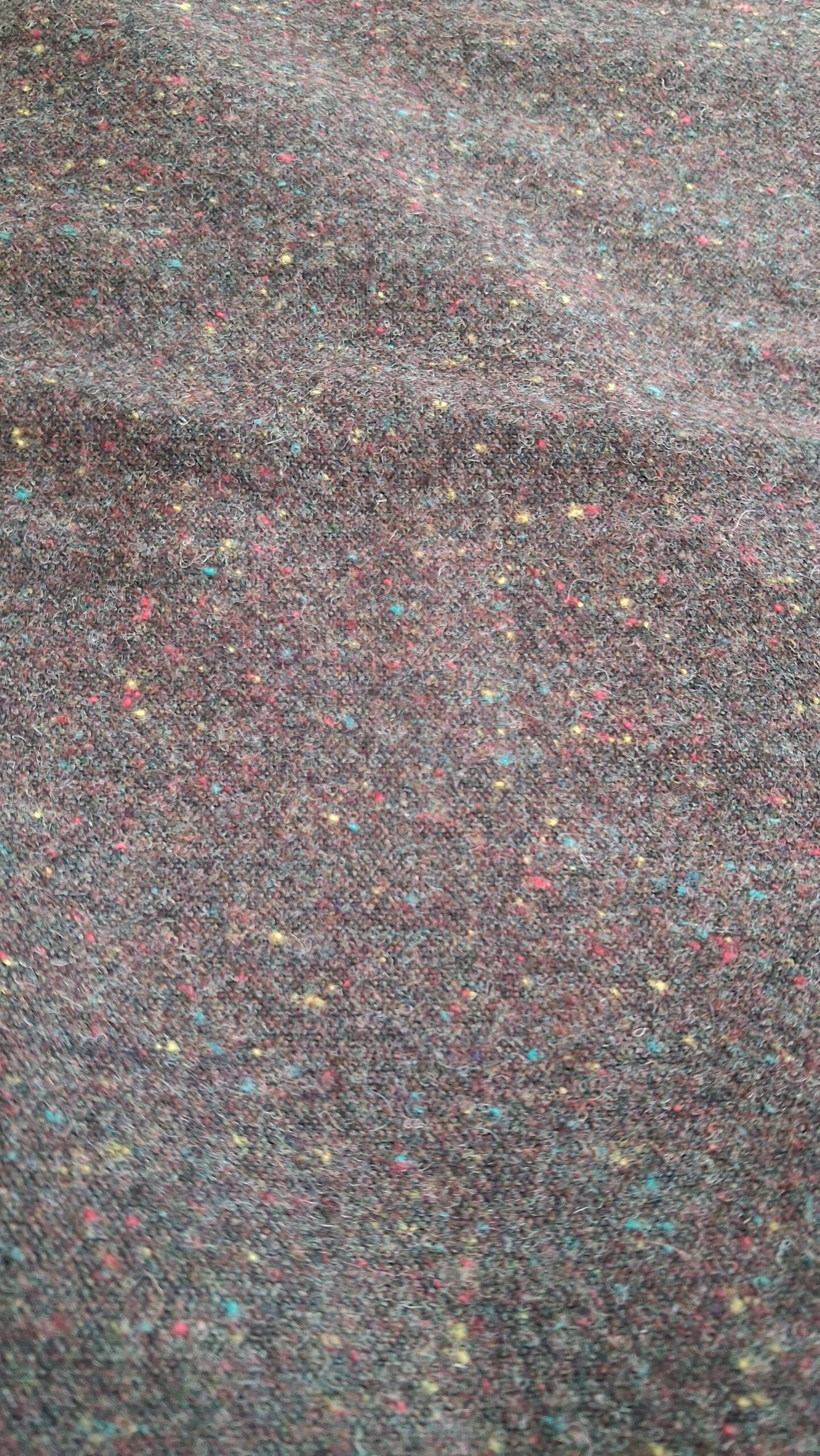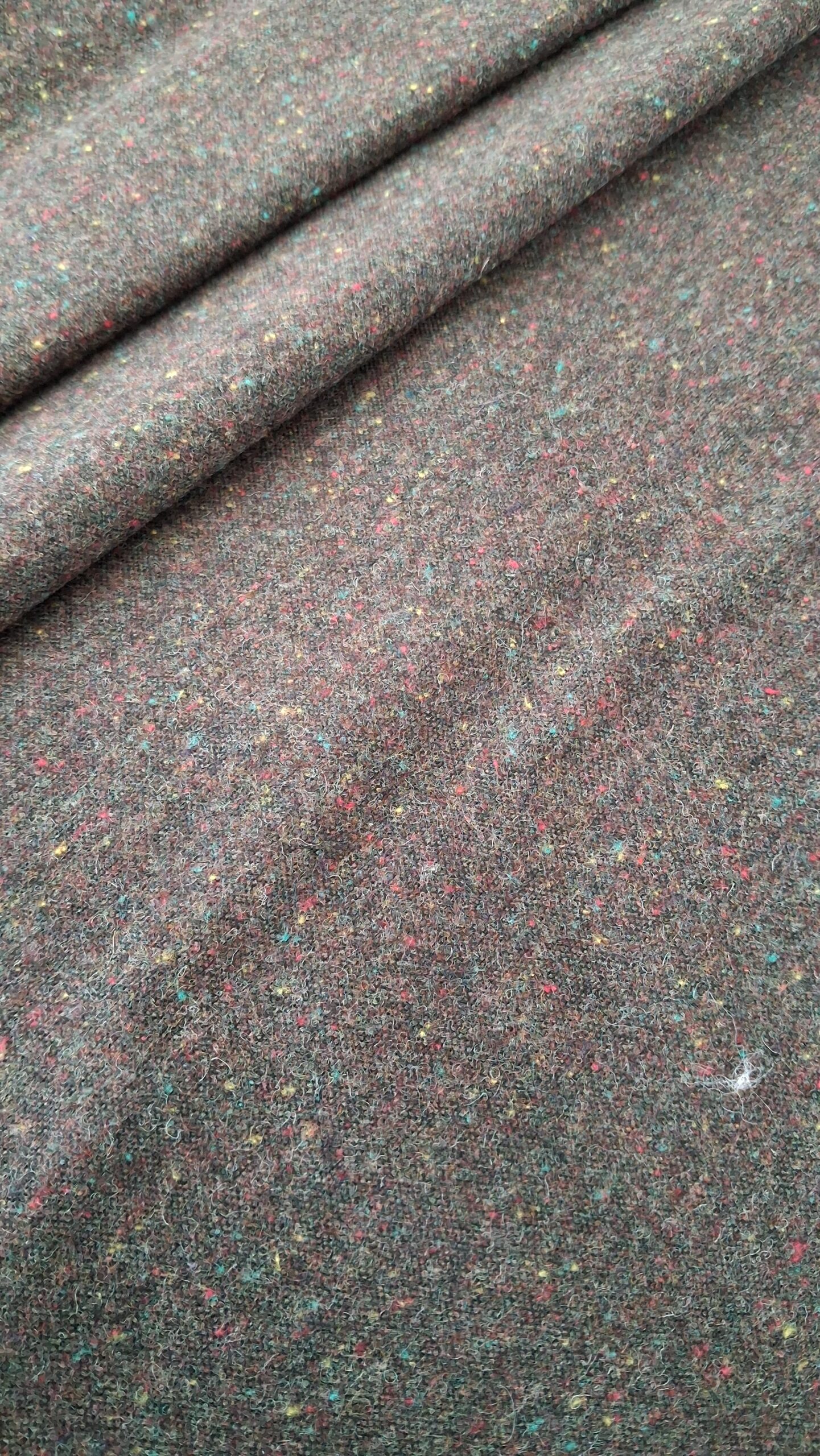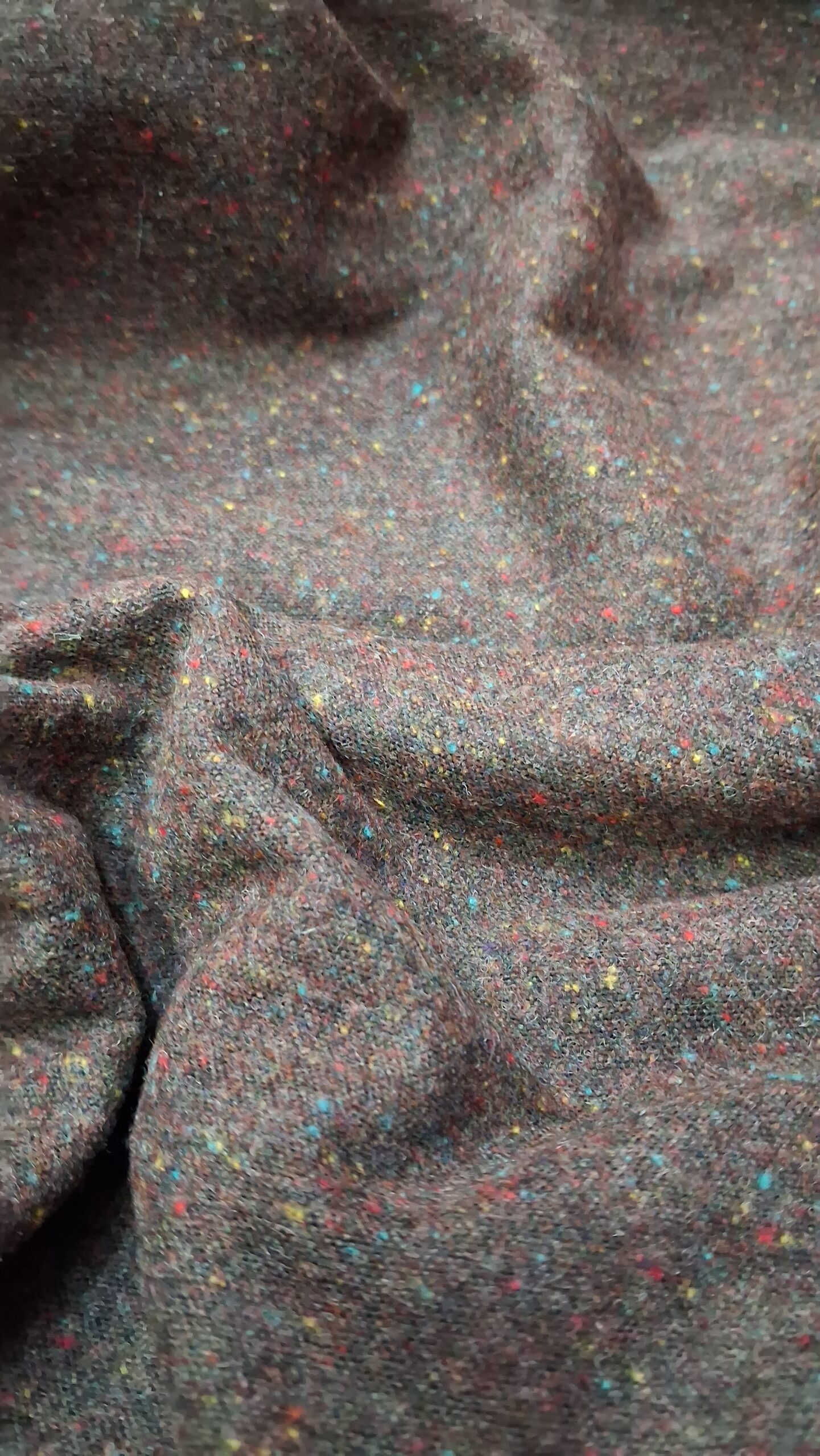 Твід — це класична, високоякісна вовняна тканина, яка є втіленням затишку, міцності та елегантності. Її легко впізнати за характерним меланжевим тлом, по якому хаотично розкидані маленькі, яскраві, кольорові вкраплення (вузлики або флеки). Ці вкраплення надають матеріалу унікальної глибини та грайливого, але шляхетного вигляду. Завдяки високій щільності та натуральному складу, цей твід ідеально підходить для створення теплого, практичного та довговічного одягу, який залишається актуальним поза часом.