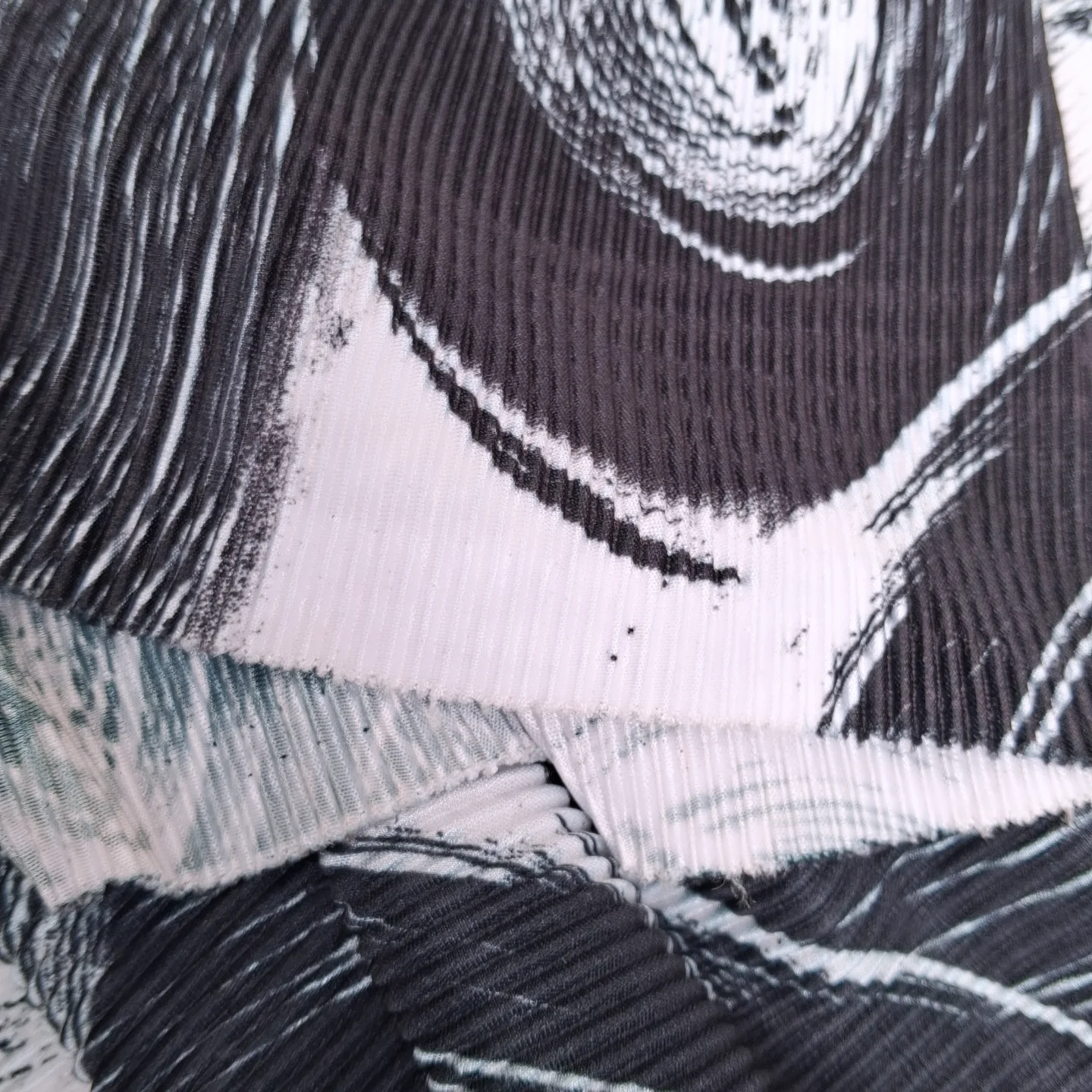 Трикотаж гофре — легка, пластична тканина з дрібною плісировкою, що не блищить і не торочиться. Ідеальна для суконь, спідниць та брюк палацо.