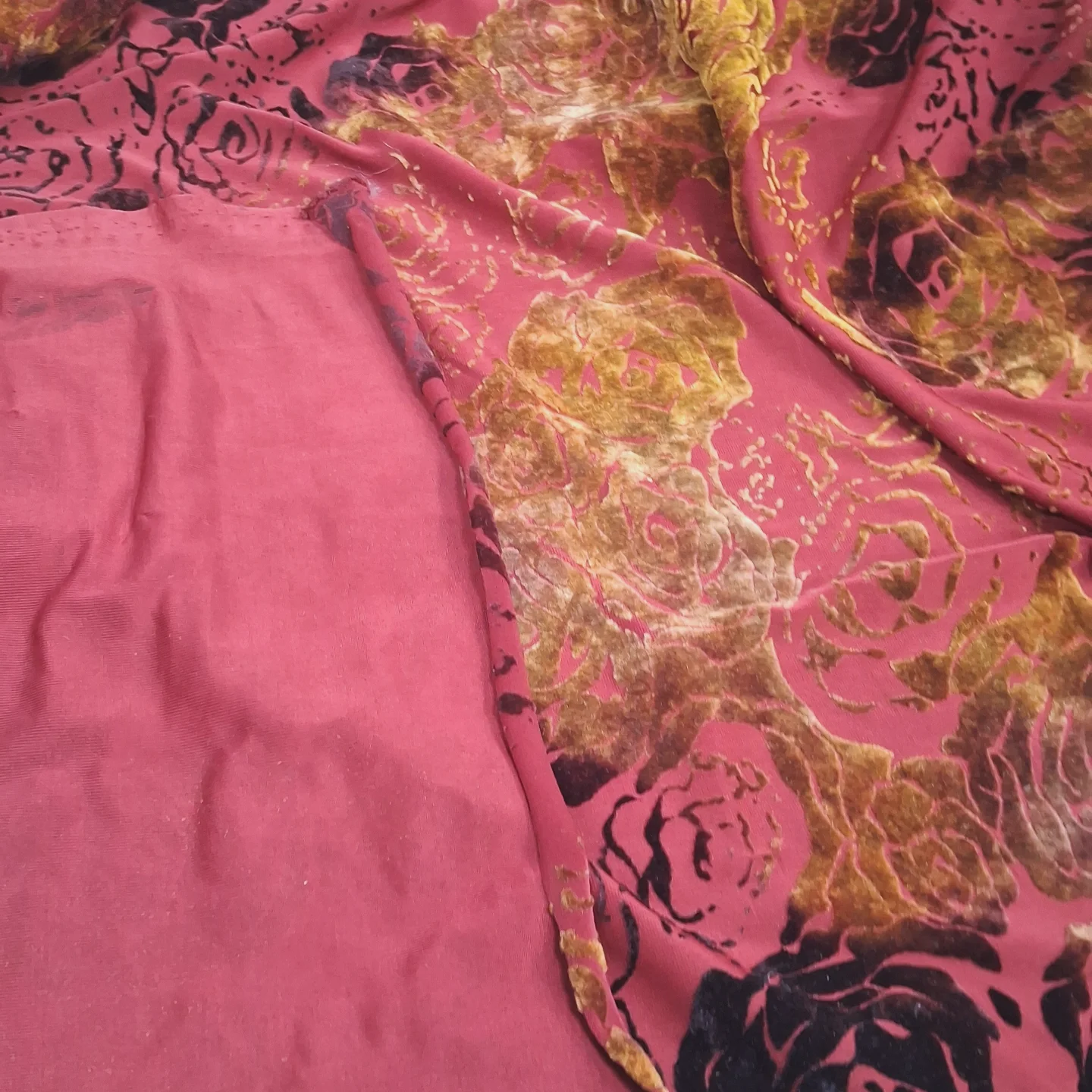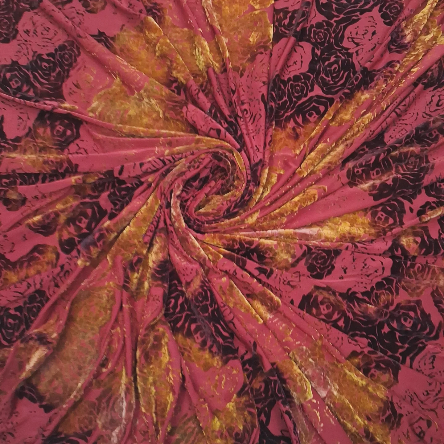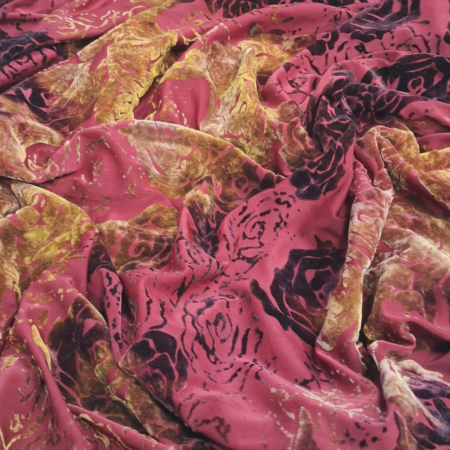 Елегантний та розкішний Трикотаж “Спаун” з оксамитовим орнаментом – це ідеальне поєднання комфорту та вишуканого стилю. Тканина має еластичну трикотажну основу, на яку нанесено виразний оксамитовий (пан-бархат) візерунок у насичених тонах. Це створює глибокий 3D-ефект, гру світла і тіні, надаючи виробам справжньої урочистості та шику. Завдяки високій стрейчевості та приємній текстурі, матеріал ідеально сідає по фігурі, забезпечуючи максимальний комфорт при носінні та чудове драпірування.