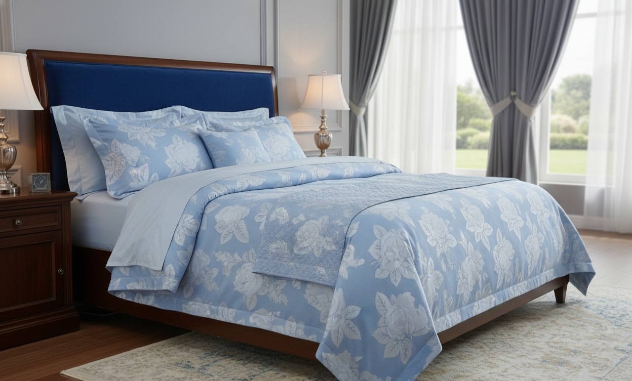 Тік набивний (блакитний з трояндами) – щільна 100% бавовняна тканина з квітковим принтом. Ідеальна для постільної білизни, наперників та домашнього текстилю. Міцна, приємна на дотик, гіпоалергенна.