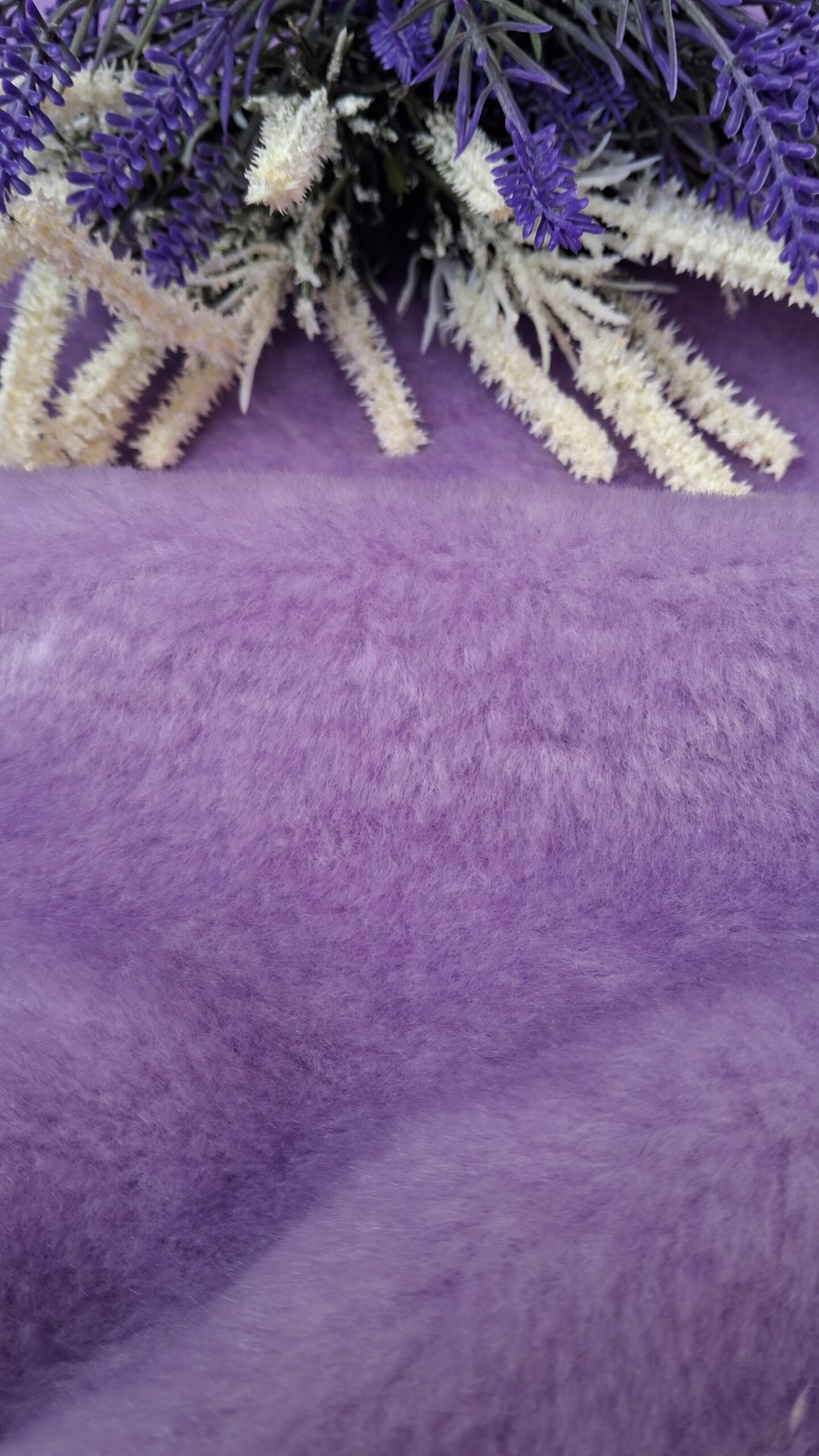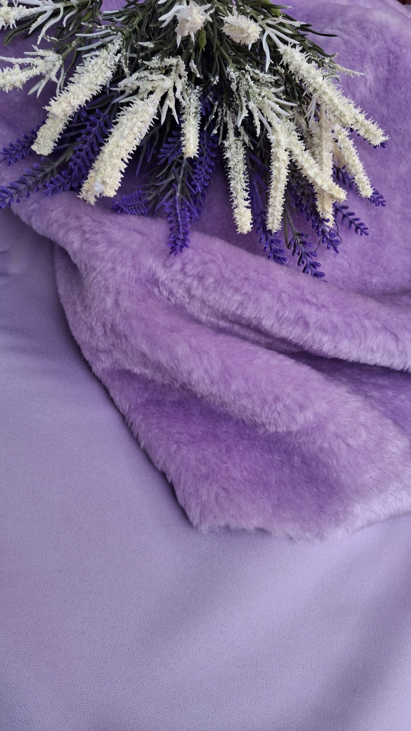 Це м’яке та затишне штучне хутро у трендовому лавандовому відтінку. Воно ідеально імітує натуральний матеріал, але при цьому є повністю етичним та значно простішим у догляді. Завдяки короткій, рівномірній та щільній ворсистій структурі тканина має ніжний, плюшевий вигляд і дарує неймовірне відчуття тепла та комфорту. Лавандовий колір додає виробам особливої м’якості, романтичності та унікальності.