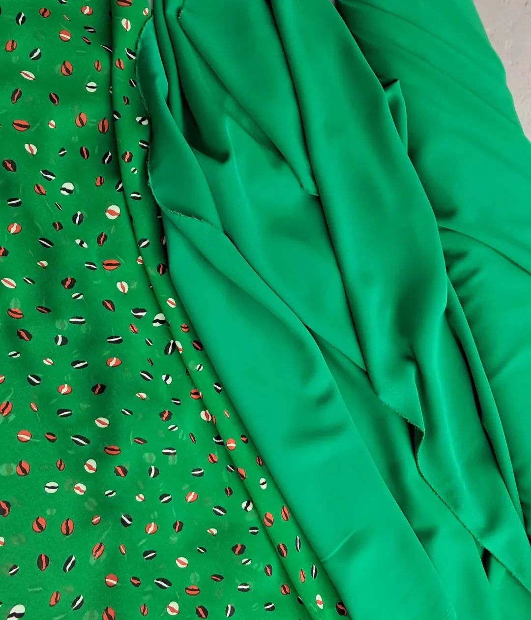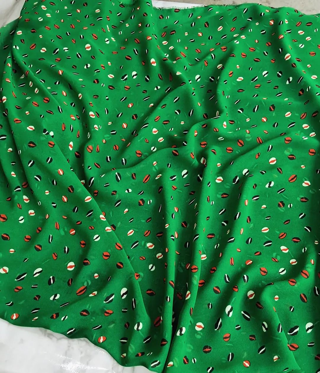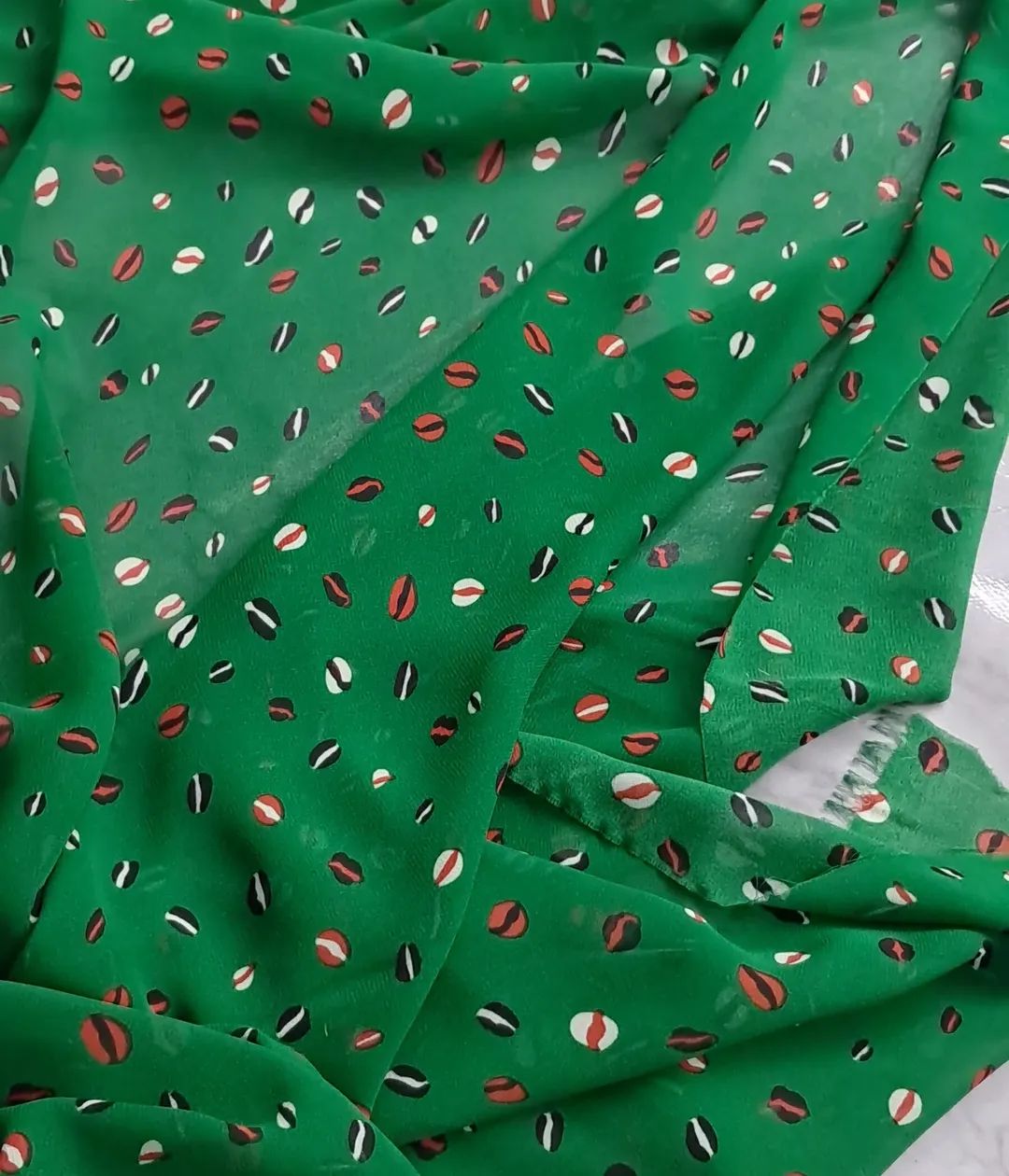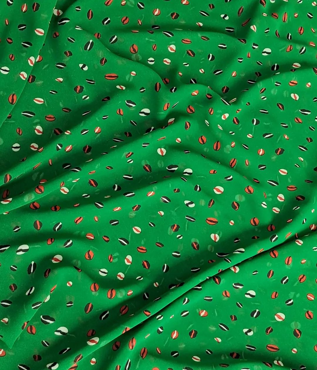 Неймовірно легкий шифон у соковитому, трав’яному зеленому кольорі з оригінальним принтом “кавових зерен”. 150 см ніжності та стилю для ваших повітряних блуз і суконь.