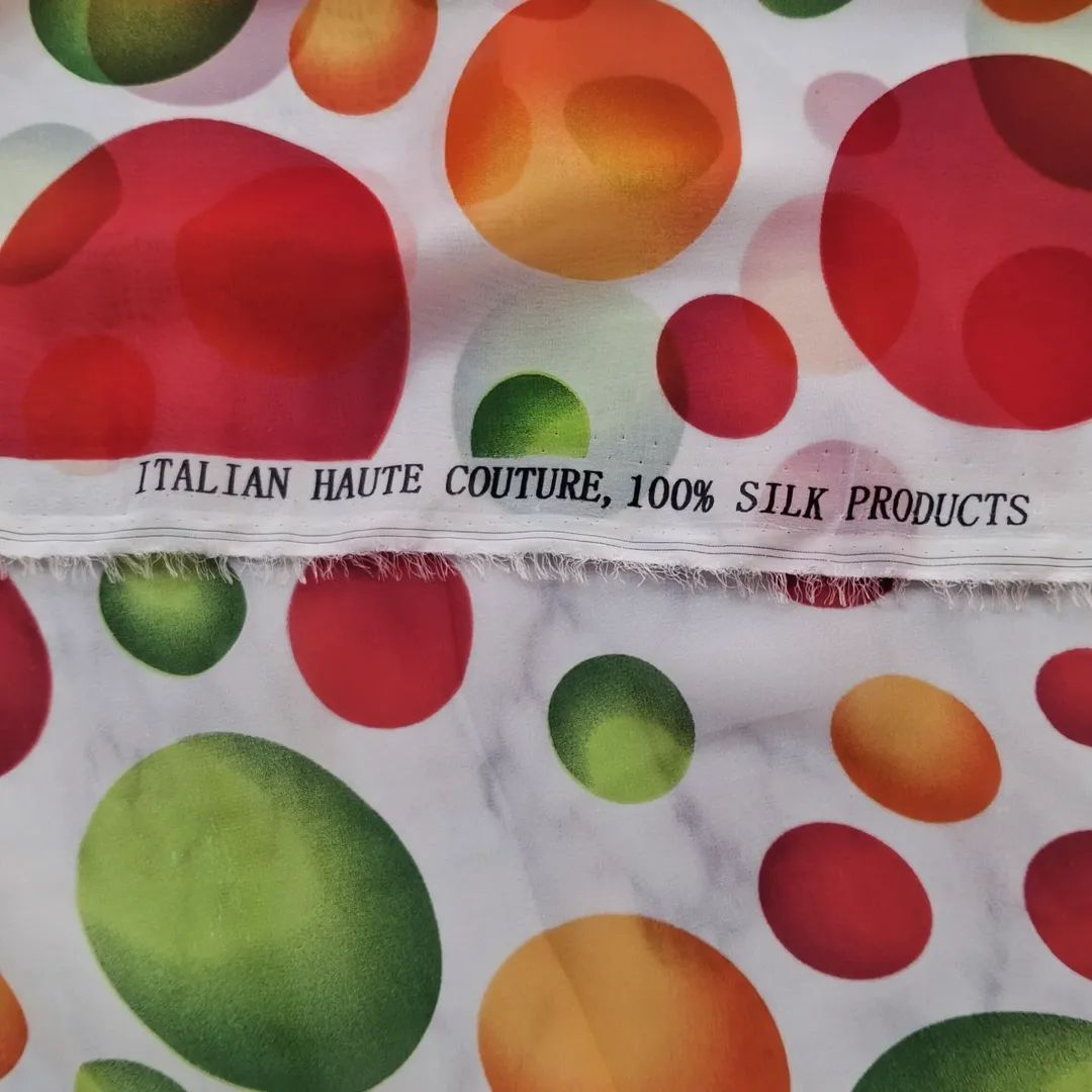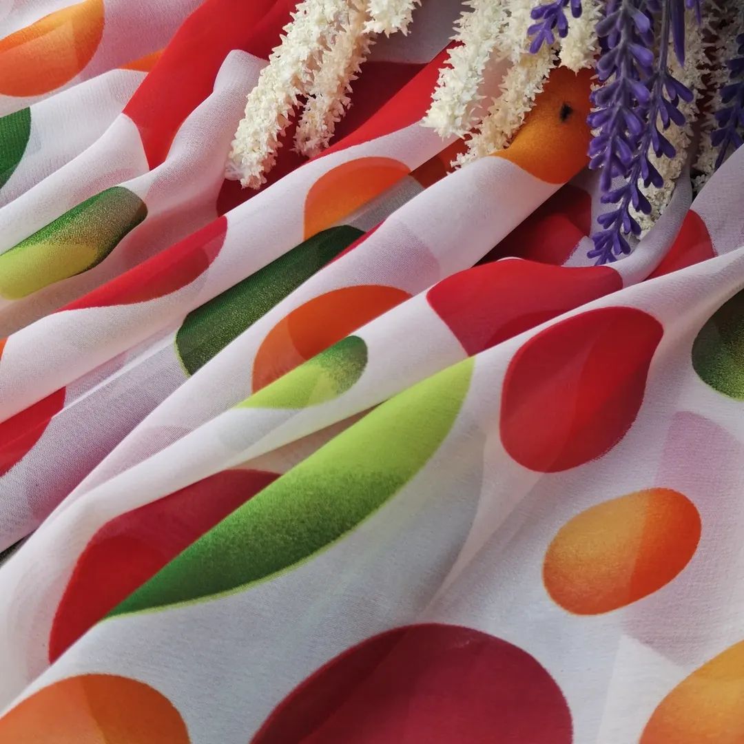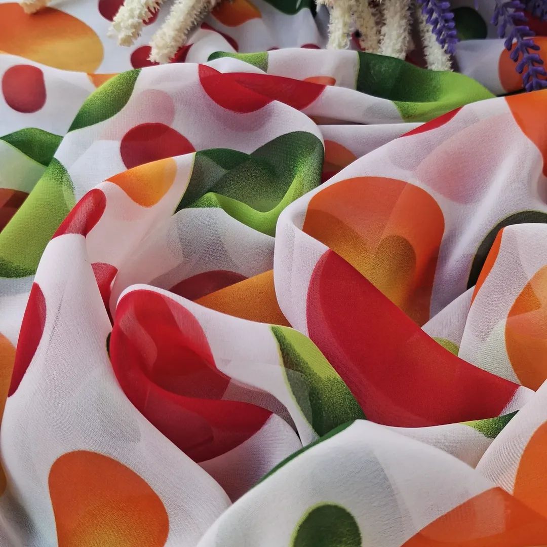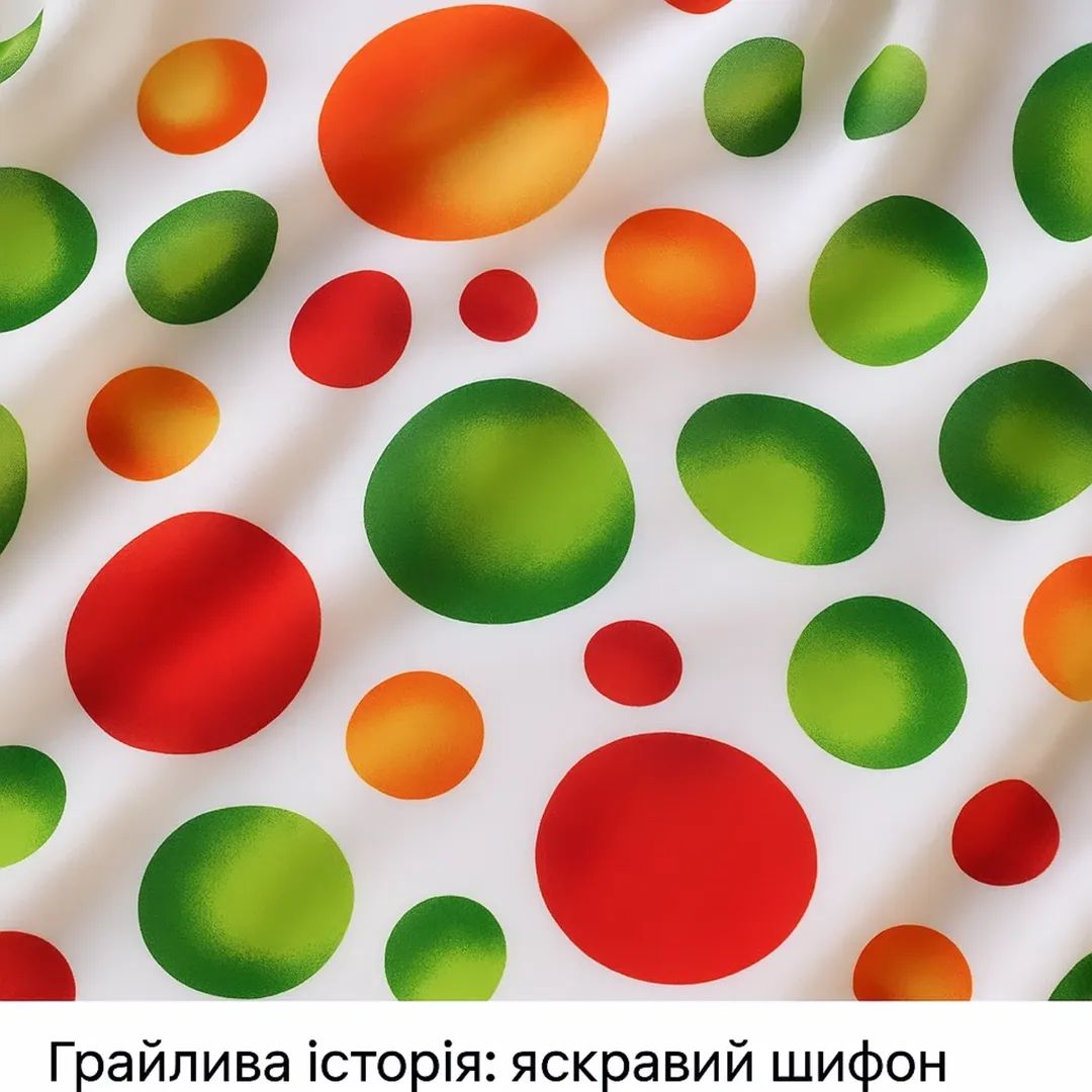 Цей шифон представлений у привабливому, насиченому молочному кольрі. Особливістю є принт у вигляді “горох”, який створює оригінальний, стильний акцент. Візуально малюнок нагадує шари , додаючи тканині унікальності та глибини. Завдяки комбінованому складу (віскоза та поліестер), тканина поєднує в собі переваги натуральних і синтетичних волокон, забезпечуючи хорошу драпіруємість та зносостійкість.