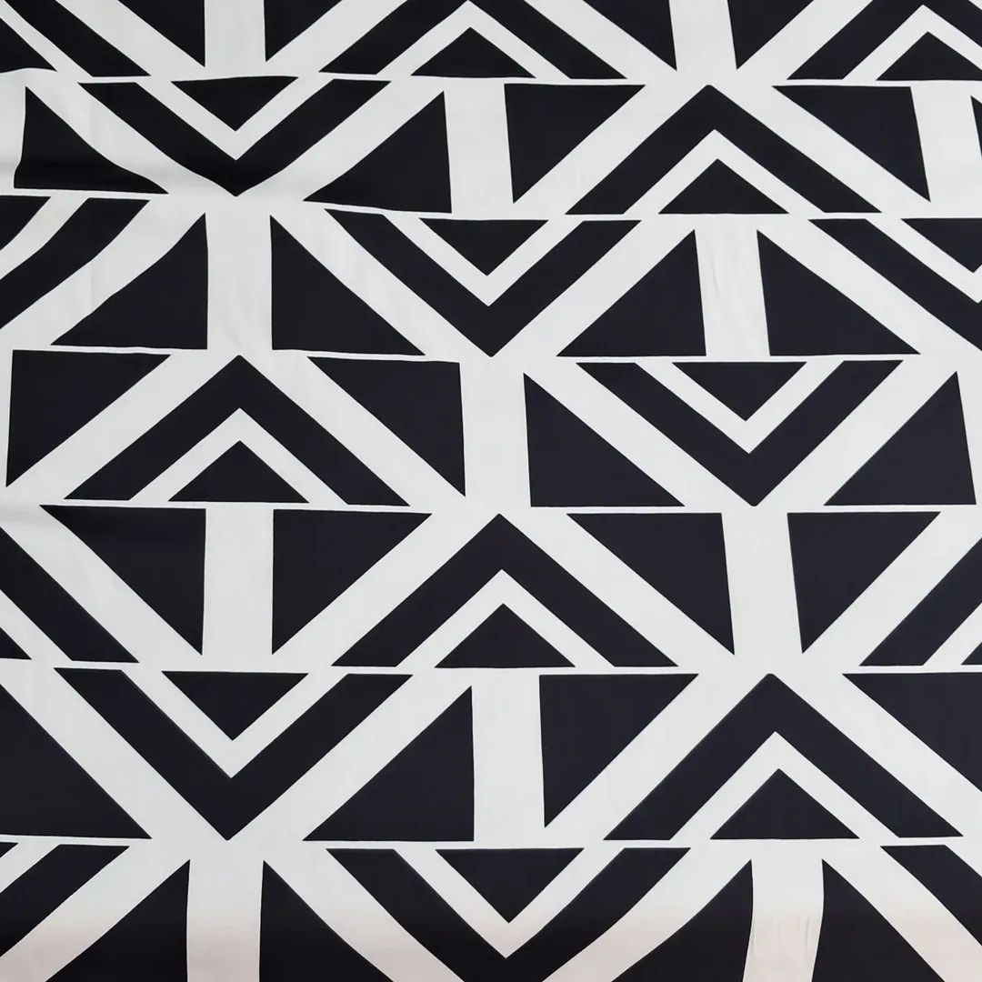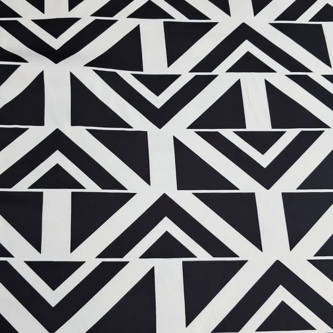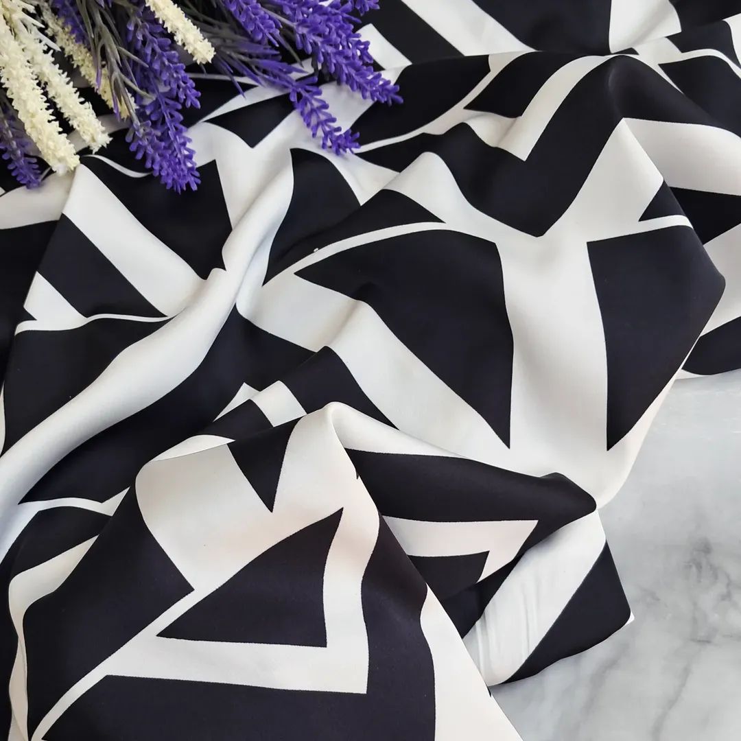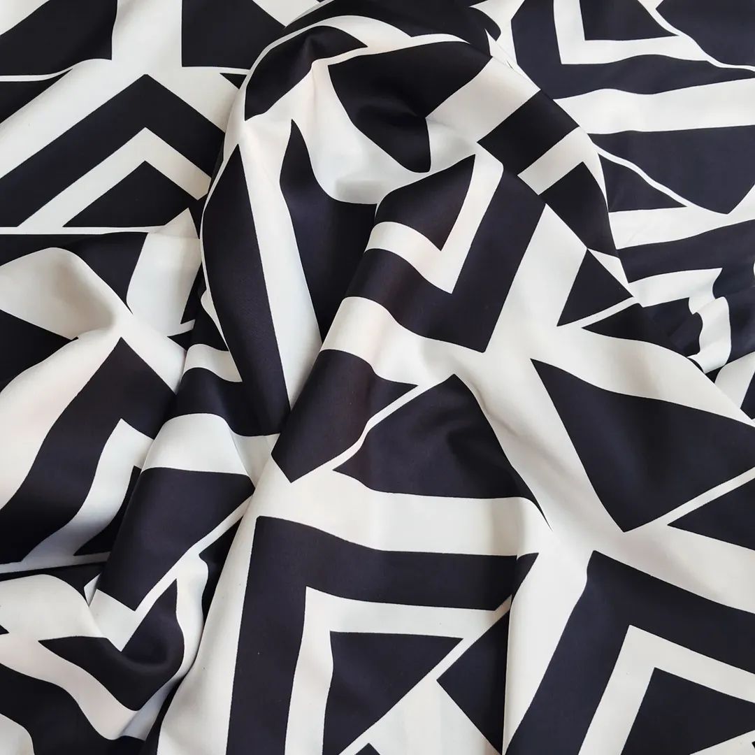 Це високоякісний стречевий шовк із гладкою, блискучою фактурою та елегантним геометричним принтом у вигляді ромбів. Тканина є вдалим поєднанням волокон: поліестер забезпечує міцність і зносостійкість, віскоза додає м’якості та гарного драпірування, а 3% спандексу (еластану) — високу еластичність.