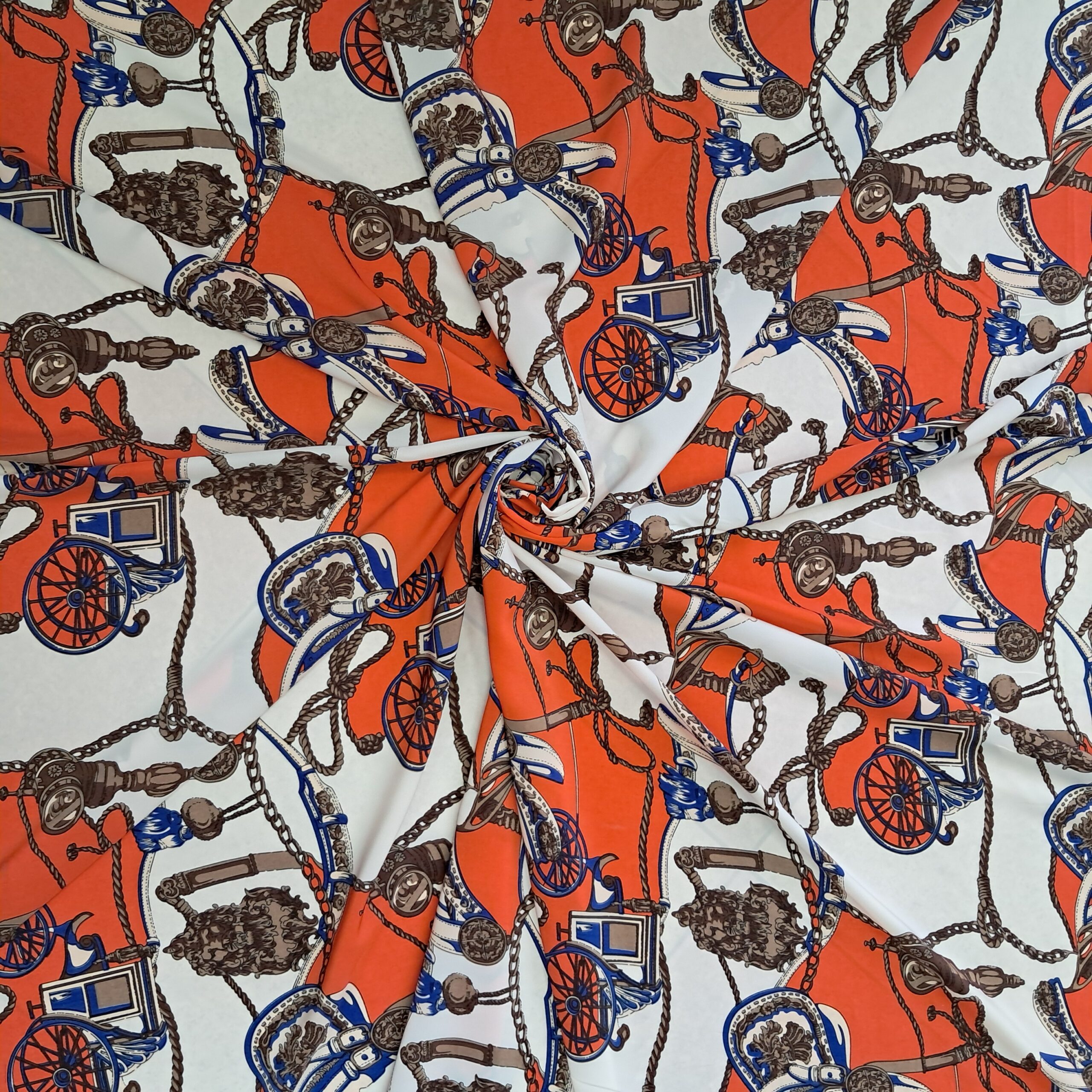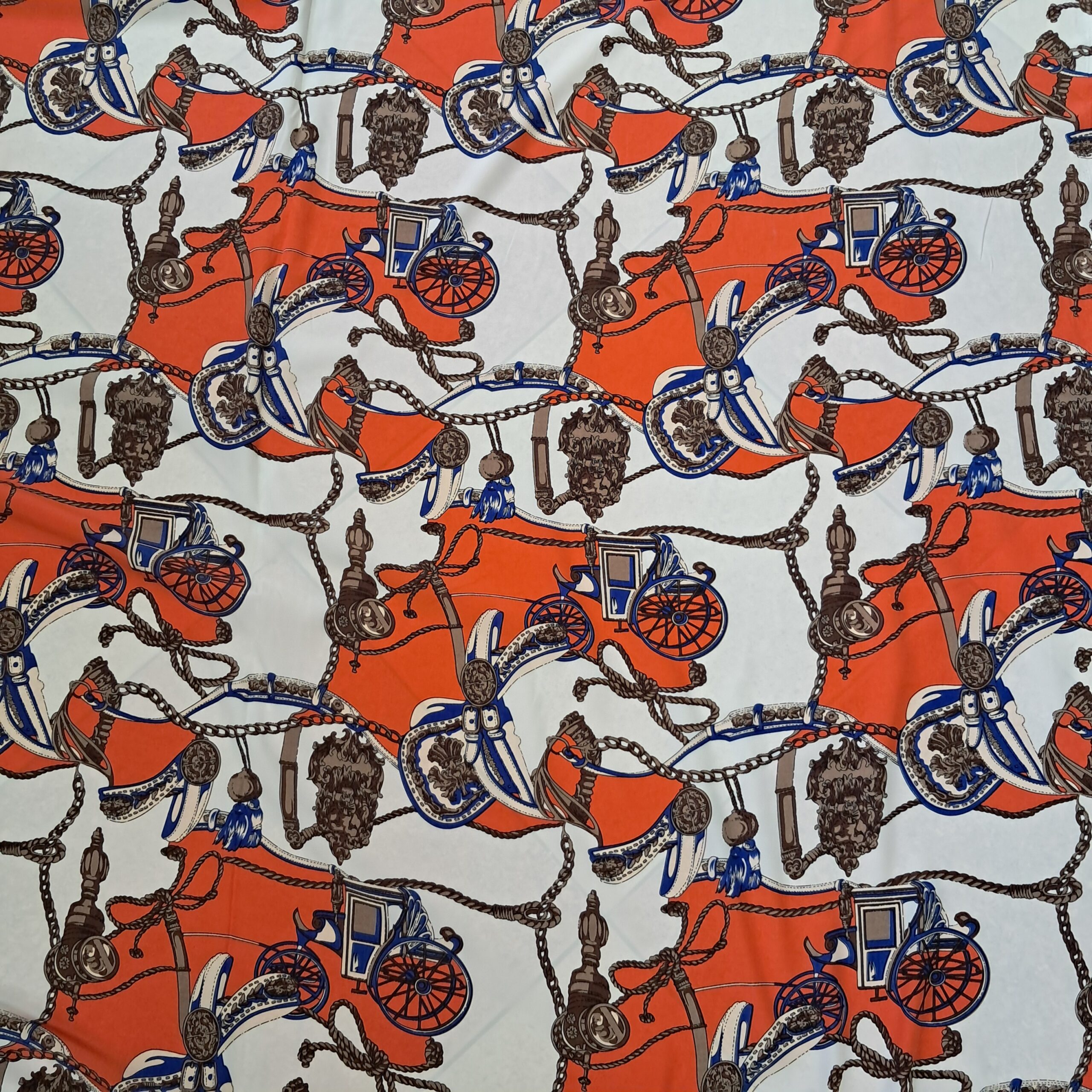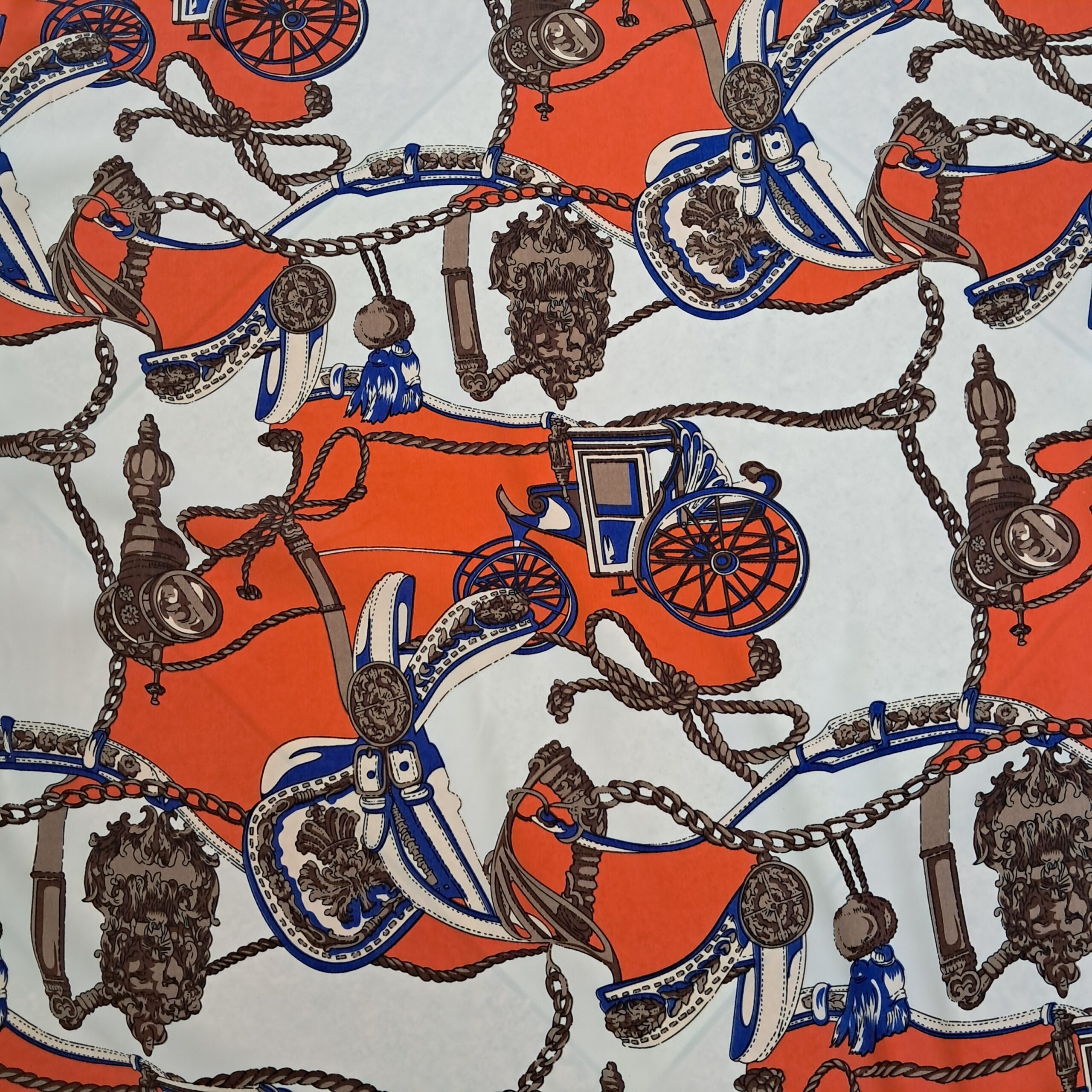 Розкіш у кожному русі тканини — шовк у стилі Hermès з витонченим каретним орнаментом у відтінках помаранчевого, молочного, білого, коричневого та синього. М’яка віскоза з домішкою поліестеру дарує ідеальну посадку, ніжний блиск і бездоганну драпірування. Ідеальний вибір для сукні, костюма чи аксесуара, який виглядатиме так, ніби щойно з подіуму.