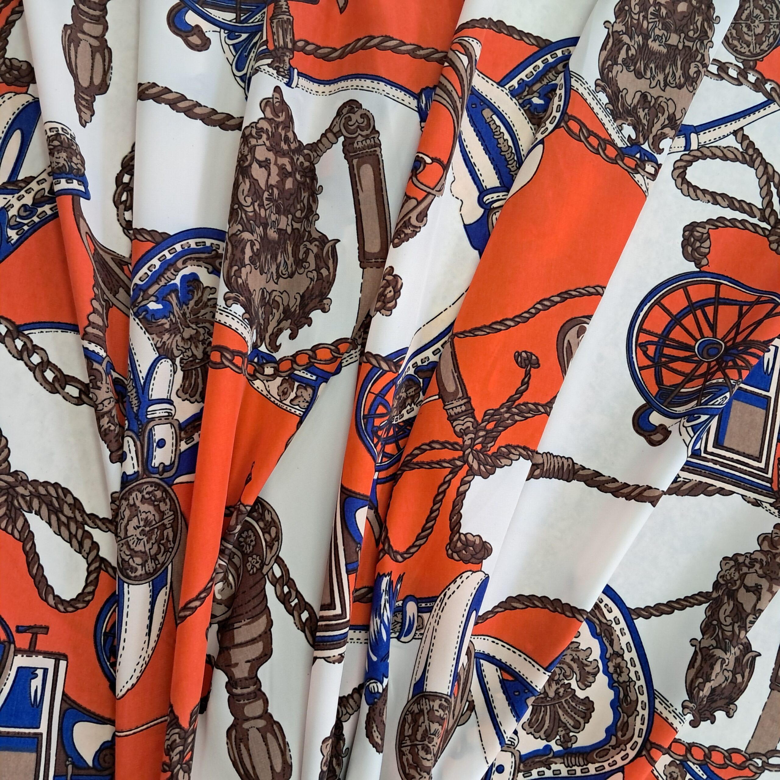 Шовк у стилі Hermès — елегантна та розкішна тканина з яскравим дизайнерським принтом, що нагадує вироби відомого французького дому моди. Орнамент включає карети, декоративні ремені, пряжки, канати, ланцюжки та інші деталі каретного декору. Візерунок виконаний у насичених відтінках синього, коричневого, помаранчевого та білого. Полотно гладке, приємне на дотик, із делікатним шовковистим блиском. Завдяки складу 80% віскози та 20% поліестеру тканина має природну м’якість, добре драпірується, не надто мнеться і зберігає гарний вигляд у виробах. Ширина полотна — 150 см, що робить його універсальним для пошиття одягу та аксесуарів.