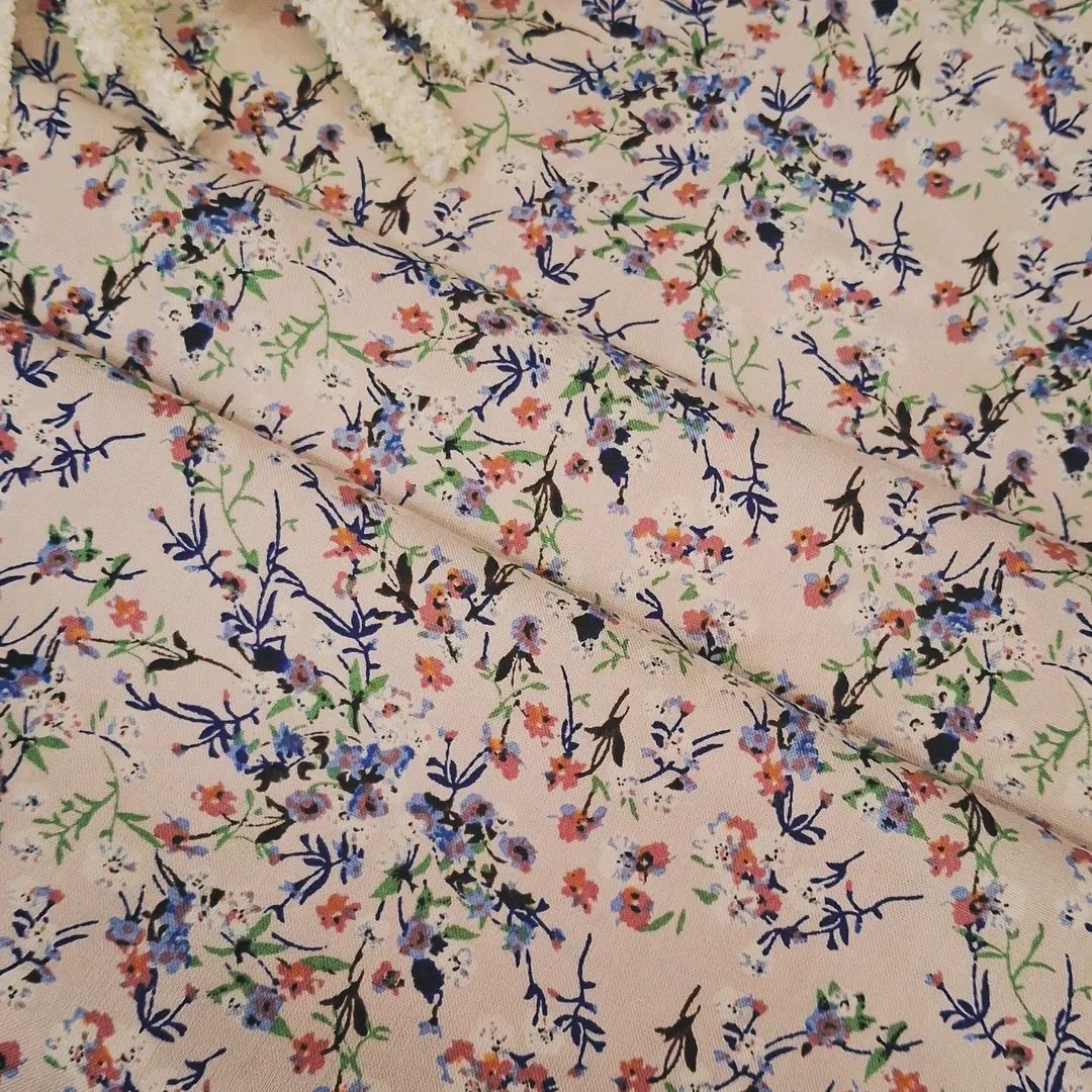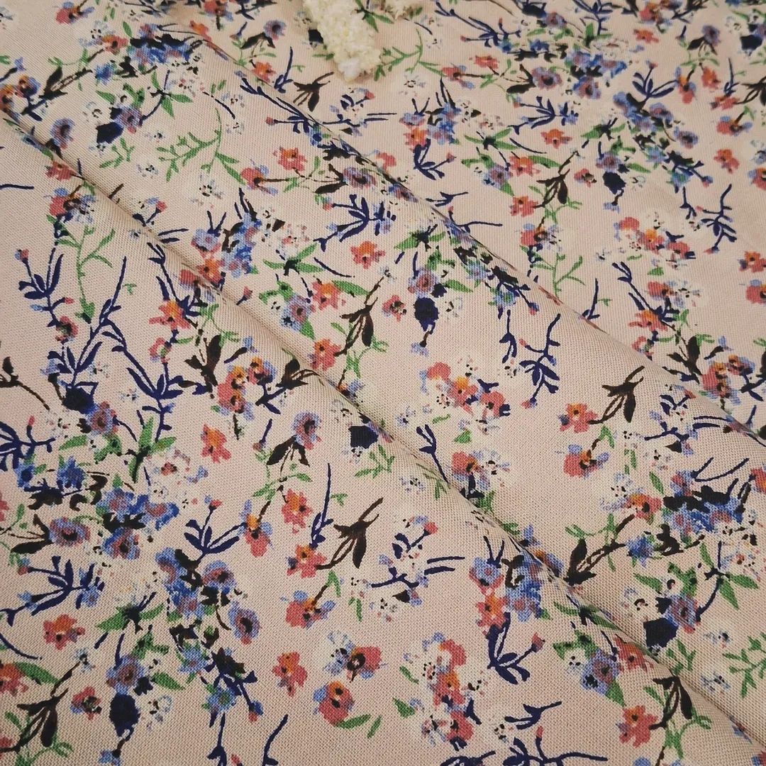 Штапель із дрібним квітковим візерунком на бежевому фоні — легка й дихаюча тканина, приємна до тіла, з м’яким природним блиском. Завдяки поєднанню волокон вона поєднує натуральність і практичність, зберігаючи гарний вигляд у носінні. Маленькі квіточки на ніжній основі створюють романтичний та водночас універсальний образ.