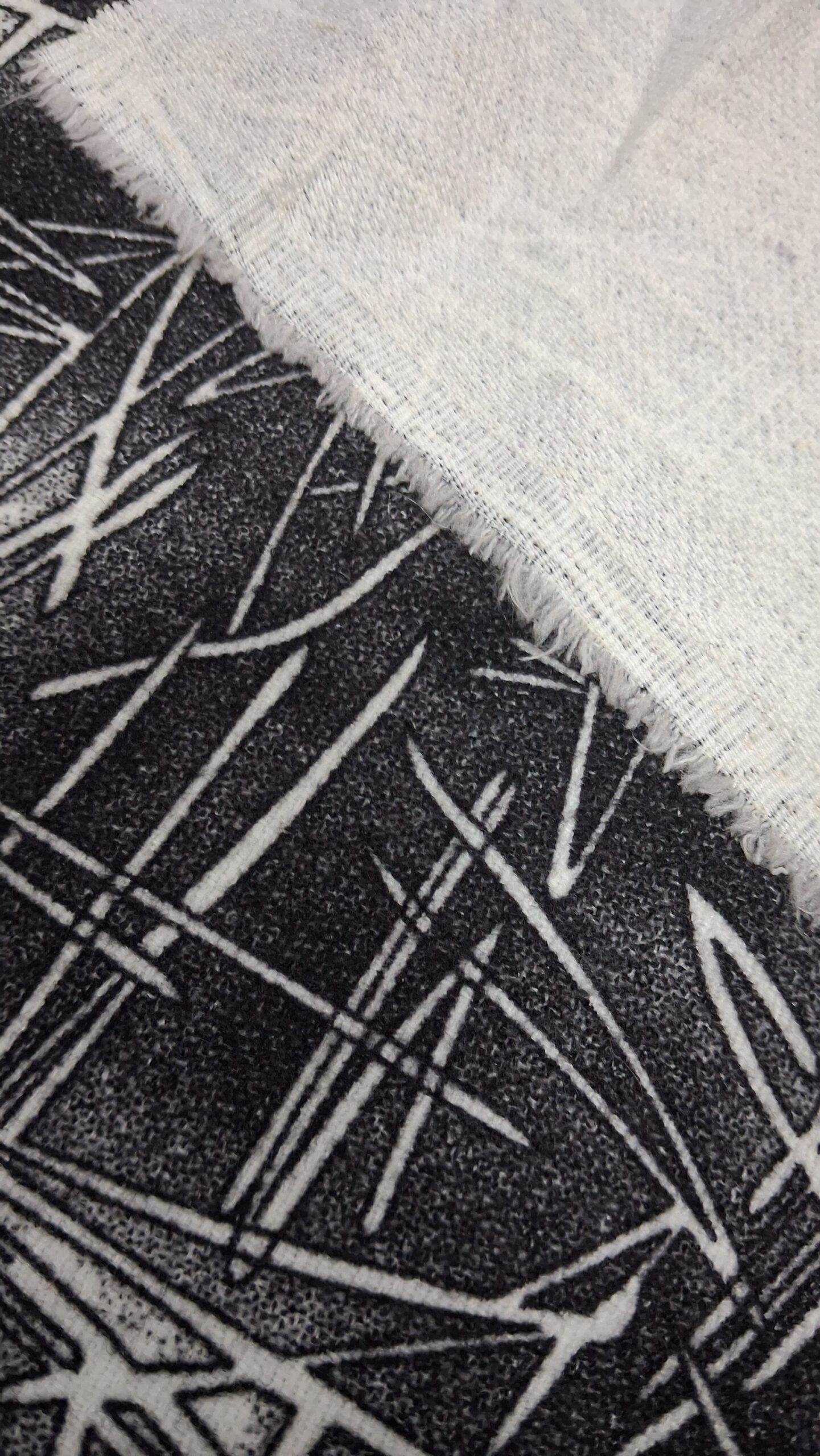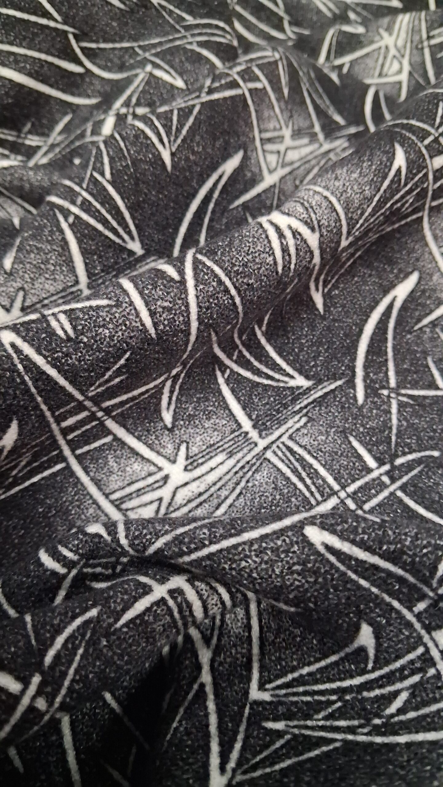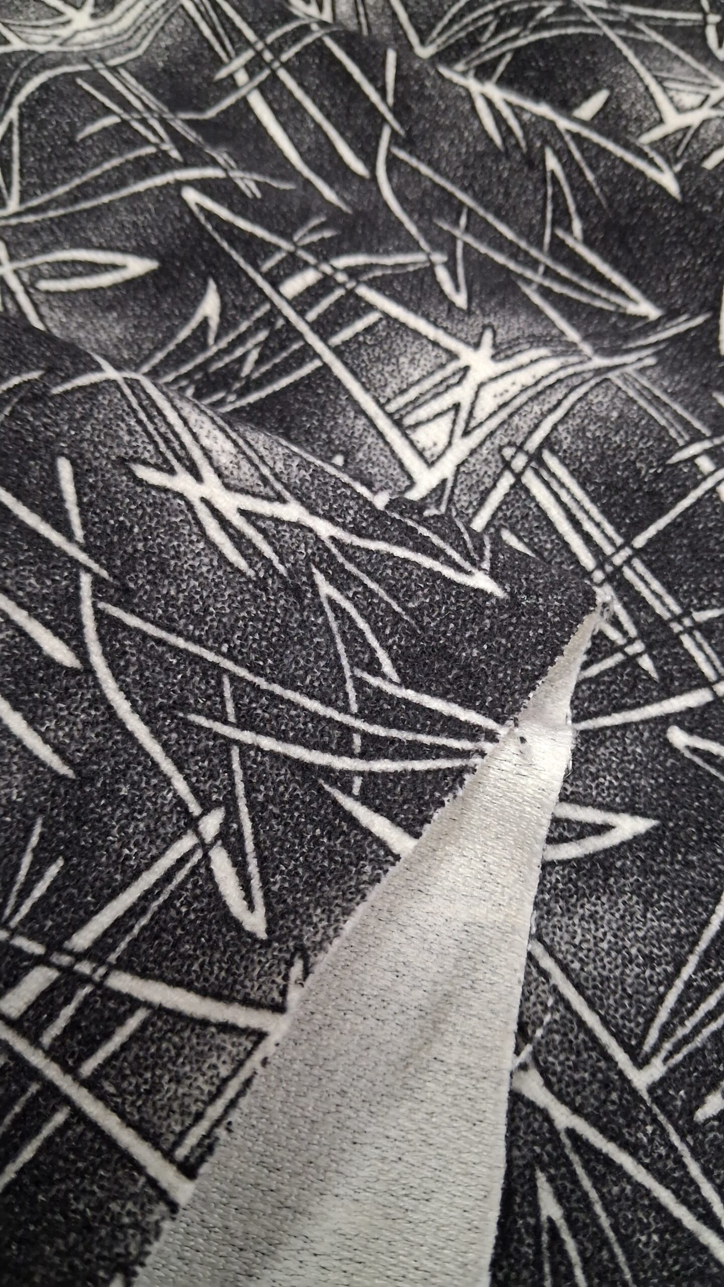 Стильний, формостійкий матеріал, який ідеально поєднує сучасний дизайн та практичність. Лицьовий бік прикрашає динамічний чорно-білий принт у вигляді хаотичних штрихів на темному фоні, що створює ефектну абстракцію та візуально нагадує фактуру в’язаного полотна.